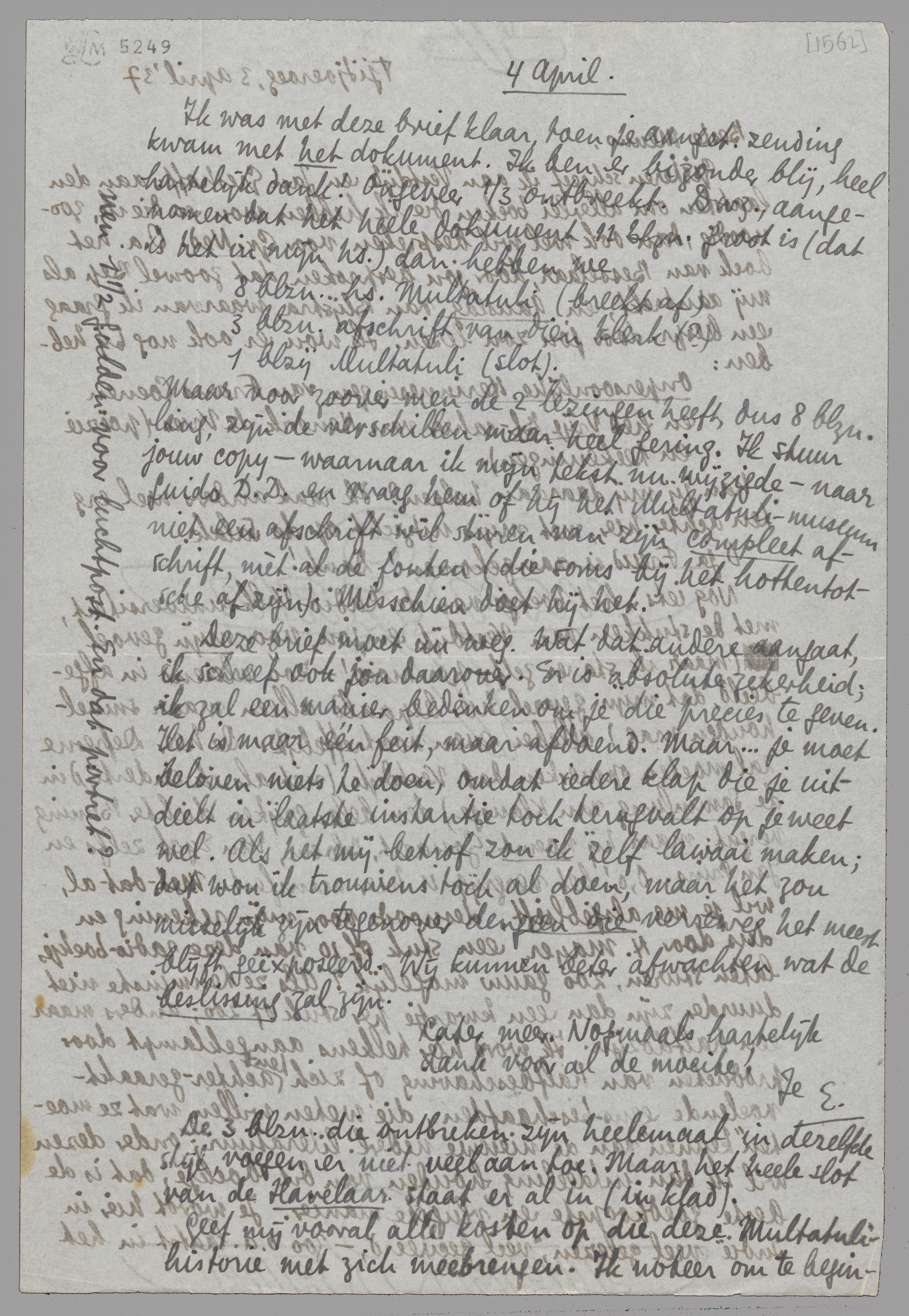 Maar voor zoover men de 2 lezingen heeft, dus 8 blzn. lang, zijn de verschillen maar heel gering. Ik stuur jouw copy - waarnaar ik mijn tekst nu wijzigde - naar Guido D.D. en vraag hem of hij het Multatuli-museum niet een afschrift wil sturen van zijn compleet afschrift, mèt al de fouten (die soms bij het hottentotsche af zijn). Misschien doet hij het.