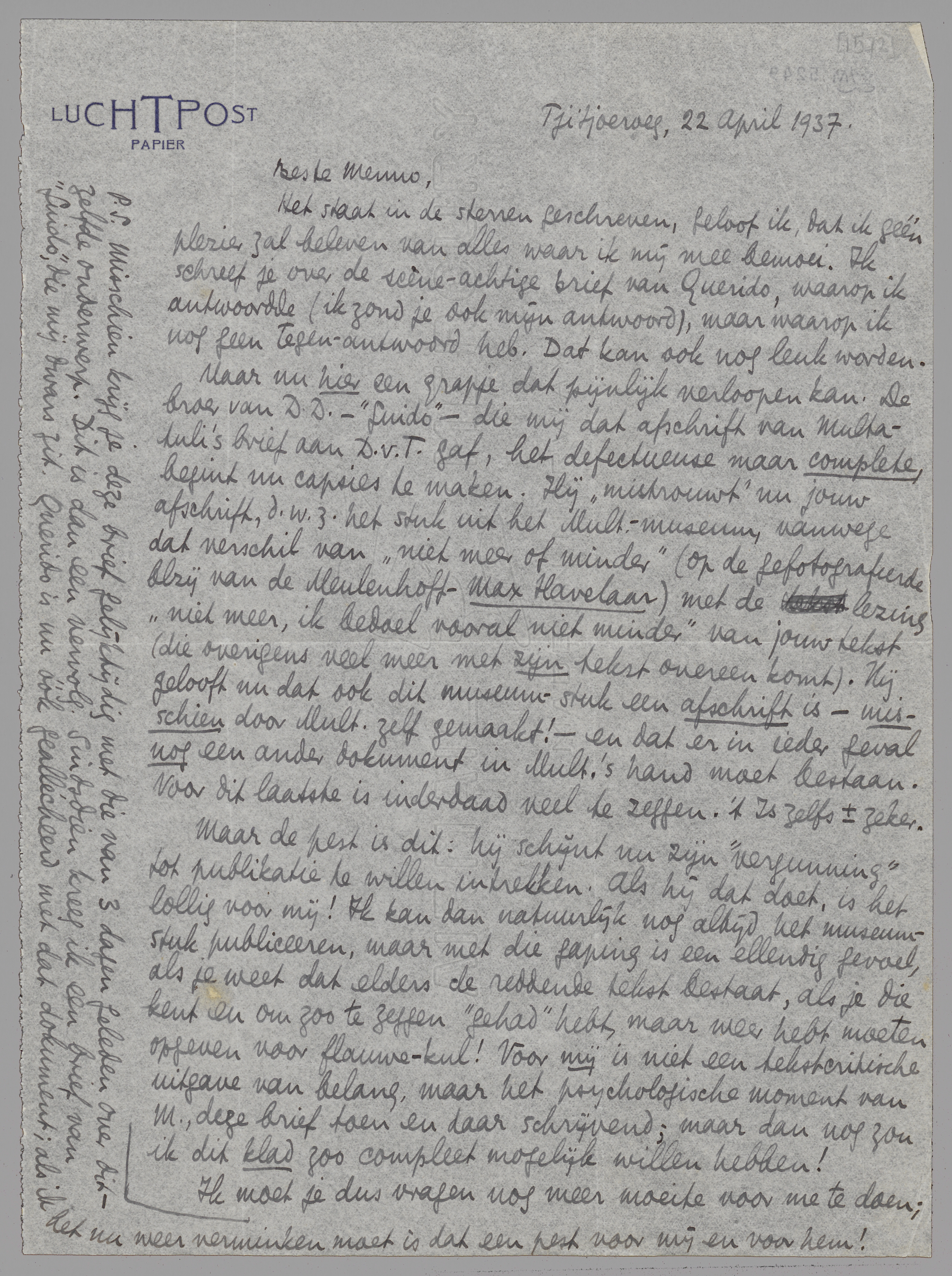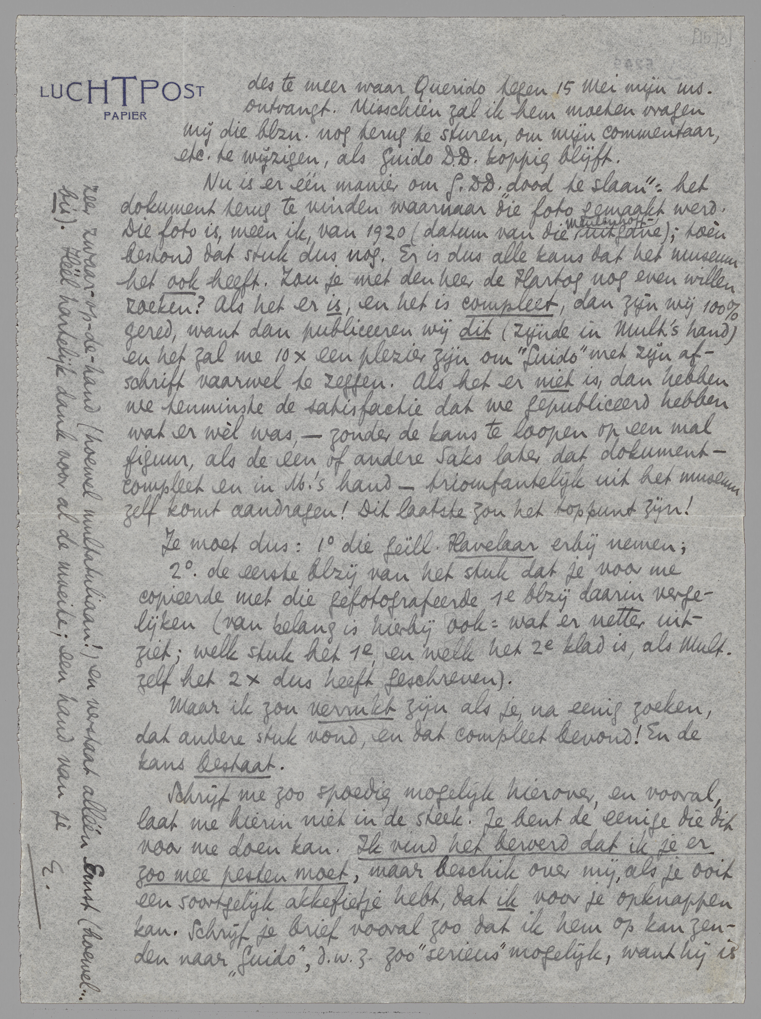 Nu is er één manier om G. DD. ‘dood te slaan’: het dokument terug te vinden waarnaar die foto gemaakt werd. Die foto is, meen ik, van 1920 (datum van die Meulenhoff-uitgave); toèn bestond dat stuk dus nog. Er is dus alle kans dat het museum het ook heeft. Zou je met den heer de Hartog nog even willen zoeken? Als het er is, en het is compleet, dan zijn wij 100% gered, want dan publiceeren wij dit (zijnde in Mult's hand) en het zal me 10 × een plezier zijn om ‘Guido’ met zijn afschrift vaarwel te zeggen. Als het er niet is, dan hebben we tenminste de satisfactie dat we gepubliceerd hebben wat er wèl was, - zonder de kans te loopen op een mal figuur, als de een of andere Saks later dat dokument - compleet en in M.'s hand - triomfantelijk uit het museum zelf komt aandragen! Dit laatste zou het toppunt zijn!