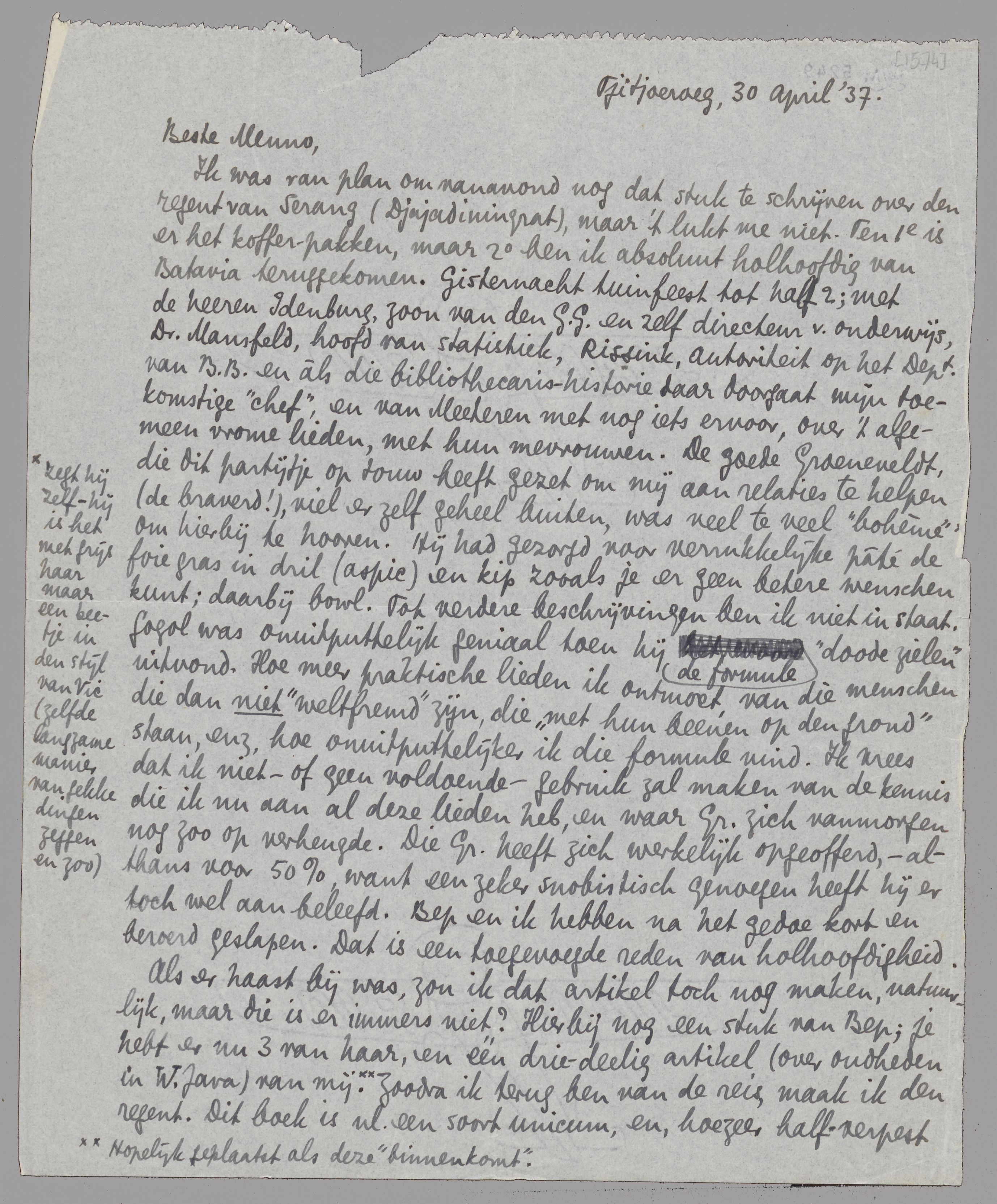 Ik was van plan om vanavond nog dat stuk te schrijven over den regent van Serang (Djajadiningrat), maar 't lukt me niet. Ten 1o is er het koffer-pakken, maar 2o ben ik absoluut holhoofdig van Batavia teruggekomen. Gisternacht tuinfeest tot half 2; met de heeren Idenburg, zoon van den G.G. en zelf directeur v. onderwijs, Dr. Mansfeld, hoofd van statistiek, Rissink, autoriteit op het Dept. van B.B. en àls die bibliothecaris-historie daar doorgaat mijn toekomstige ‘chef’, en van Meeteren met nog iets ervoor, over 't algemeen vrome lieden, met hun mevrouwen. De goede Groeneveldt, die dit partijtje op touw heeft gezet om mij aan relaties te helpen (de braverd!), viel er zelf geheel buiten, was veel te veel ‘bohème’ [zegt hij zelf - hij is het met grijs haar maar een beetje in den stijl van Vic (zelfde langzame manier van gekke dingen zeggen en zoo)] om hierbij te hooren. Hij had gezorgd voor verrukkelijke pâté de foie gras in dril (aspic) en kip zooals je er geen betere wenschen kunt; daarbij bowl. Tot verdere beschrijvingen ben ik niet in staat. Gogol was onuitputtelijk geniaal toen hij de formule ‘doode zielen’ uitvond. Hoe meer praktische lieden ik ontmoet, van die menschen die dan niet ‘weltfremd’ zijn, die ‘met hun beenen op den grond’ staan, enz., hoe onuitputtelijker ik die formule vind. Ik vrees dat ik niet - of geen voldoende - gebruik zal maken van de kennis die ik nu aan al deze lieden heb, en waar Gr. zich vanmorgen nog zoo op verheugde. Die Gr. heeft zich werkelijk opgeofferd, - althans voor 50%, want een zeker snobistisch genoegen heeft hij er toch wel aan beleefd. Bep en ik hebben na het gedoe kort en beroerd geslapen. Dat is een toegevoegde reden van holhoofdigheid.
