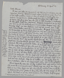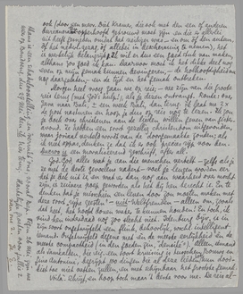 Als er haast bij was, zou ik dat artikel toch nog maken, natuurlijk, maar die is er immers niet? Hierbij nog een stuk van Bep; je hebt er nu 3 van haar, en één drie-deelig artikel (over oudheden in W. Java) van mij. [Hopelijk geplaatst als deze ‘binnenkomt’.] Zoodra ik terug ben van de reis, maak ik den regent. Dit boek is nl. een soort unicum, en, hoezeer half-verpest ook (door een mevr. Diet Kramer, die ook met den een of anderen bureaucraten-opperhoofd getrouwd moet zijn en die er allerlei uit heeft gesneden omdat dat veiliger was - en om òf den auteur, òf het nederl. gezag, òf allebei in bescherming te nemen), het is werkelijk belangrijk. Ik wil er dus een goed stuk van maken, althans zoo goed ik kan. Daarvoor moet ik het dikke deel nog even op mijn gemak kunnen bevingeren, - de holhoofdigheid nu nog daargelaten, - en de tijd en het gemak ontbreken.