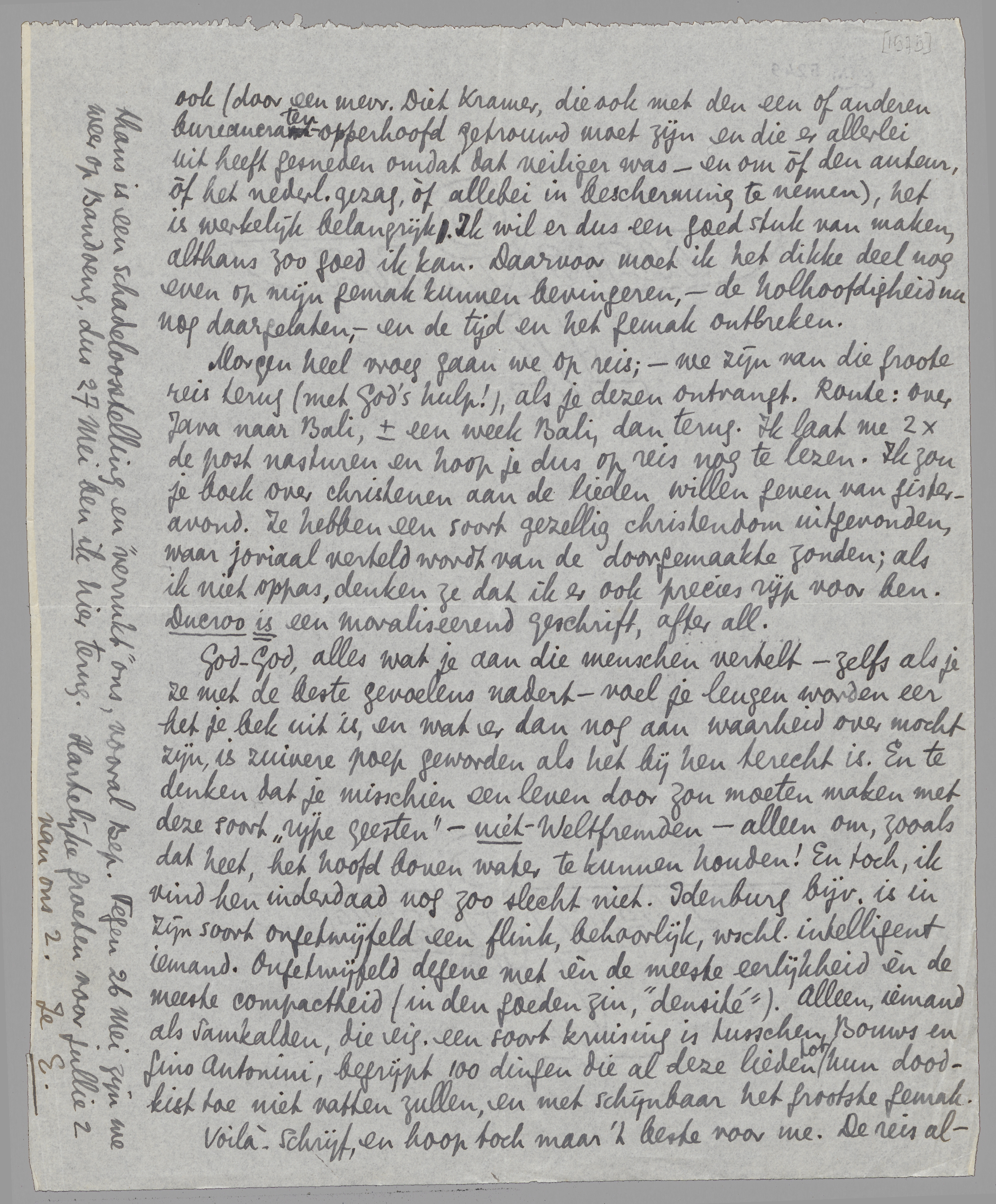 Morgen heel vroeg gaan we op reis; - we zijn van die groote reis terug (met God's hulp!), als je dezen ontvangt. Route: over Java naar Bali, ± een week Bali, dan terug. Ik laat me 2 × de post nasturen en hoop je dus op reis nog te lezen. Ik zou je boek over christenen aan de lieden willen geven van gisteravond. Ze hebben een soort gezellig christendom uitgevonden, waar joviaal verteld wordt van de doorgemaakte zonden; als ik niet oppas, denken ze dat ik er ook precies rijp voor ben. Ducroo is een moraliseerend geschrift, after all.