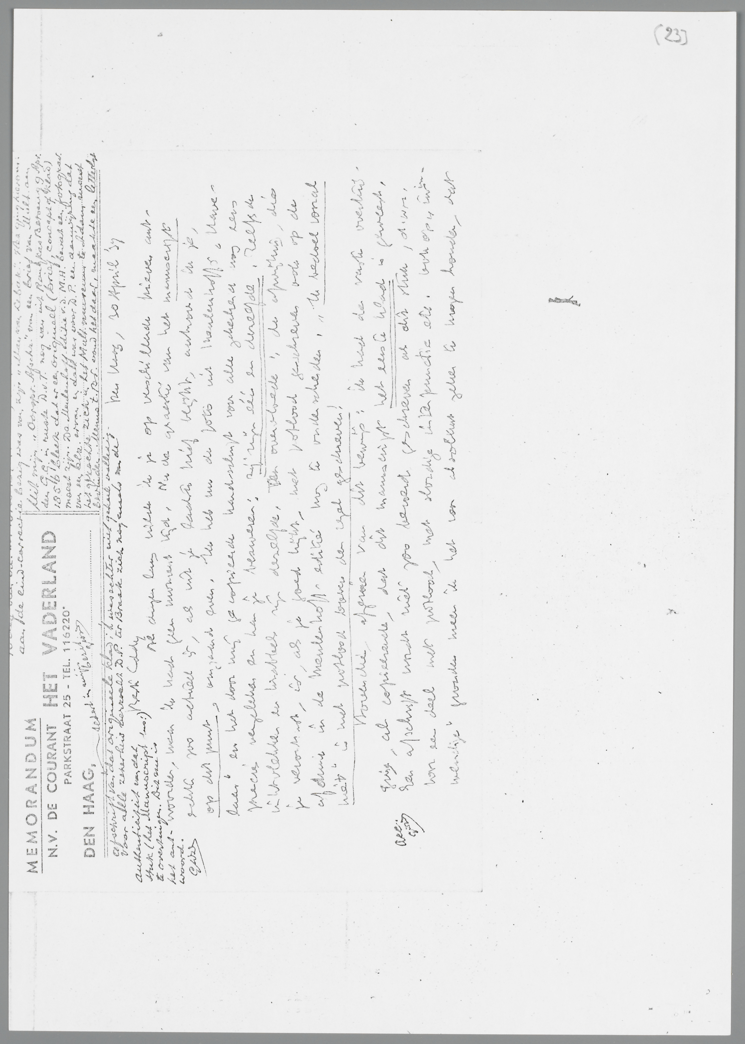 Al dagen lang wilde ik je op verschillende brieven antwoorden, maar ik had geen moment tijd. Nu de quaestie van het manuscript echter zoo actueel is, als uit je laatste brief blijkt, antwoord ik je, op dit punt, even. Ik heb nu de foto uit Meulenhoff’s Havelaar en het door mij gecopieerde handschrift voor alle zekerheid nog eens precies vergeleken, en kan je bezweren: zij zijn één en dezelfde. Zelfs de inktvlekken en krabbels zijn dezelfde. Ten overvloede: de afwijking, die je verontrust, is, als je goed kijkt, ook op de afdruk in de Meulenhoff-editie nog te onderscheiden. ‘Ik bedoel vooral niet’ is met potlood boven de regel geschreven!