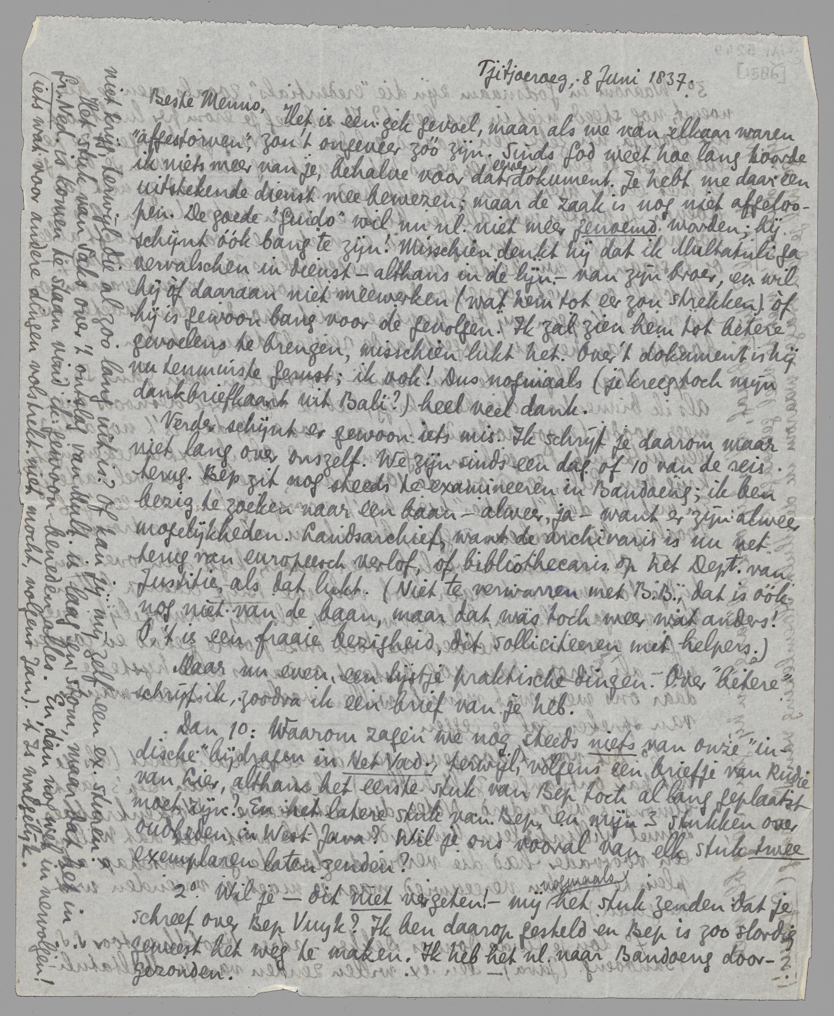 Verder schijnt er gewoon iets mis. Ik schrijf je daarom maar niet lang over ons zelf. We zijn sinds een dag of 10 van de reis terug. Bep zit nog steeds te examineeren in Bandoeng; ik ben bezig te zoeken naar een baan - alweer, ja - want er zijn alweer mogelijkheden. Landsarchief, want de archivaris is nu net terug van europeesch verlof, of bibliothecaris op het Dept. van Justitie, als dat lukt. (Niet te verwarren met B.B., dat is óók nog niet van de baan, maar dat was toch weer wat anders! O, 't is een fraaie bezigheid, dit solliciteeren met helpers.)