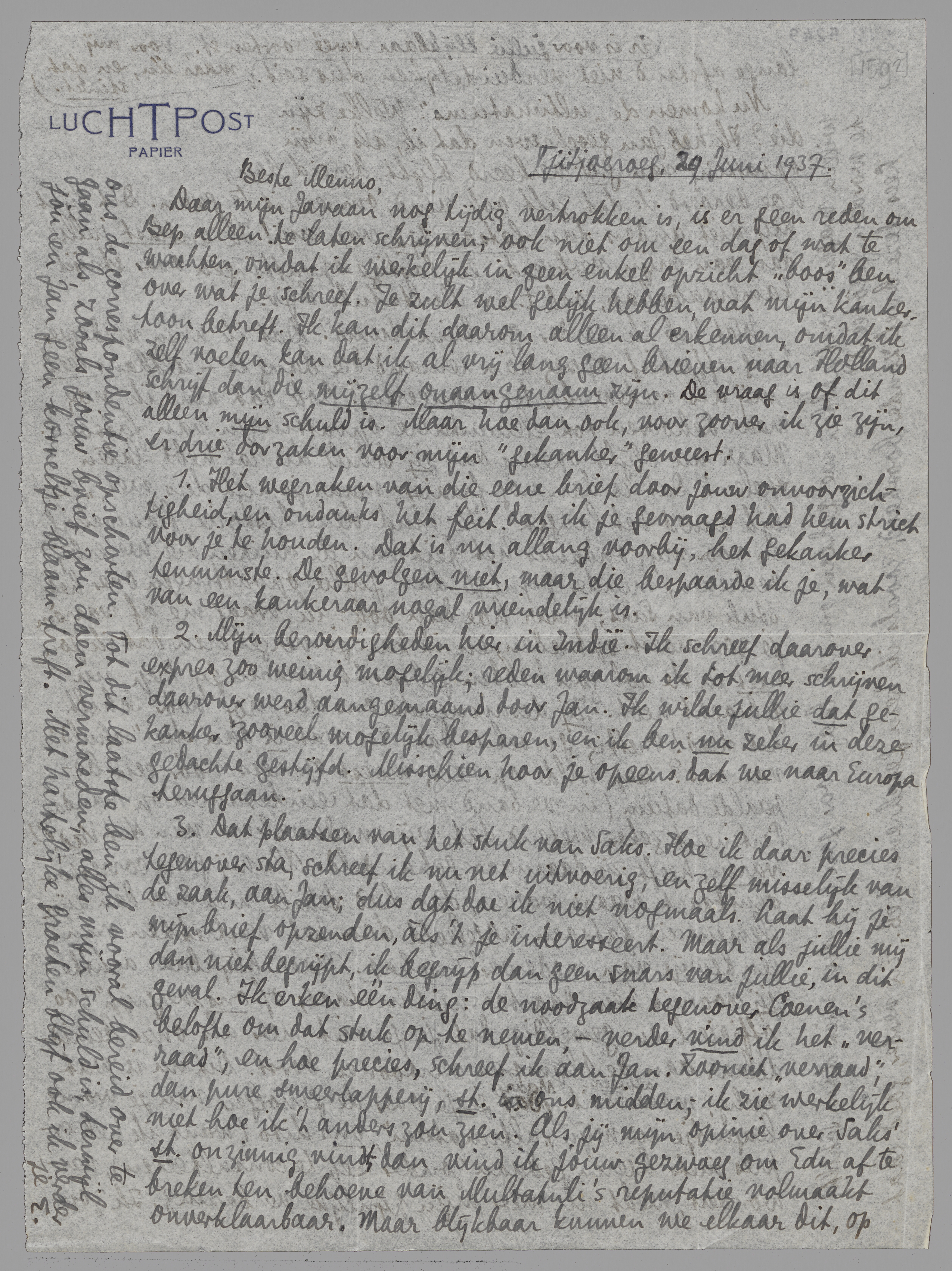 1. Het wegraken van die eene brief door jouw onvoorzichtigheid, en ondanks het feit dat ik je gevraagd had hem strict voor je te houden. Dat is nu allang voorbij, het gekanker tenminste. De gevolgen niet, maar die bespaarde ik je, wat van een kankeraar nogal vriendelijk is.
