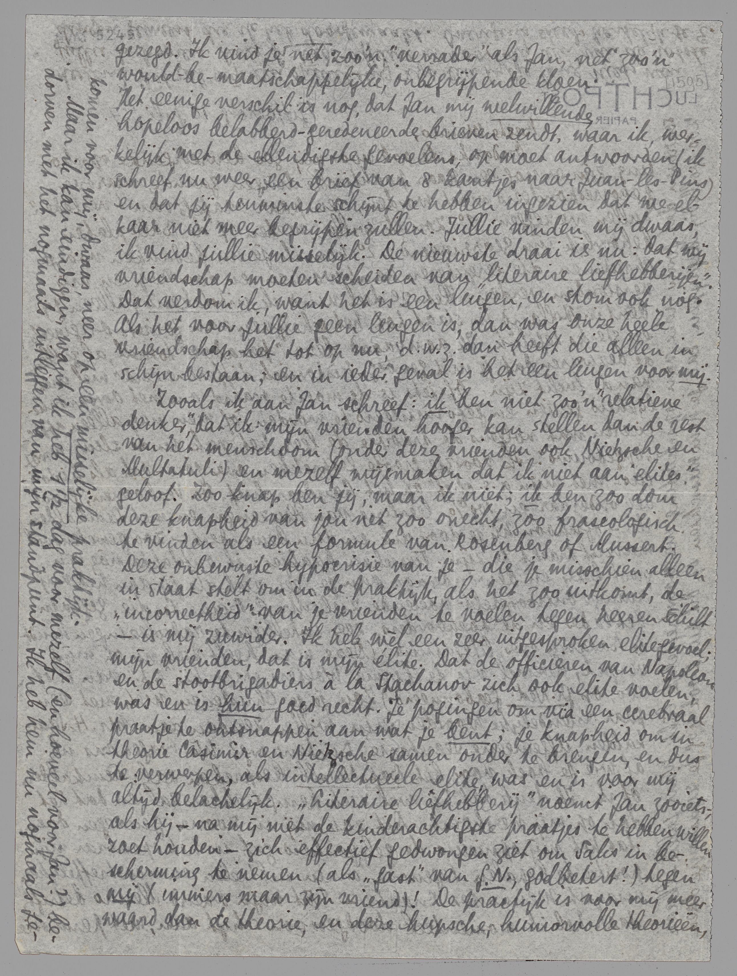 Het eenige verschil is nog, dat Jan mij welwillende, hopeloos belabberd-geredeneerde brieven zendt, waar ik, werkelijk met de ellendigste gevoelens, op moet antwoorden (ik schreef nu weer een brief van 8 kantjes naar Juan-les-Pins) en dat jij tenminste schijnt te hebben ingezien dat we elkaar niet meer begrijpen zullen. Jullie vinden mij dwaas, ik vind jullie misselijk. De nieuwste draai is nu: dat wij vriendschap moeten scheiden van ‘literaire liefhebberijen’. Dat verdom ik, want het is een leugen, en stom ook nog. Als het voor jullie geen leugen is, dan was onze heele vriendschap het tot op nu, d.w.z. dan heeft die alleen in schijn bestaan; en in ieder geval is het een leugen voor mij.