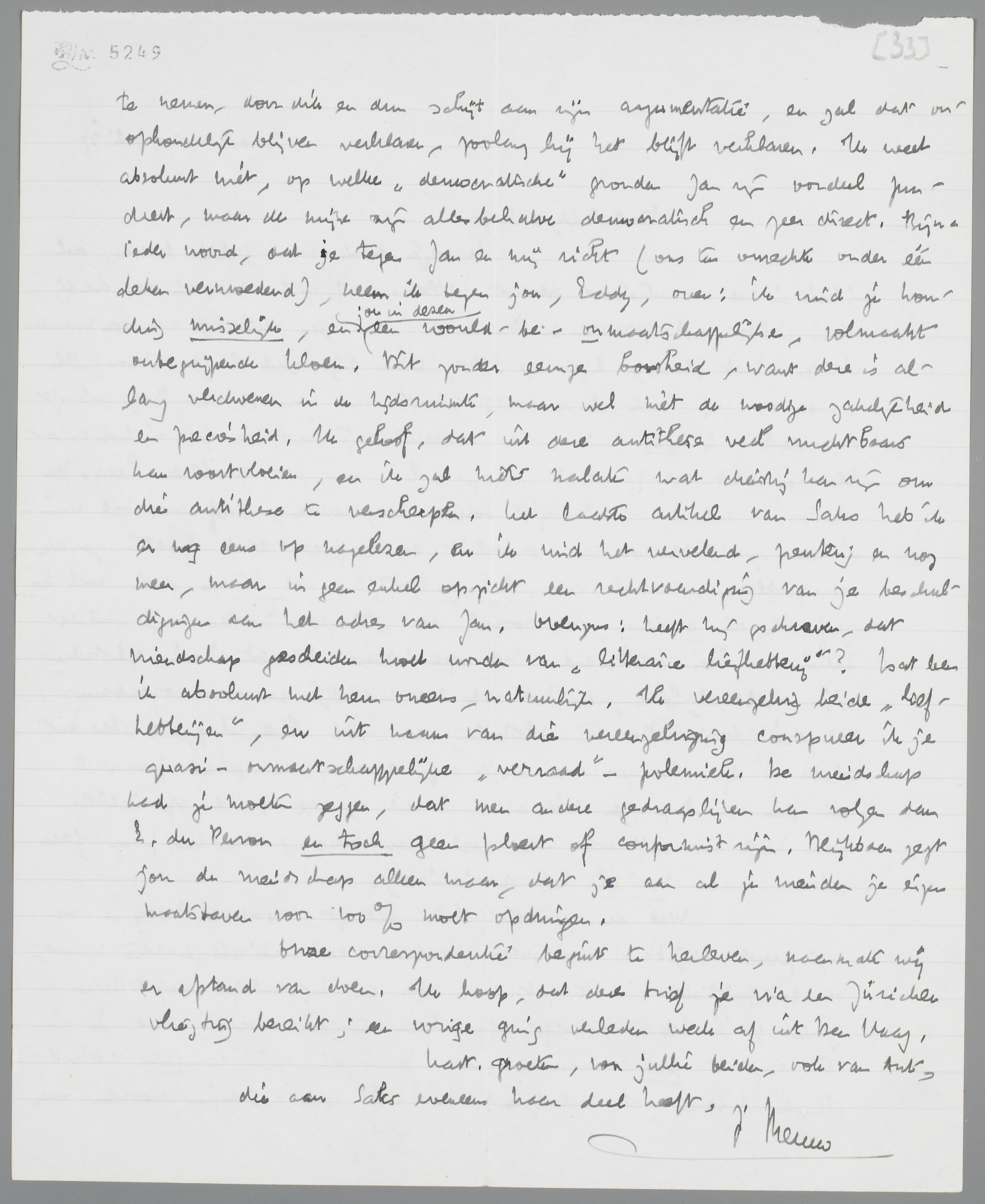 Wat de quaestie Saks betreft, waarvan Eddy - voor zijn gevoel blijkbaar op goede gronden - een kabinetsquaestie maakt, om een politieke term te gebruiken voor een bij uitstek onpolitieke zaak: ik heb er behoefte aan hem te antwoorden, dat ik in dit opzicht geen concurrent van Jan zal zijn en geen welwillende brieven zal schrijven. Ik heb, om zijn eigen woorden over te nemen, door dik en dun schijt aan zijn argumentatie, en zal dat onophoudelijk blijven verklaren, zoolang hij het blijft verklaren. Ik weet absoluut niet, op welke ‘democratische’ gronden Jan zijn oordeel fundeert, maar de mijne zijn allesbehalve democratisch en zeer direct. Bijna ieder woord, dat je tegen Jan en mij richt (ons ten onrechte onder één deken vermoedend), neem ik tegen jou, Eddy, over: ik vind je houding misselijk, en jou in dezen een would-be-onmaatschappelijke, volmaakt onbegrijpende kloen. Dit zonder eenige boosheid, want deze is allang verdwenen in de tijdsruimte, maar wel met de noodige zakelijkheid en preciesheid. Ik geloof, dat uit deze antithese veel vruchtbaars kan voortvloeien, en ik zal niets nalaten wat dienstig kan zijn om die antithese te verscherpen. Het laatste artikel van Saks heb ik er nog eens op nagelezen, en ik vind het vervelend, peuterig en nog meer, maar in geen enkel opzicht een rechtvaardiging van je beschuldigingen aan het adres van Jan. Overigens: heeft hij geschreven, dat vriendschap gescheiden moet worden van ‘litteraire liefhebberij’? Dat ben ik absoluut met hem oneens, natuurlijk. Ik vereenzelvig beide ‘liefhebberijen’, en uit naam van die vereenzelviging conspueer ik je quasi-onmaatschappelijke ‘verraad’-polemiek. De vriendschap had je moeten zeggen, dat men andere gedragslijnen kan volgen dan E. du Perron en toch geen ploert of conformist zijn. Blijkbaar zegt jou de vriendschap alleen maar, dat je aan al je vrienden je eigen maatstaven voor 100% moet opdringen.