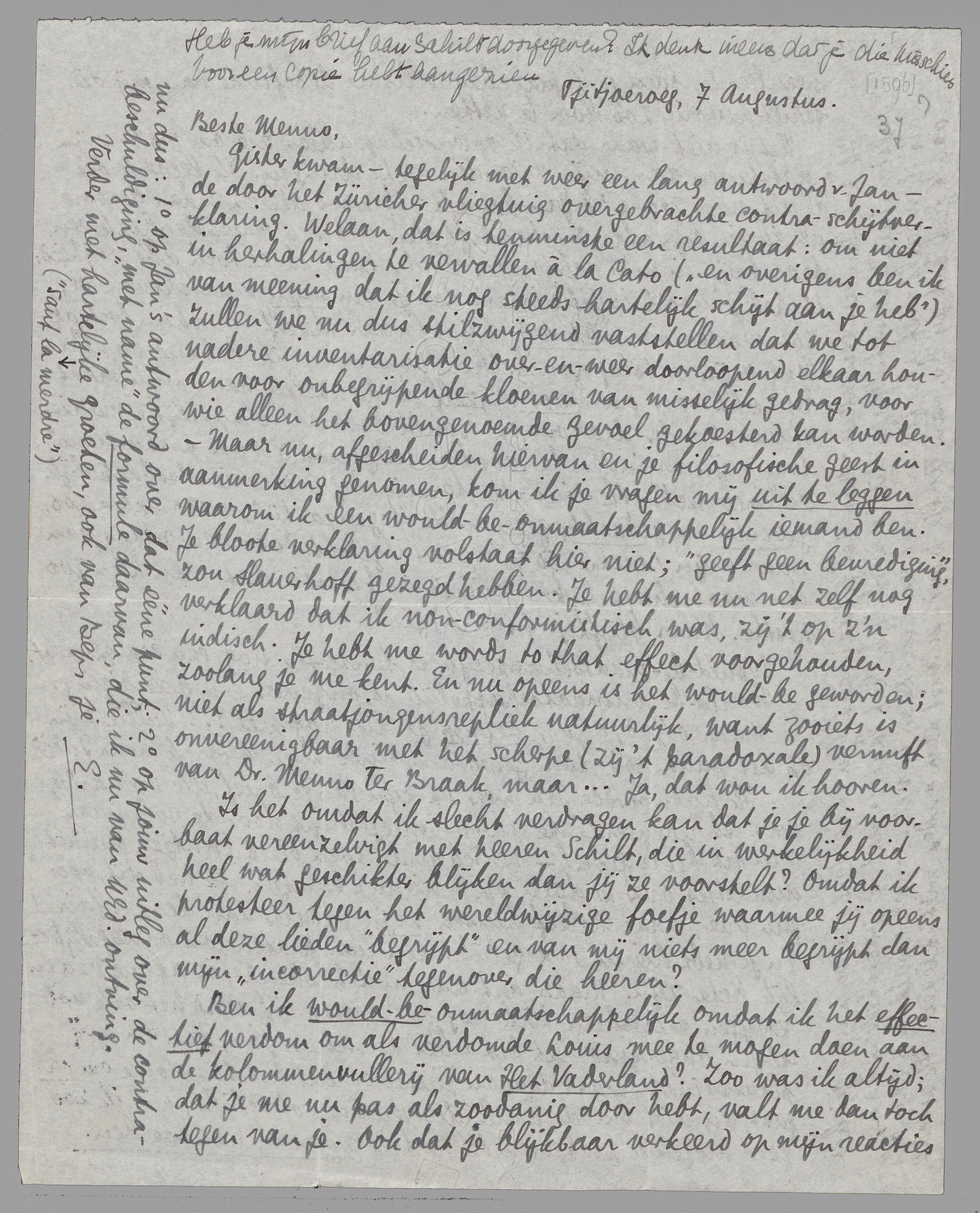 Gister kwam - tegelijk met weer een lang antwoord v. Jan - de door het Züricher vliegtuig overgebrachte contra-schijtverklaring. Welaan, dat is tenminste een resultaat: om niet in herhalingen te vervallen à la Cato (‘en overigens ben ik van meening dat ik nog steeds hartelijk schijt aan je heb’) zullen we nu dus stilzwijgend vaststellen dat we tot nadere inventarisatie over-en-weer doorloopend elkaar houden voor onbegrijpende kloenen van misselijk gedrag, voor wie alleen het bovengenoemde gevoel gekoesterd kan worden. - Maar nu, afgescheiden hiervan en je filosofische geest in aanmerking genomen, kom ik je vragen mij uit te leggen waarom ik een would-be-onmaatschappelijk iemand ben. Je bloote verklaring volstaat hier niet; ‘geeft geen bevrediging’, zou Slauerhoff gezegd hebben. Je hebt me nu net zelf nog verklaard dat ik non-conformistisch was, zij 't op z'n indisch. Je hebt me words to that effect voorgehouden, zoolang je me kent. En nu opeens is het would-be geworden; niet als straatjongensrepliek natuurlijk, want zooiets is onvereenigbaar met het scherpe (zij 't paradoxale) vernuft van Dr. Menno ter Braak, maar... Ja, dat wou ik hooren.