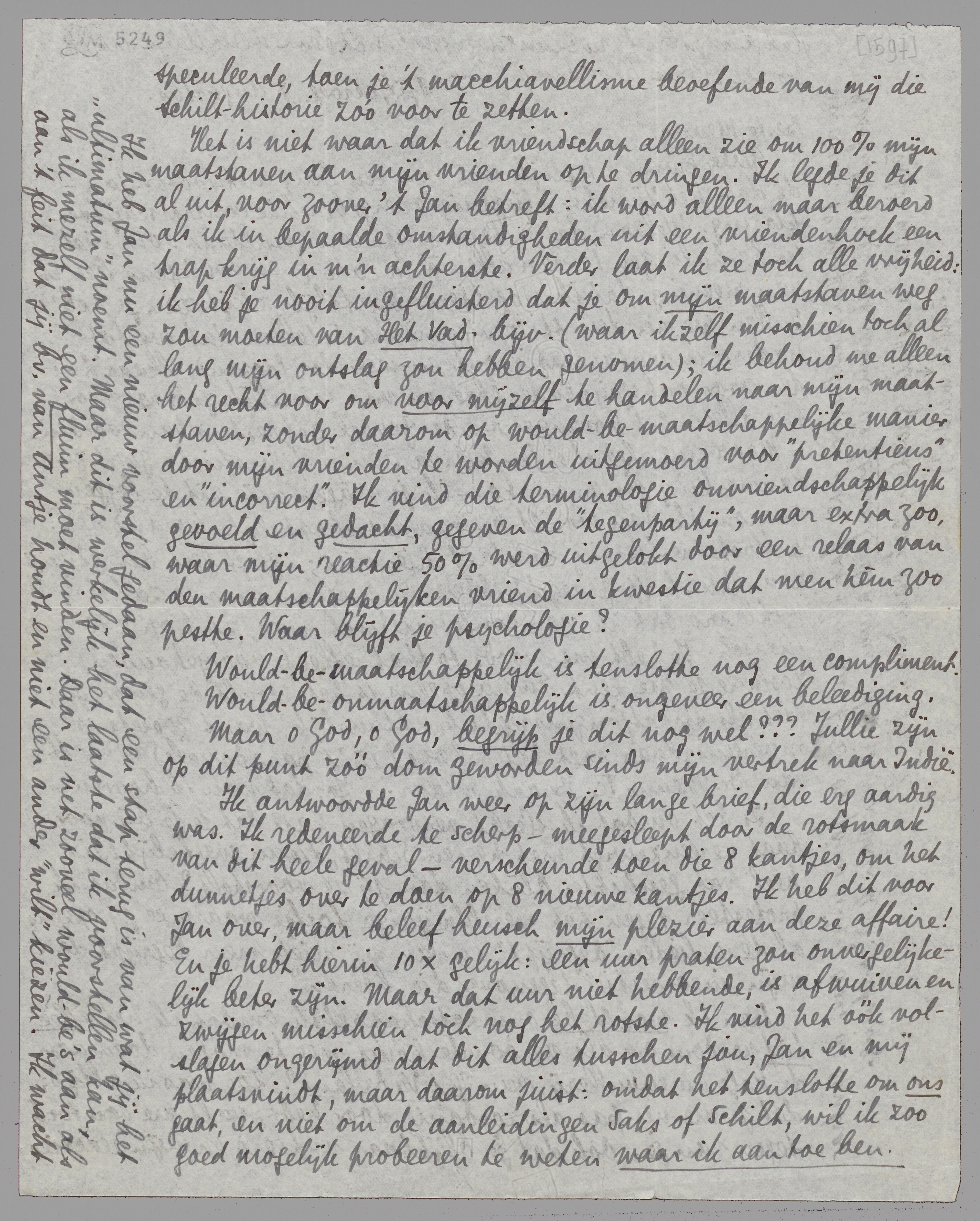 Ben ik would-be-onmaatschappelijk omdat ik het effectief verdom om als verdomde Louis mee te mogen doen aan de kolommenvullerij van Het Vaderland? Zoo was ik altijd; dat je me nu pas als zoodanig door hebt, valt me dan toch tegen van je. Ook dat je blijkbaar verkeerd op mijn reacties speculeerde, toen je 't macchiavellisme beoefende van mij die Schilt-historie zoó voor te zetten.