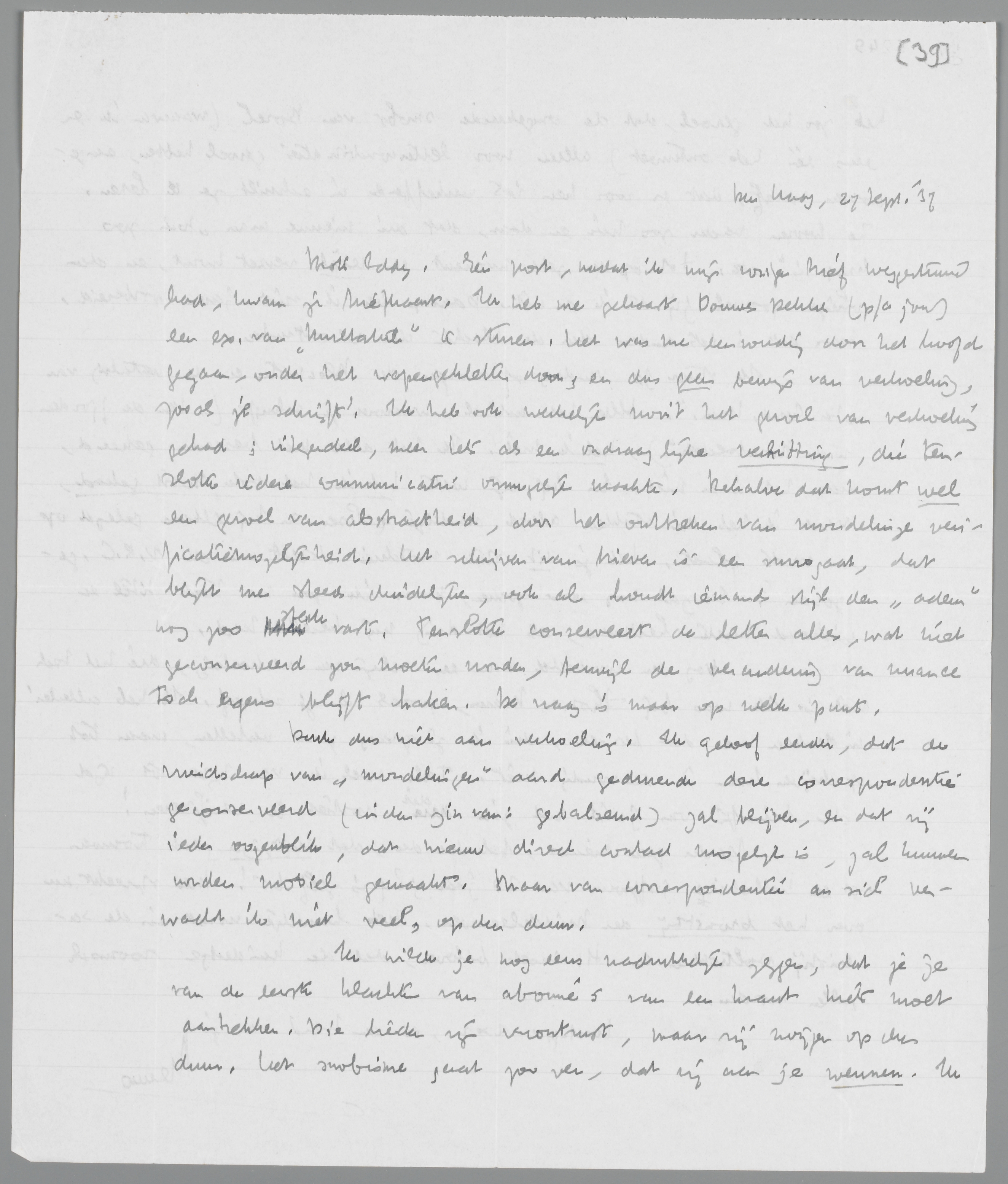 Eén post, nadat ik mijn vorigen brief weggestuurd had, kwam je briefkaart. Ik heb me gehaast Douwes Dekker (p/a jou) een ex. van Multatuli te sturen. Het was me eenvoudig door het hoofd gegaan, onder het wapengekletter door, en dus geen bewijs van verkoeling, zooals je schrijft. Ik heb ook werkelijk nooit het gevoel van verkoeling gehad; integendeel, meer iets als een ondraaglijke verhitting, die tenslotte iedere communicatie onmogelijk maakte. Behalve dat komt wel een gevoel van abstractheid, door het ontbreken van mondelinge verificatiemogelijkheid. Het schrijven van brieven is een surrogaat, dat blijkt me steeds duidelijker, ook al houdt iemands stijl den ‘adem’ nog zoo sterk vast. Tenslotte conserveert de letter alles, wat niet geconserveerd zou moeten worden, terwijl de verandering van nuance toch ergens blijft haken. De vraag is maar op welk punt.