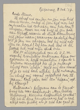 Het 8e vliegongeluk van de K.L.M. waarbij Bronislaw Huberman bijna omgekomen is, heeft misschien 1 van de 2 brieven vernietigd die ik je onlangs schreef over ‘elites’. Meld mij dus vooral of je ze niet toch allebei hebt ontvangen. En schrijf mij vooral uitgebreid over Th. Mann. Toch zeker wèl een ‘titaan’, vgl. bij Klausje?