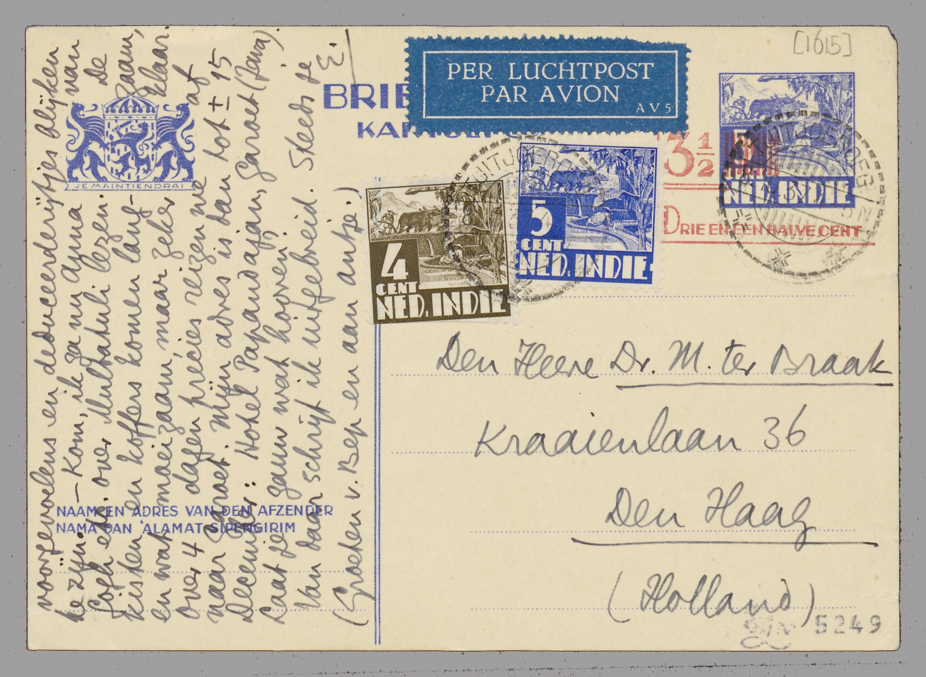 Ik schreef net aan Jan om jou mijn brief door te sturen, omdat ik geen tijd meer had om, tusschen het opbreken van hier door, te schrijven. Maar nu net krijg ik een pak van Nijhoff, waarin de Mult.-bloemlezing uit jouw naam; waarvoor hartelijk dank! Wil je Jan nu schrijven dat hij niet nòg een ex. koopt! Zeg hem ook dat ik De Groene heb, met mijn stuk erin.