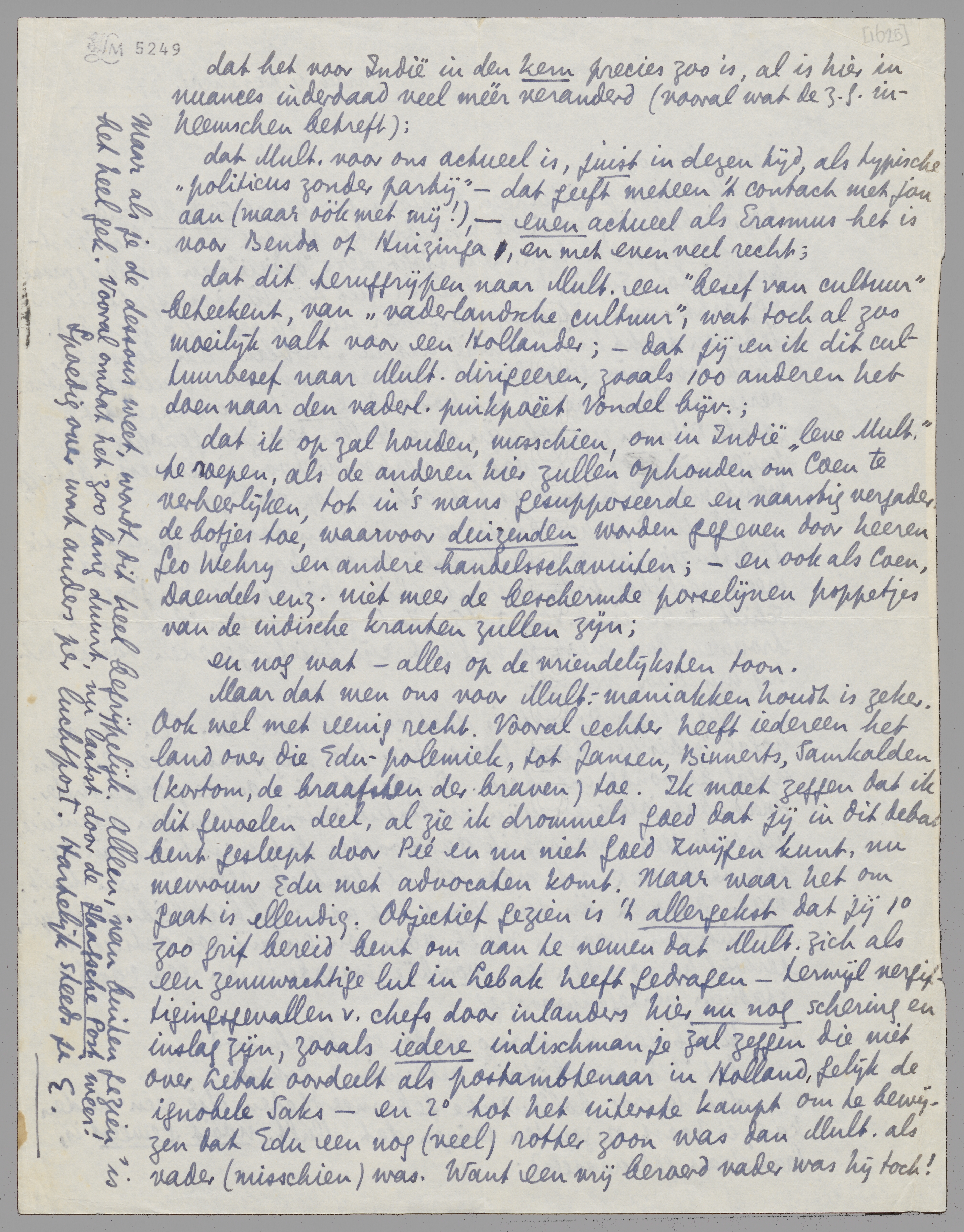Maar dat men ons voor Mult.-maniakken houdt is zeker. Ook wel met eenig recht. Vooral echter heeft iedereen het land over die Edu-polemiek, tot Jansen, Binnerts, Samkalden (kortom, de braafsten der braven) toe. Ik moet zeggen dat ik dit gevoelen deel, al zie ik drommels goed dat jij in dit debat bent gesleept door Peé en nu niet goed zwijgen kunt, nu mevrouw Edu met advocaten komt. Maar waar het om gaat is ellendig. Objectief gezien is 't allergekst dat jij 1o zoo grif bereid bent om aan te nemen dat Mult. zich als een zenuwachtige lul in Lebak heeft gedragen - terwijl vergiftigingsgevallen v. chefs door inlanders hier nu nog schering en inslag zijn, zooals iedere indischman je zal zeggen die niet over Lebak oordeelt als postambtenaar in Holland, gelijk de ignobele Saks - en 2o tot het uiterste kampt om te bewijzen dat Edu een nog (veel) rotter zoon was dan Mult. als vader (misschien) was. Want een vrij beroerd vader was hij toch!