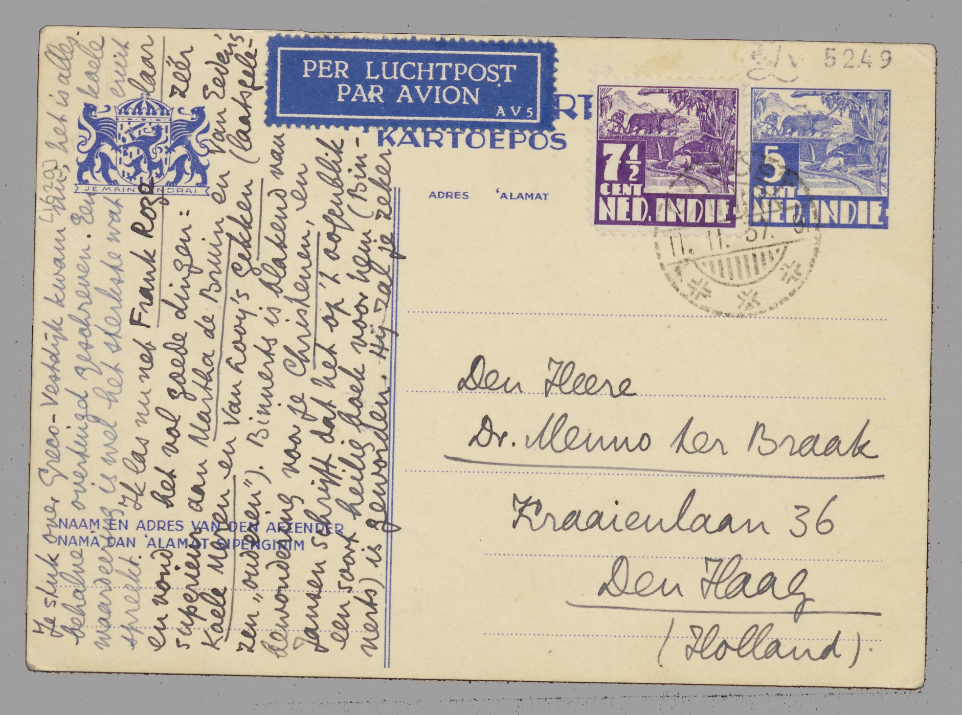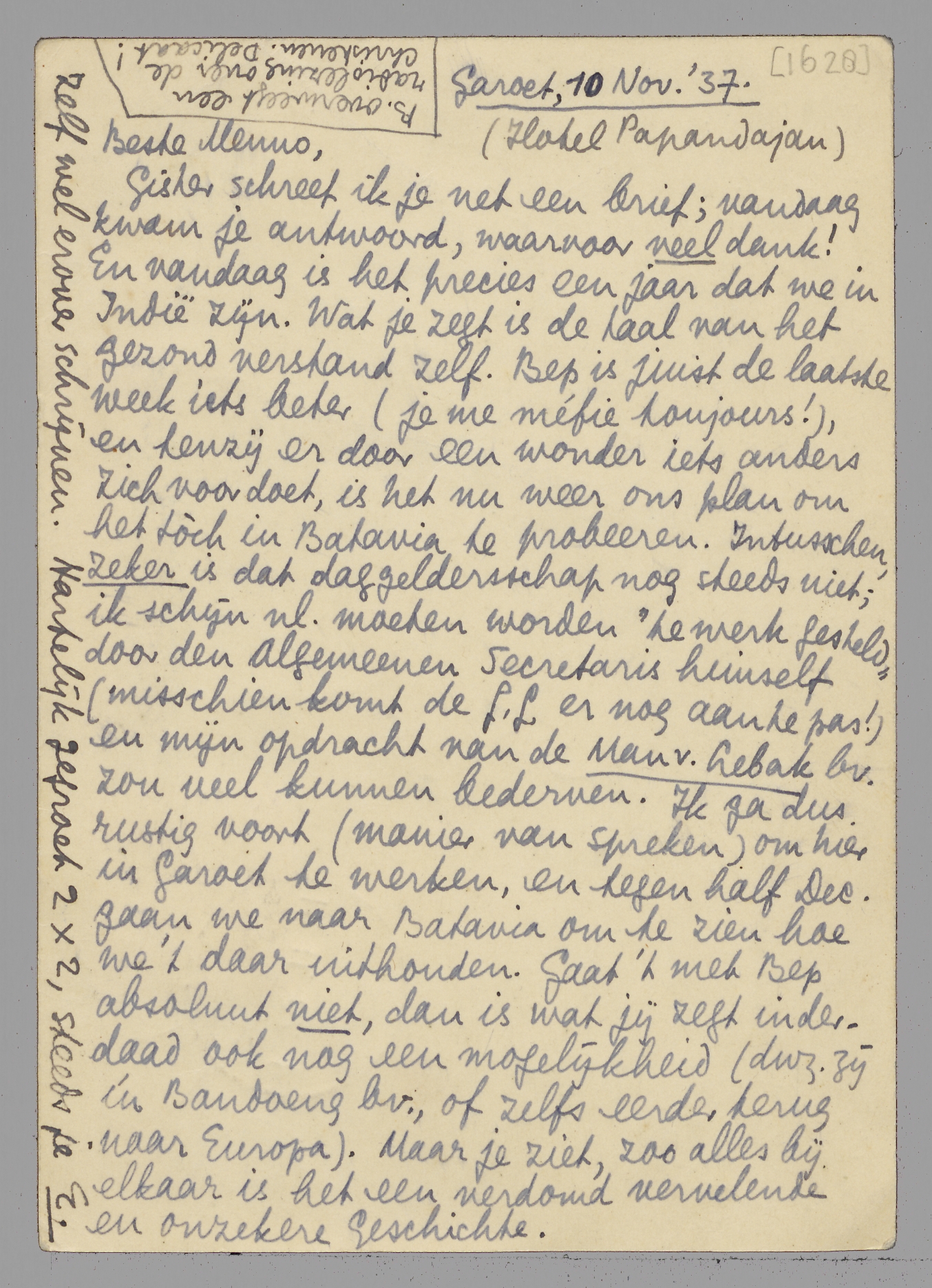 Gister schreef ik je net een brief; vandaag kwam je antwoord, waarvoor veel dank! En vandaag is het precies een jaar dat we in Indië zijn. Wat je zegt is de taal van het gezond verstand zelf. Bep is juist de laatste week iets beter (je me méfie toujours!), en tenzij er door een wonder iets anders zich voordoet, is het nu weer ons plan om het tòch in Batavia te probeeren. Intusschen, zeker is dat daggeldersschap nog steeds niet; ik schijn nl. moeten worden ‘te werk gesteld’ door den Algemeenen Secretaris himself (misschien komt de G.G. er nog aan te pas!) en mijn opdracht van de Man v. Lebak bv. zou veel kunnen bederven. Ik ga dus rustig voort (manier van spreken) om hier in Garoet te werken, en tegen half Dec. gaan we naar Batavia om te zien hoe we 't daar uithouden. Gaat 't met Bep absoluut niet, dan is wat jij zegt inderdaad ook nog een mogelijkheid (dwz. zij in Bandoeng bv., of zelfs eerder terug naar Europa). Maar je ziet, zoo alles bij elkaar is het een verdomd vervelende en onzekere Geschichte.