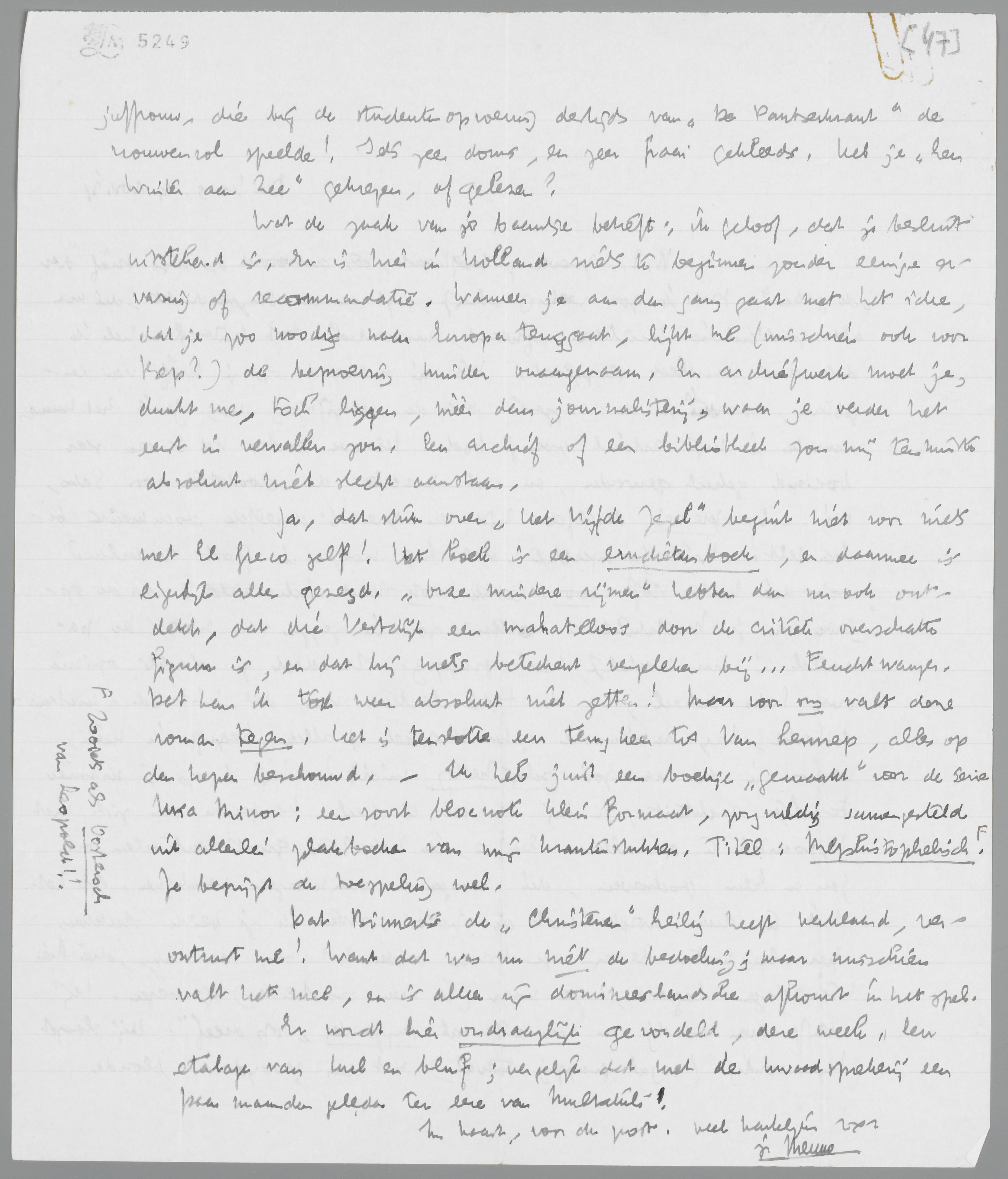 Ja, dat stuk over Het Vijfde Zegel begint niet voor niets met El Greco zelf! Het boek is een erudietenboek, en daarmee is eigenlijk alles gezegd. ‘Onze mindere rijmen’ hebben dan nu ook ontdekt, dat die Vestdijk een mahateloos door de critiek overschatte figuur is, en dat hij niets beteekent vergeleken bij... Feuchtwanger. Dat kan ik toch weer absoluut niet zetten! Maar voor ons valt deze roman tegen. Het is tenslotte een terugkeer tot van Lennep, alles op den keper beschouwd. - Ik heb juist een boekje ‘gemaakt’ voor de serie Ursa Minor; een soort blocnote klein formaat, zorgvuldig samengesteld uit allerlei plakboeken van mijn krantenstukken. Titel: Mephistophelisch. [Zooiets als Oostersch van Leopold!!] Je begrijpt de toespeling wel.