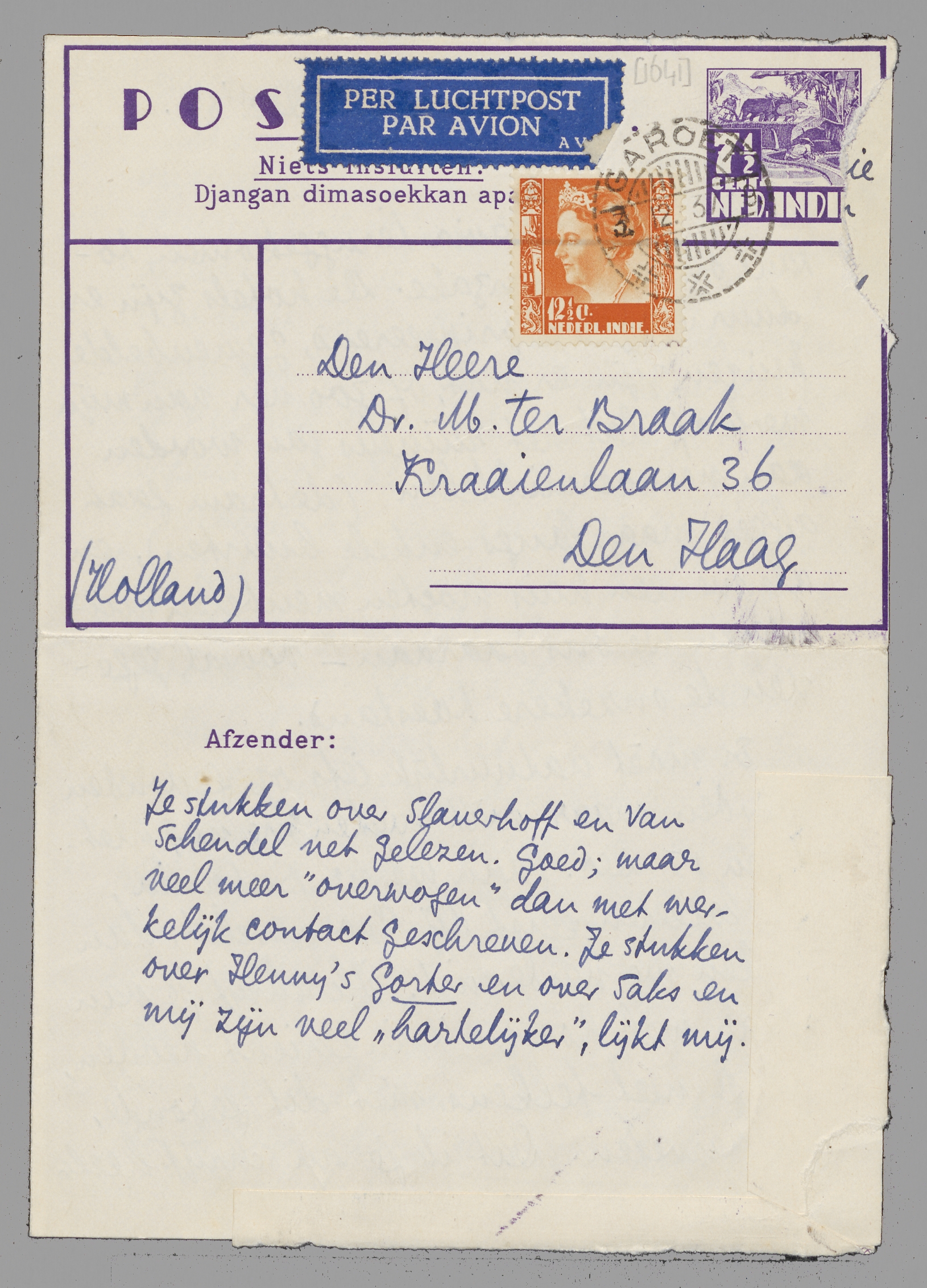 Je stukken over Slauerhoff en Van Schendel net gelezen. Goed; maar veel meer ‘overwogen’ dan met werkelijk contact geschreven. Je stukken over Henny's Gorter en over Saks en mij zijn veel ‘hartelijker’, lijkt mij.