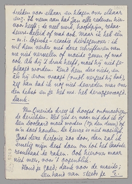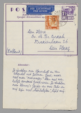 Dat ik je vraag het ms. niet aan Jan te zenden, vindt zijn oorzaak hierin. Ik schreef hem, uit Tjitjoeroeg al, en later van hier, bij herhaling over De Onzekeren en ook met het oog op een geheele of gedeeltelijke publikatie in Gr. Ned., dat, zooals je weet, voor mij praktisch het eenige tijdschrift is in Holland. Hij reageerde, op alles wat ik hem schreef, met geen kik. Laten we de zaak Saks niet overdoen, met partij trekken voor elkaar en klagen over elkaar enz. Ik neem aan dat Jan alle redenen hiervoor heeft: te veel werk, hoofdpijn, redacteurs-beleid of wat ook. Maar ik heb één - m.i. logische - reactie hiertegenover: ik wil hem verder met deze schrifturen van me niet vervelen of moeite geven of wat ook. Als hij 't druk heeft, moet hij niet geplaagd worden. Zend hem dus niets, en àls hij erom vraagt (vmdl. vergeet hij dat), zeg dan dat ik nog niet tevreden was over den tekst en je het ms. heb teruggevraagd. Dank.