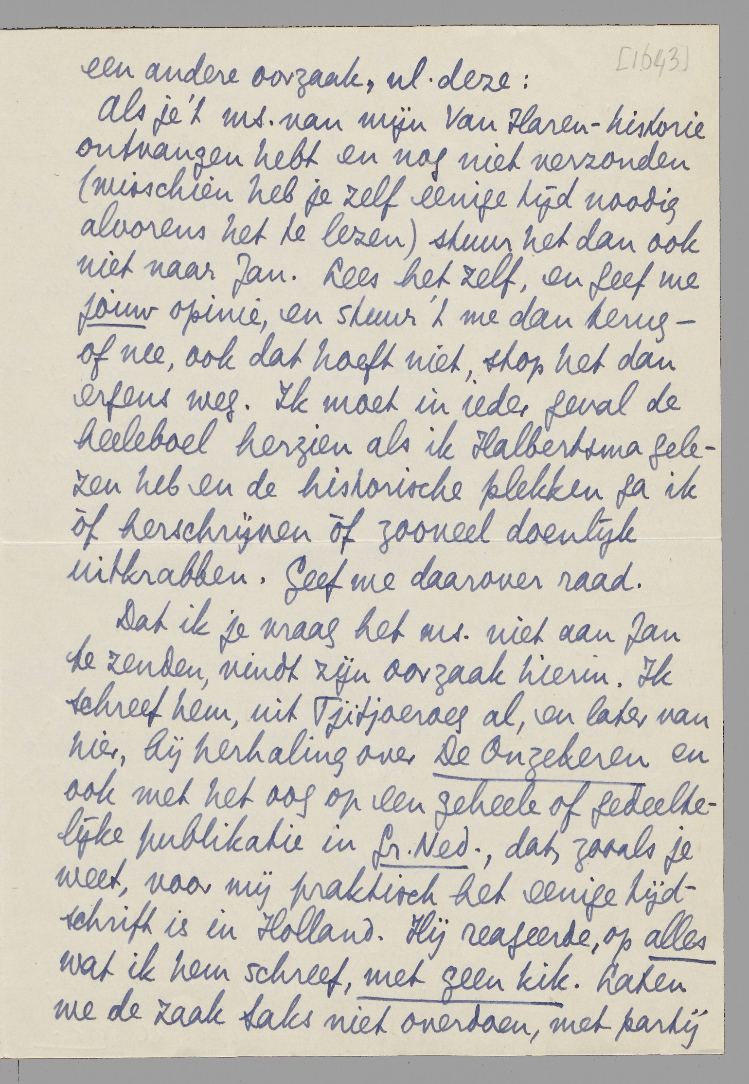 Als je 't ms. van mijn Van Haren-historie ontvangen hebt en nog niet verzonden (misschien heb je zelf eenige tijd noodig alvorens het te lezen) stuur het dan ook niet naar Jan. Lees het zelf, en geef me jouw opinie, en stuur 't me dan terug - of nee, ook dat hoeft niet, stop het dan ergens weg. Ik moet in ieder geval de heeleboel herzien als ik Halbertsma gelezen heb en de historische plekken ga ik òf herschrijven òf zooveel doenlijk uitkrabben. Geef me daarover raad.