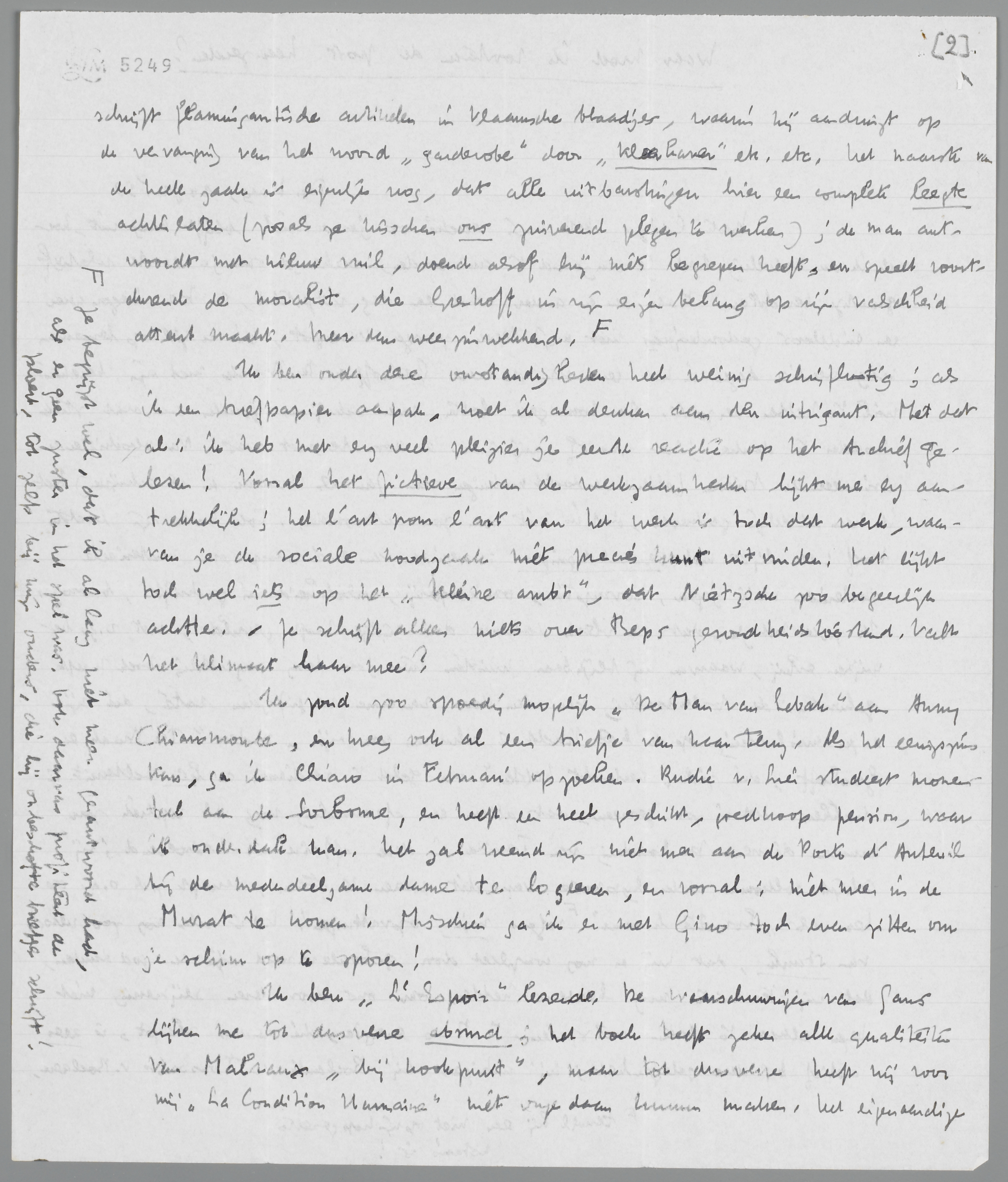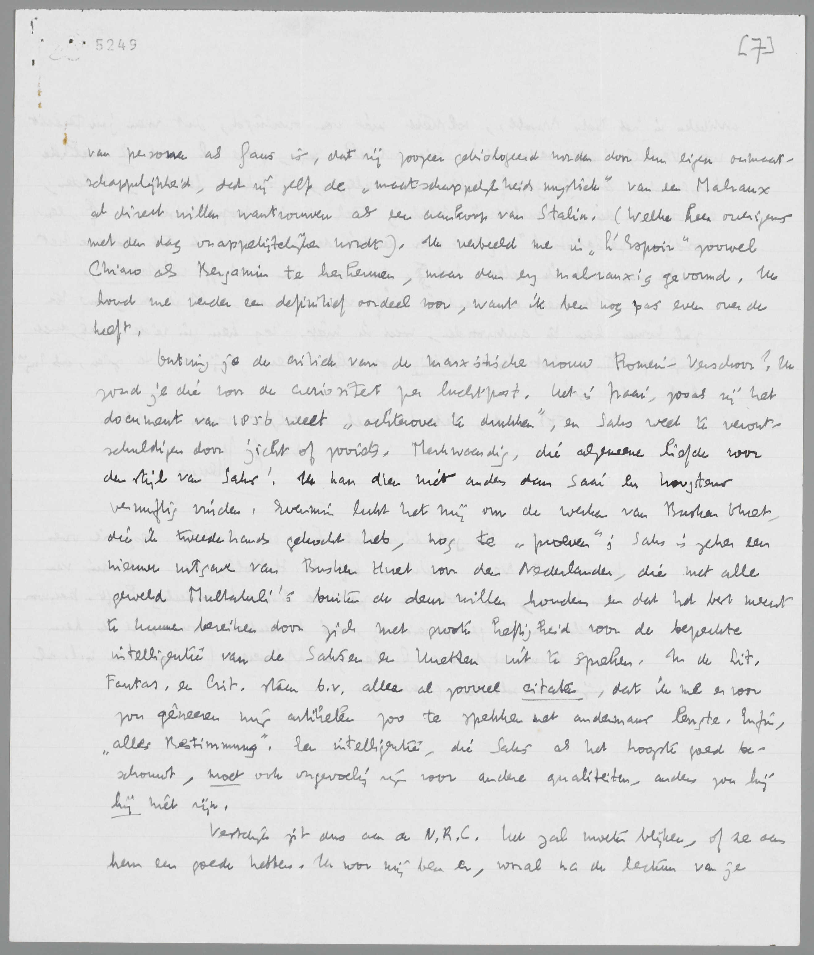 Ontving je de critiek van de marxistische vrouw Romein-Verschoor? Ik zond je die voor de curiositeit per luchtpost. Het is fraai, zooals zij het document van 1856 weet ‘achterover te drukken’, en Saks weet te verontschuldigen door jicht of zooiets. Merkwaardig, die algemeene liefde voor den stijl van Saks! Ik kan dien niet anders dan saai en hoogstens vernuftig vinden. Evenmin lukt het mij om de werken van Busken Huet, die ik tweedehands gekocht heb, nog te ‘proeven’; Saks is zeker een nieuwe uitgave van Busken Huet voor den Nederlander, die met alle geweld Multatuli's buiten de deur willen houden en dat het best meent te kunnen bereiken door zich met groote heftigheid voor de beperkte intelligentie van de Saksen en Huetten uit te spreken. In de Lit. Fantas. en Crit. staan b.v. alleen al zooveel citaten, dat ik me er voor zou gêneeren mijn artikelen zoo te spekken met andermans lengte. Enfin, ‘alles Bestimmung’. Een intelligentie, die Saks als het hoogste goed beschouwt, moet ook ongevoelig zijn voor andere qualiteiten, anders zou hij hij niet zijn.