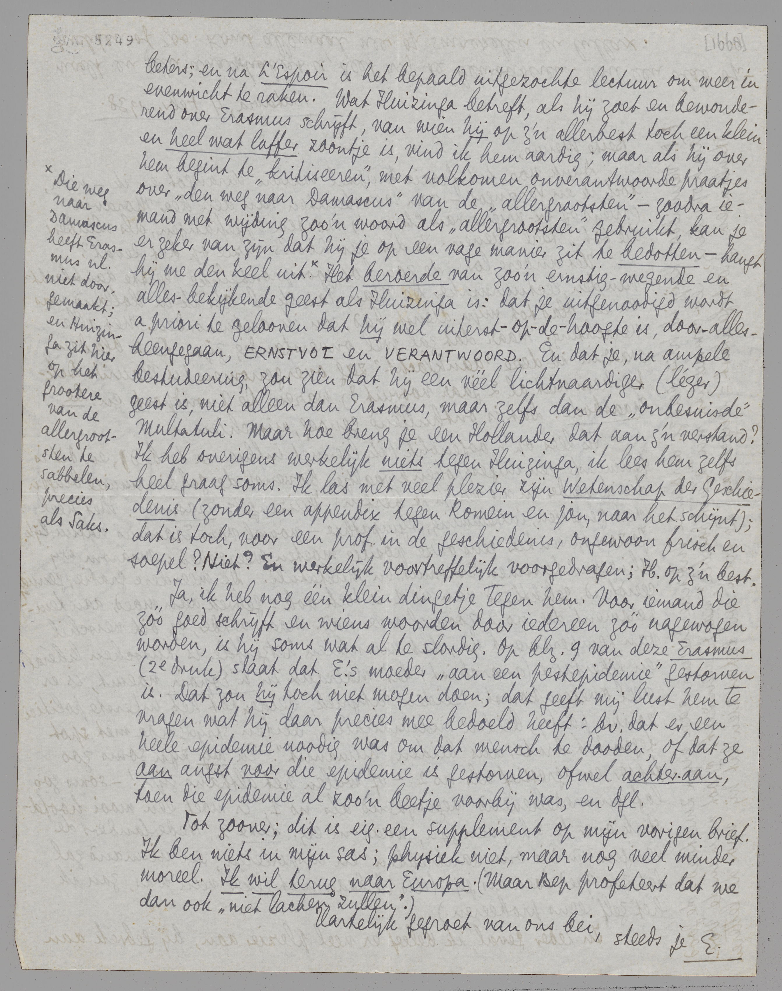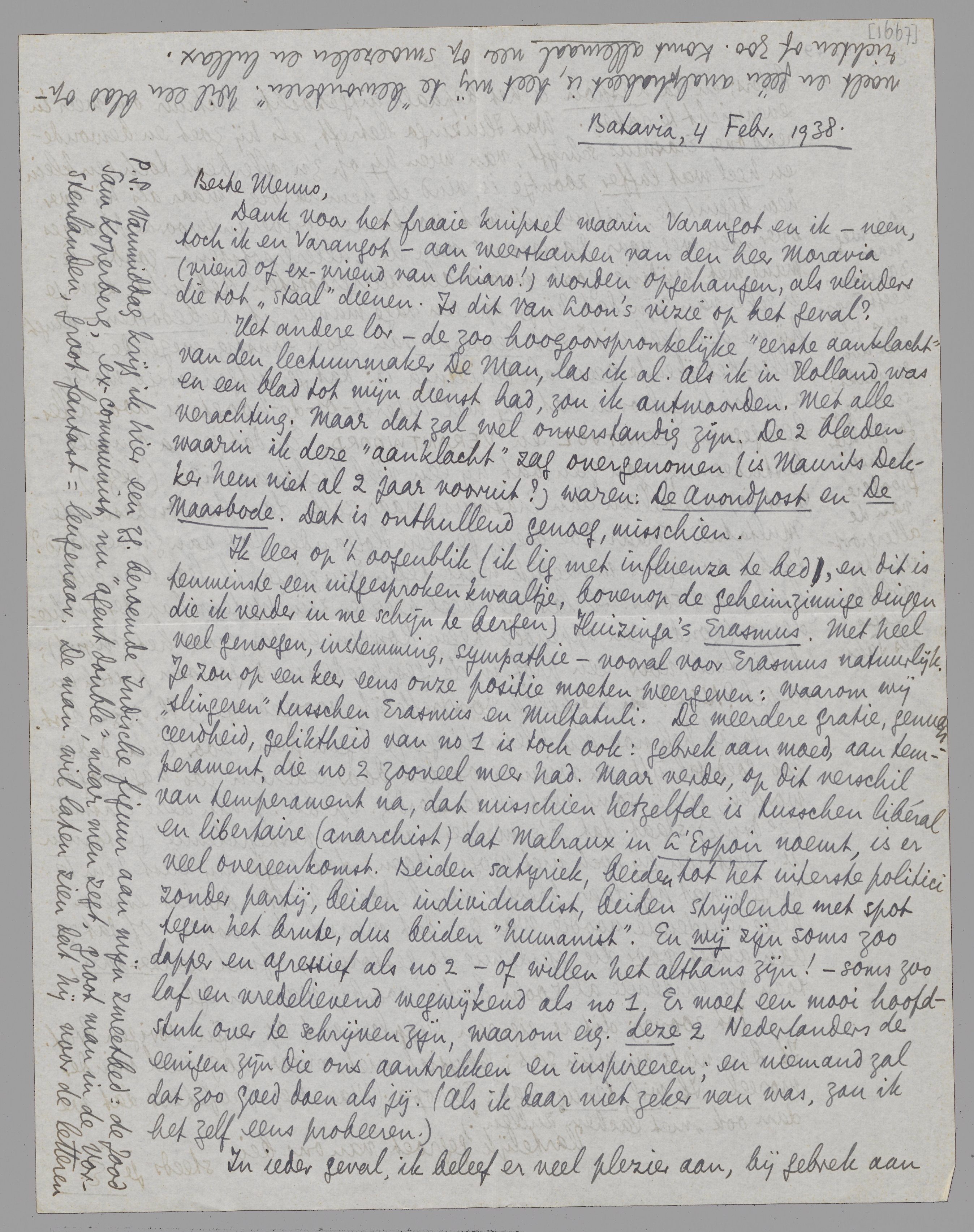 Ik lees op 't oogenblik (ik lig met influenza te bed, en dit is tenminste een uitgesproken kwaaltje, bovenop de geheimzinnige dingen die ik verder in me schijn te bergen) Huizinga's Erasmus. Met heel veel genoegen, instemming, sympathie - vooral voor Erasmus natuurlijk. Je zou op een keer eens onze positie moeten weergeven: waarom wij ‘slingeren’ tusschen Erasmus en Multatuli. De meerdere gratie, genuanceerdheid, geliktheid van no 1 is toch ook: gebrek aan moed, aan temperament, die no. 2 zooveel meer had. Maar verder, op dit verschil van temperament na, dat misschien hetzelfde is tusschen libéral en libertaire (anarchist) dat Malraux in L'Espoir noemt, is er veel overeenkomst. Beiden satyriek, beiden tot het uiterste politici zonder partij, beiden individualist, beiden strijdende met spot tegen het brute, dus beiden ‘humanist’. En wij zijn soms zoo dapper en agressief als no 2 - of willen het althans zijn! - soms zoo laf en vredelievend wegwijkend als no 1. Er moet een mooi hoofdstuk over te schrijven zijn, waarom eig. deze 2 Nederlanders de eenigen zijn die ons aantrekken en inspireeren; en niemand zal dat zoo goed doen als jij. (Als ik daar niet zeker van was, zou ik het zelf eens probeeren.)