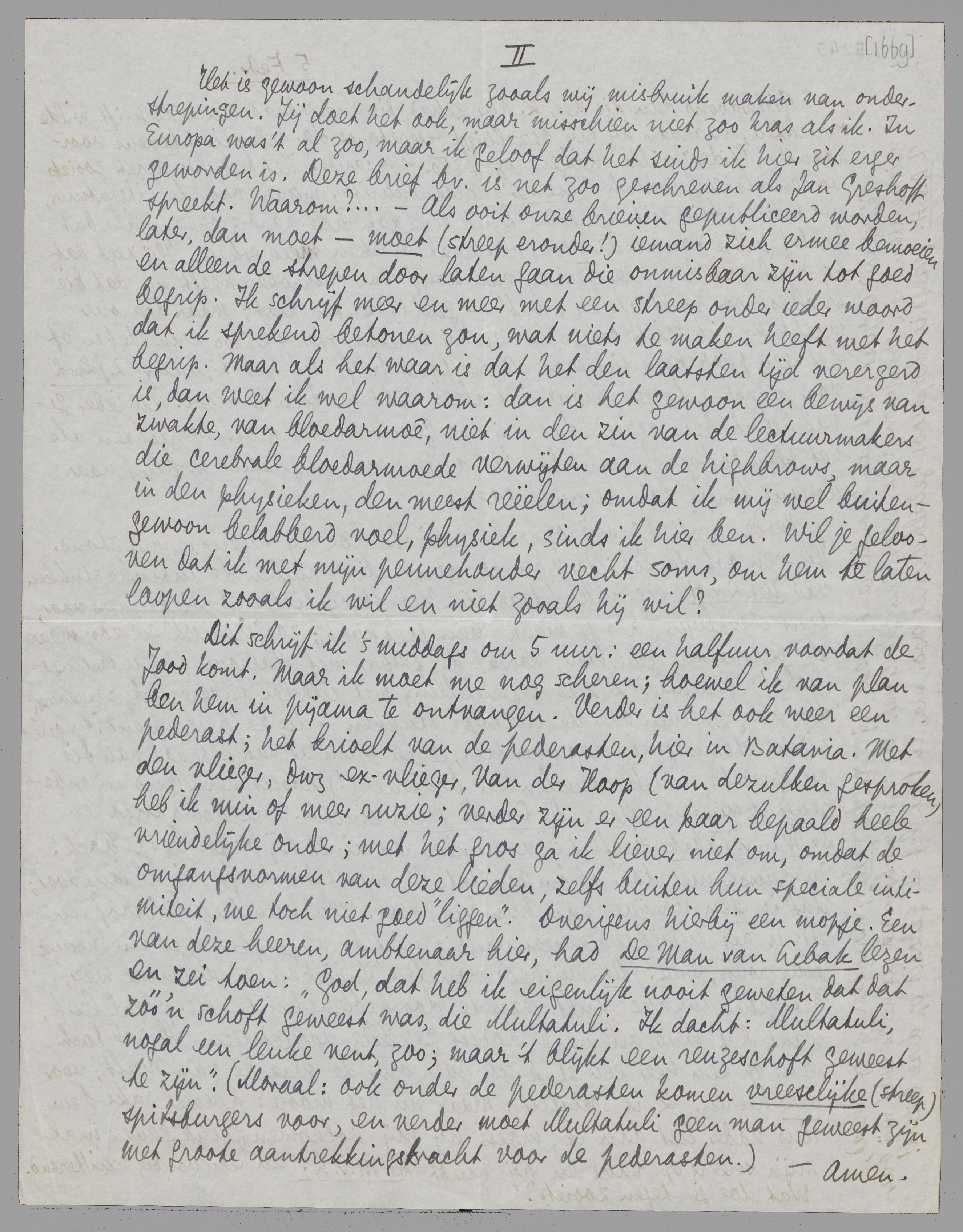 Dit schrijf ik ’s middags om 5 uur: een halfuur voordat de Jood komt. Maar ik moet me nog scheren; hoewel ik van plan ben hem in pyama te ontvangen. Verder is het ook weer een pederast; het krioelt van de pederasten, hier in Batavia. Met den vlieger, dwz. ex-vlieger, Van der Hoop (van dezulken gesproken) heb ik min of meer ruzie; verder zijn er een paar bepaald heele vriendelijke onder; met het gros ga ik liever niet om, omdat de omgangsvormen van deze lieden, zelfs buiten hun speciale intimiteit, me toch niet goed ‘liggen’. Overigens hierbij een mopje. Een van deze heeren, ambtenaar hier, had De Man van Lebak lezen en zei toen: ‘God, dat heb ik eigenlijk nooit geweten dat dat zóó'n schoft geweest was, die Multatuli. Ik dacht: Multatuli, nogal een leuke vent, zoo; maar 't blijkt een reuzeschoft geweest te zijn’. (Moraal: ook onder de pederasten komen vreeselijke (streep) spitsburgers voor, en verder moet Multatuli geen man geweest zijn met groote aantrekkingskracht voor de pederasten.) - Amen.