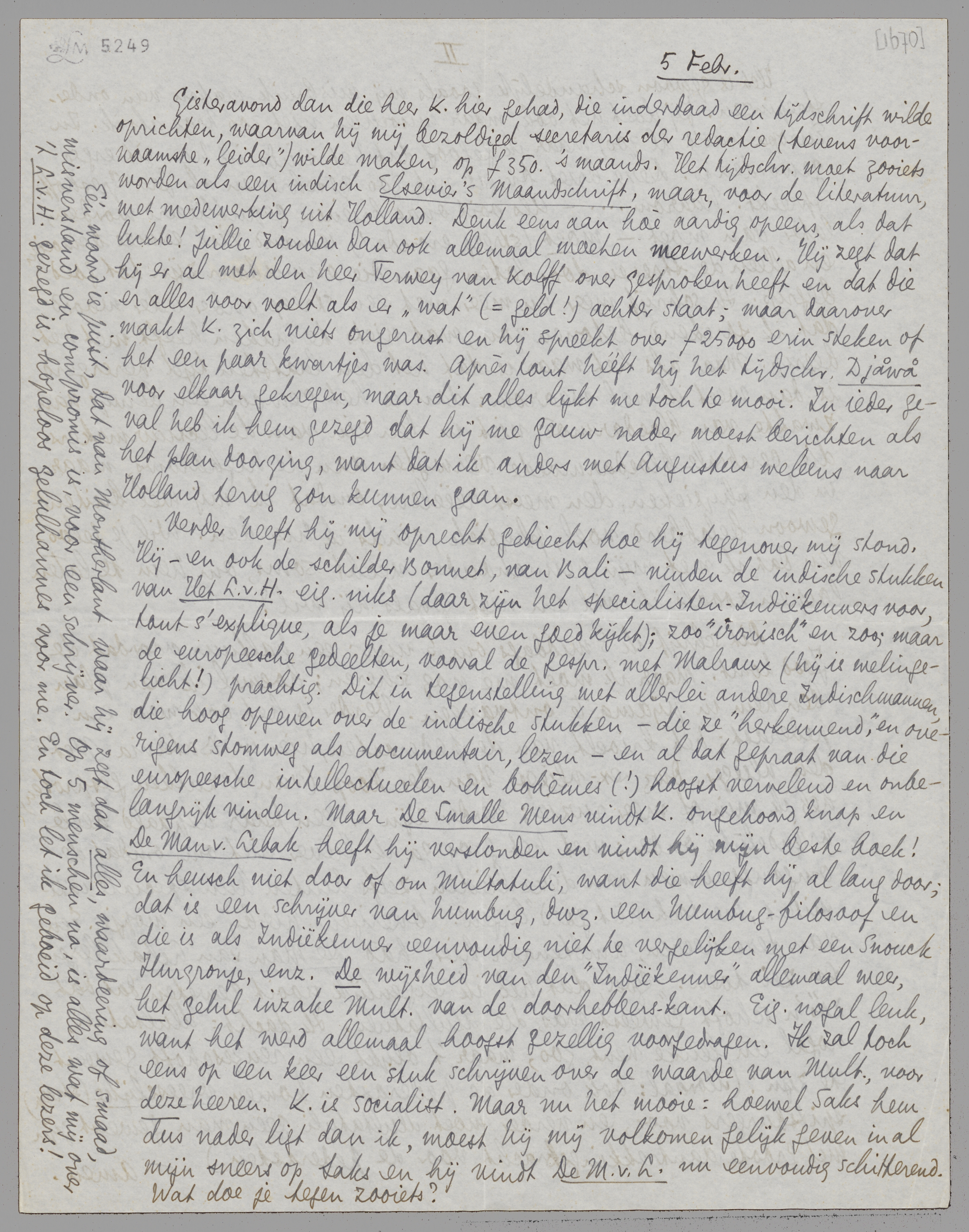Verder heeft hij mij oprecht gebiecht hoe hij tegenover mij stond. Hij - en ook de schilder Bonnet, van Bali - vinden de indische stukken van Het L.v.H. eig. niks (daar zijn het specialisten-Indiëkenners voor, tout s'explique, als je maar even goed kijkt); zoo ‘ironisch’ en zoo; maar de europeesche gedeelten, vooral de gespr. met Malraux (hij is welingelicht!) prachtig. Dit in tegenstelling met allerlei andere Indischmannen, die hoog opgeven over de indische stukken - die ze ‘herkennend’, en overigens stomweg als documentair, lezen - en al dat gepraat van die europeesche intellectueelen en bohèmes (!) hoogst vervelend en onbelangrijk vinden. Maar De Smalle Mens vind K. ongehoord knap en De Man v. Lebak heeft hij verslonden en vindt hij mijn beste boek! En heusch niet door of om Multatuli, want die heeft hij al lang door; dat is een schrijver van humbug, dwz. een humbug-filosoof en die is als Indiëkenner eenvoudig niet te vergelijken met een Snouck Hurgronje, enz. De wijsheid van den ‘Indiëkenner’ allemaal weer, het gelul inzake Mult. van de doorhebbers-kant. Eig. nogal leuk, want het werd allemaal hoogst gezellig voorgedragen. Ik zal toch eens op een keer een stuk schrijven over de waarde van Mult., voor deze heeren. K. is socialist. Maar nu het mooie: hoewel Saks hem dus nader ligt dan ik, moest hij mij volkomen gelijk geven in al mijn sneers op Saks en hij vindt De M.v.L. nu eenvoudig schitterend. Wat doe je tegen zooiets?