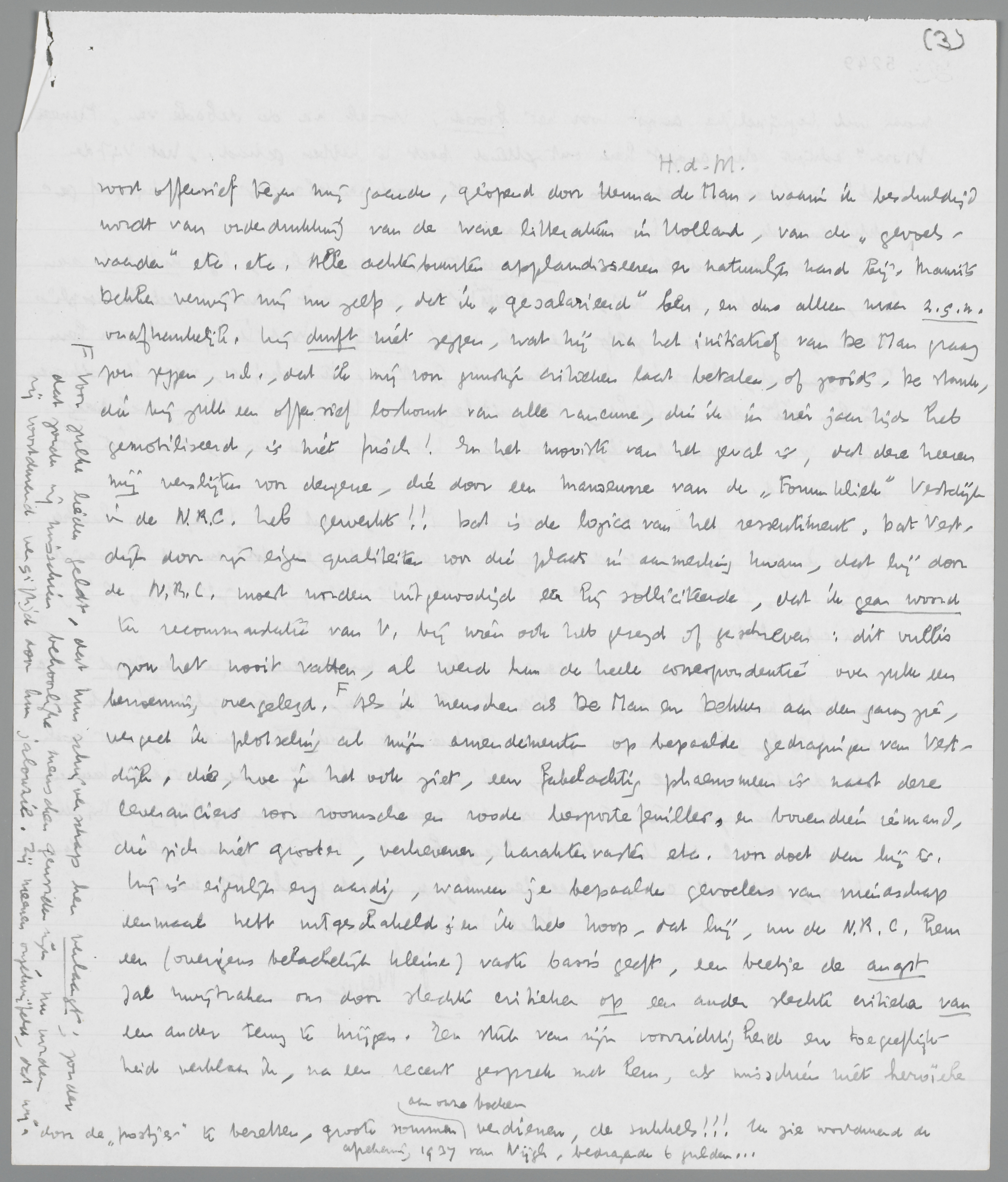 Hoe De Man van Lebak gaat, weet ik niet, want ik onderhoud met Querido geen geregelde relaties. Maar verwacht er niet te veel van, want de mentaliteit is den Hollander antipathiek, zooals alles, wat naar ‘verheerlijking van de intelligentie’ zweemt. Er is momenteel een soort offensief tegen mij gaande, geopend door Herman de Man, waarin ik beschuldigd wordt van onderdrukking van de ware litteratuur in Holland, van de ‘gevoelswaarde’ etc. etc. Alle achterbuurten applaudisseeren er natuurlijk hard bij. Maurits Dekker verwijt mij nu zelfs, dat ik ‘gesalarieerd’ ben, en dus alleen maar z.g.n. onafhankelijk. Hij durft niet zeggen, wat hij na het initiatief van De Man graag zou zeggen, n.l., dat ik mij voor gunstige critieken laat betalen, of zooiets. De stank, die bij zulk een offensief loskomt van alle rancune, die ik in vier jaar tijds heb gemobiliseerd, is niet frisch! En het mooiste van het geval is, dat deze heeren mij verslijten voor dengene, die door een manoeuvre van de ‘Forumkliek’ Vestdijk in de N.R.C. heb gewerkt!! Dat is de logica van het ressentiment. Dat Vestdijk door zijn eigen qualiteiten voor die plaats in aanmerking kwam, dat hij door de N.R.C. moest worden uitgenoodigd eer hij solliciteerde, dat ik geen woord ter recommandatie van V. bij wien ook heb gezegd of geschreven: dit vullis zou het nooit vatten, al werd hun de heele correspondentie over zulk een benoeming overgelegd. [Voor zulke lieden geldt, dat hun schrijverschap hen verlaagt; zonder dat zouden zij misschien behoorlijke menschen geworden zijn, nu worden zij voortdurend vergiftigd door hun jalouzie. Zij meenen ongetwijfeld, dat wij, door de ‘postjes’ te bezetten, groote sommen aan onze boeken verdienen, de sukkels!!! Ik zie voortdurend de afrekening 1937 van Nijgh, bedragende 6 gulden...] Als ik menschen als De Man en Dekker aan den gang zie, vergeet ik plotseling al mijn amendementen op bepaalde gedragingen van Vestdijk, die, hoe je het ook ziet, een fabelachtig phaenomeen is naast deze leveranciers voor roomsche en roode leesportefeuilles, en bovendien iemand, die zich niet grooter, verhevener, karaktervaster etc. voor doet dan hij is. Hij is eigenlijk erg aardig, wanneer je bepaalde gevoelens van vriendschap eenmaal hebt uitgeschakeld; en ik heb hoop, dat hij, nu de N.R.C. hem een (overigens belachelijk kleine) vaste basis geeft, een beetje de angst zal kwijtraken om door slechte critieken op een ander slechte critieken van een ander terug te krijgen. En stuk van zijn voorzichtigheid en toegeeflijkheid verklaar ik, na een recent gesprek met hem, als misschien niet heroïeke maar wel begrijpelijke angst voor het brood. Vooral na de debacle van Meneer Visser schijnt die angst hem ontzettend beet te hebben gehad. Het Vijfde Zegel is (hoe zou het anders) zijn eerste boekhandelsucces, waar hij zelf gelukkig met de noodige ironie op reageert.