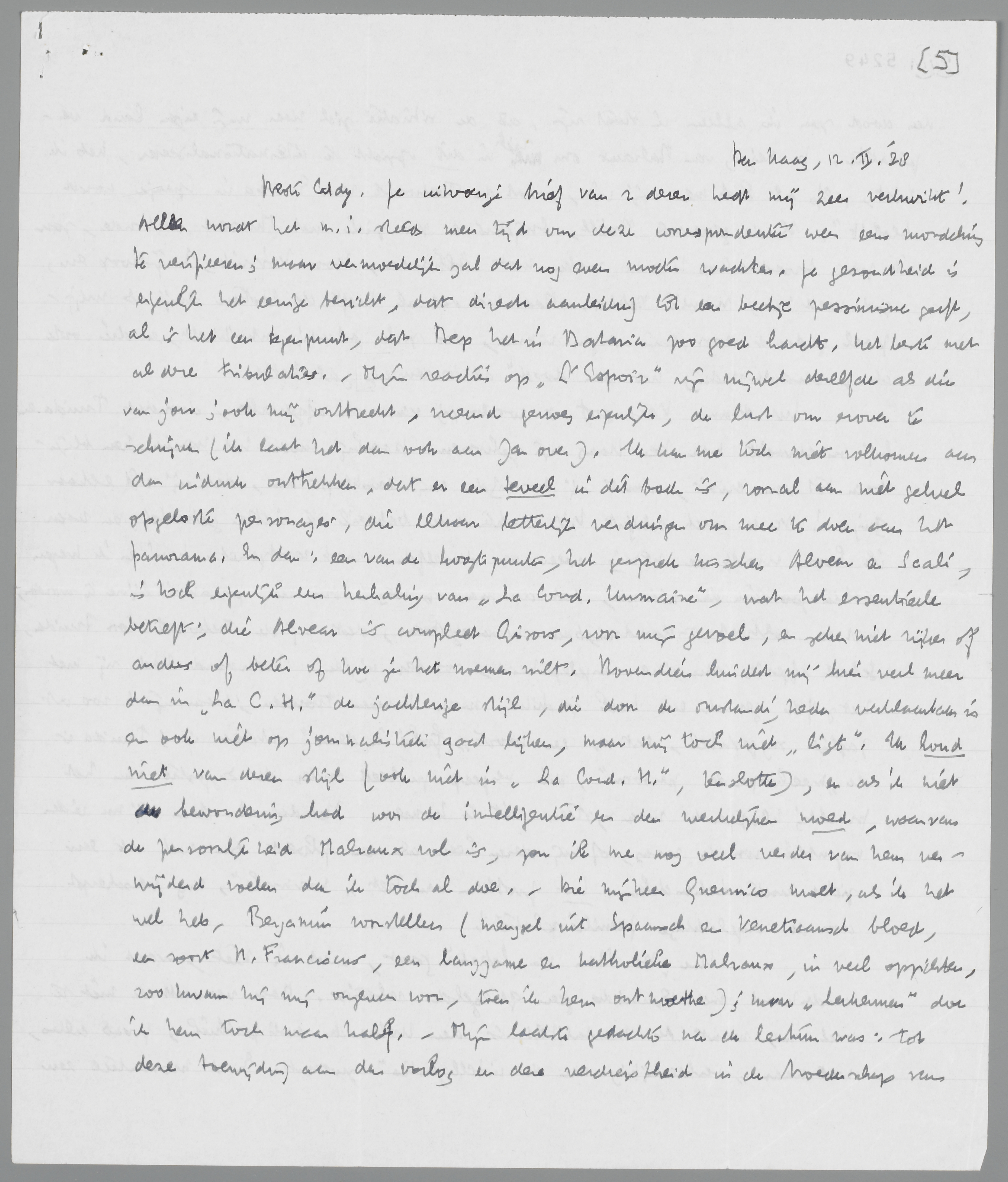 Je uitvoerige brief van 2 dezer heeft mij zeer verkwikt! Alleen wordt het m.i. steeds meer tijd om deze correspondentie weer eens mondeling te verifieeren; maar vermoedelijk zal dat nog even moeten wachten. Je gezondheid is eigenlijk het eenige bericht, dat directe aanleiding tot een beetje pessimisme geeft, al is het een tegenpunt, dat Bep het in Batavia zoo goed hardt. Het beste met al deze tribulaties. Mijn reacties op L'Espoir zijn vrijwel dezelfde als die van jou; ook mij ontbreekt, vreemd genoeg eigenlijk, de lust om erover te schrijven (ik laat het dan ook aan Jan over). Ik kan me toch niet volkomen aan den indruk onttrekken, dat er een teveel in dit boek is, vooral aan niet geheel opgeloste personages, die elkaar letterlijk verdringen om mee te doen aan het panorama. En dan: een van de hoogtepunten, het gesprek tusschen Alvear en Scali, is toch eigenlijk een herhaling van La Cond. Humaine, wat het essentieele betreft; die Alvear is compleet Gisors, voor mijn gevoel, en zeker niet rijker of anders of beter of hoe je het noemen wilt. Bovendien hindert mij hier veel meer dan in La C.H. de jachterige stijl, die door de omstandigheden verklaarbaar is en ook niet op journalistiek gaat lijken, maar mij toch niet ‘ligt’. Ik houd niet van dezen stijl (ook niet in La Cond. H., tenslotte), en als ik niet bewondering had voor de intelligentie en den werkelijken moed, waarvan de persoonlijkheid Malraux vol is, zou ik me nog veel verder van hem verwijderd voelen dan ik toch al doe. - Die mijnheer Guernico moet, als ik het wel heb, Bergamin voorstellen (mengsel uit Spaansch en Venetiaansch bloed, een soort H. Franciscus, een langzame en katholieke Malraux, in veel opzichten, zoo kwam hij mij ongeveer voor, toen ik hem ontmoette); maar ‘herkennen’ doe ik hem toch maar half. - Mijn laatste gedachte na de lectuur was: tot deze toewijding aan den oorlog en deze verdieptheid in de broederschap van den dood zou ik alleen in staat zijn, als de situatie zich naar mijn eigen land verplaatste. De neiging van Malraux om zich in dit opzicht te internationaliseeren, heb ik niet, zelfs al legt men mij uit, ‘dat de toekomst van Europa in Spanje wordt beslist’. Als de generaals Roëll, Snijders en zoo zich met Mussert verbonden, zou ik pas broederschap kunnen voelen met Albarda, Koos Vorrink, Wijnkoop en, god weet het, Maurits Dekker. Maar met dat al heeft de lectuur mij als wrijfpaal gediend voor mijn eigen roman, die zich gestadig ontwikkelt, en die ook de ‘verantwoording voor den dood’ als onderwerp zal hebben.