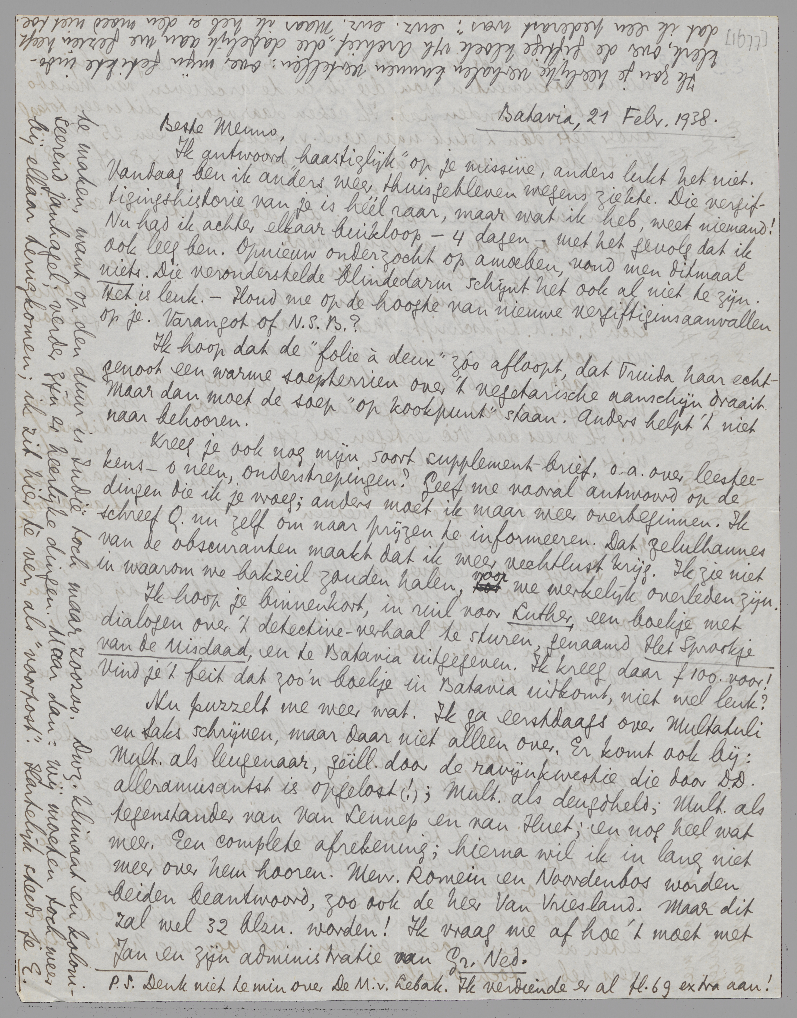 Ik antwoord ‘haastiglijk’ op je missive, anders lukt het niet. Vandaag ben ik anders weer thuis gebleven wegens ziekte. Die vergiftigingshistorie van je is héél raar, maar wat ik heb, weet niemand! Nu had ik achter elkaar buikloop - 4 dagen - met het gevolg dat ik ook leeg ben. Opnieuw onderzocht op amoeben, vond men ditmaal niets. Die veronderstelde blindedarm schijnt het ook al niet te zijn. Het is leuk. - Houd me op de hoogte van nieuwe vergiftigingsaanvallen op je. Varangot of N.S.B.?