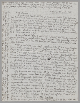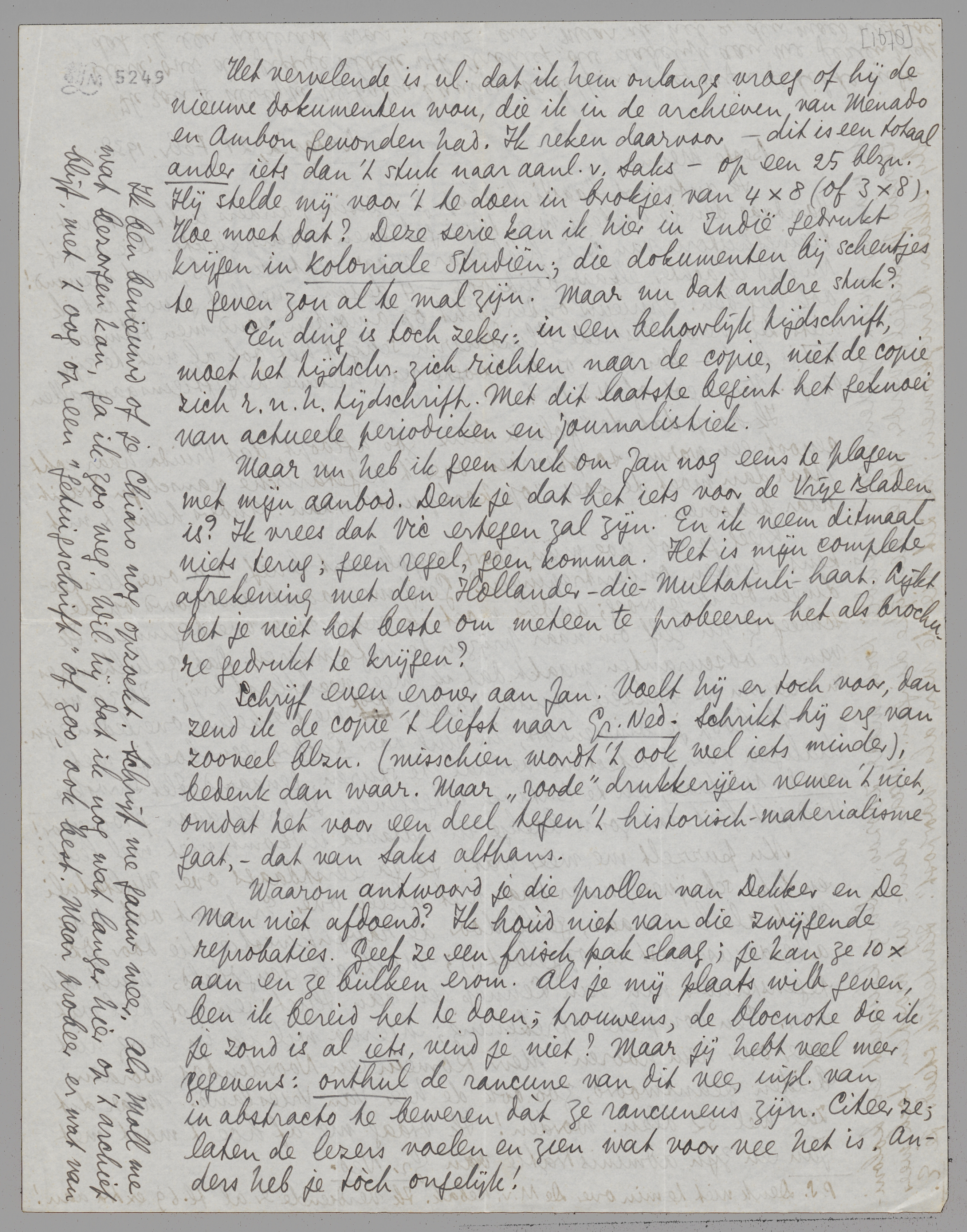 Het vervelende is nl. dat ik hem onlangs vroeg of hij de nieuwe dokumenten wou, die ik in de archieven van Menado en Ambon gevonden had. Ik reken daarvoor - dit is een totaal ander iets dan 't stuk naar aanl. v. Saks - op een 25 blzn. Hij stelde mij voor 't te doen in brokjes van 4 × 8 (3 × 8). Hoe moet dat? Deze serie kan ik hier in Indië gedrukt krijgen in Koloniale Studiën; die dokumenten bij scheutjes te geven zou al te mal zijn. Maar nu dat andere stuk?