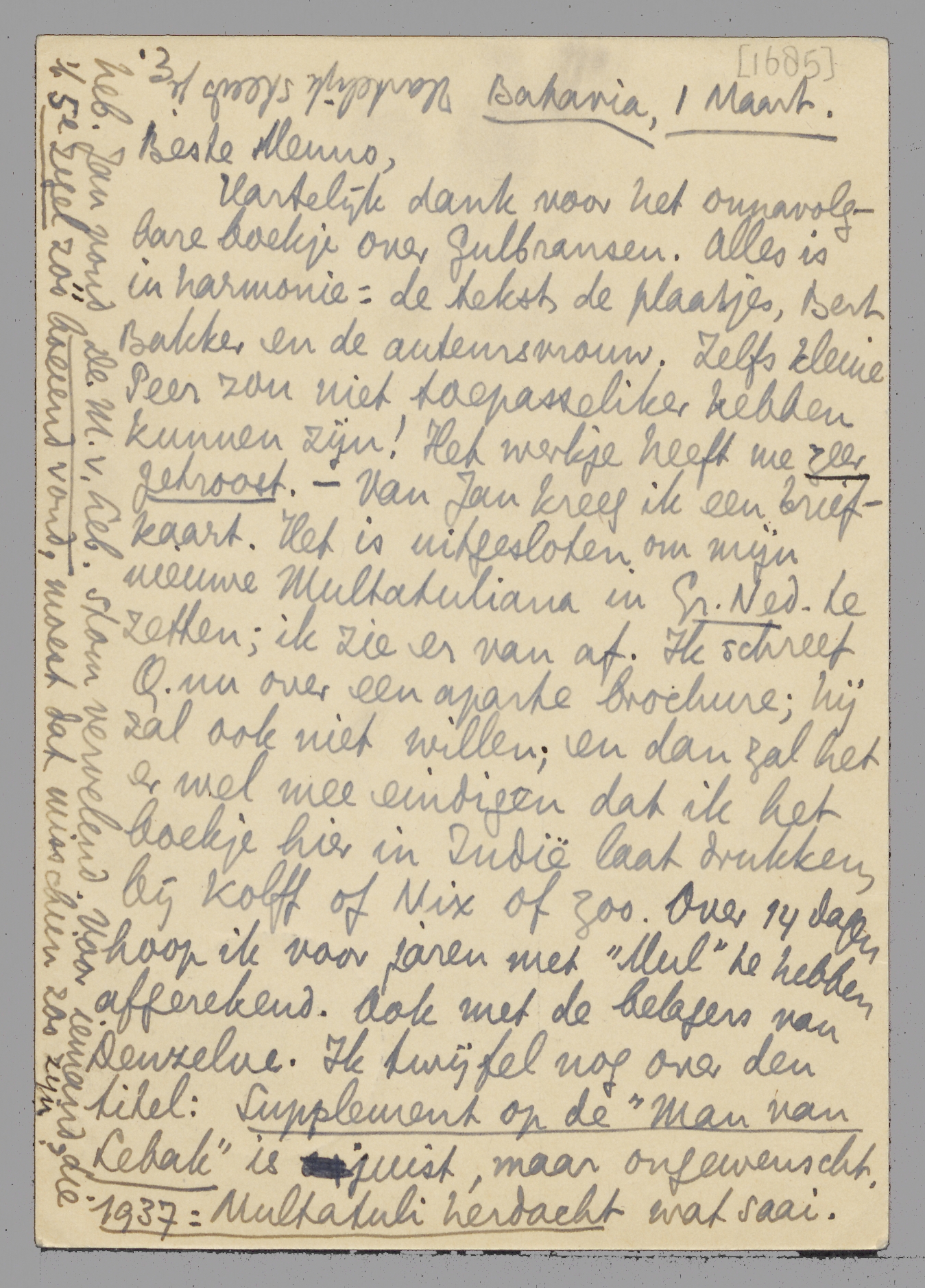 Hartelijk dank voor het onnavolgbare boekje over Gulbransen. Alles is in harmonie: de tekst, de plaatjes, Bert Bakker en de auteursvrouw. Zelfs kleine Peer zou niet toepasseliker hebben kunnen zijn! Het werkje heeft me zeer getroost. - Van Jan kreeg ik een briefkaart. Het is uitgesloten om mijn nieuwe Multatuliana in Gr. Ned. te zetten; ik zie er van af. Ik schreef Q. nu over een aparte brochure; hij zal ook niet willen; en dan zal het er wel mee eindigen dat ik het boekje hier in Indië laat drukken, bij Kolff of Nix of zoo. Over 14 dagen hoop ik voor jaren met ‘Mul’ te hebben afgerekend. Ook met de belagers van Denzelve. Ik twijfel nog over den titel: Supplement op de ‘Man van Lebak’ is juist, maar ongewenscht, 1937: Multatuli herdacht wat saai. Multatuli en de Hollander een beetje abstract. Ik voel momenteel 't meest voor den titel die ik aan het tijdschriftartikel wou geven: Jan Lubbes bijt de schim van Multatuli. Dan weet men meteen wat men aan 't boekje ‘heeft’. Tenzij je echt en ongezocht iets weet (De Haan misschien - die me overigens doodzweeg op een uitvoerigen brief dien ik aan den anderen Gans zond), doe er geen moeite meer voor. Spoedig meer, - als ik weer een brief van je heb. Jan vond De M.v.Leb. stom vervelend. Voor iemand, die 't 5e Zegel zóó boeiend vond, moest dat misschien zoo zijn?