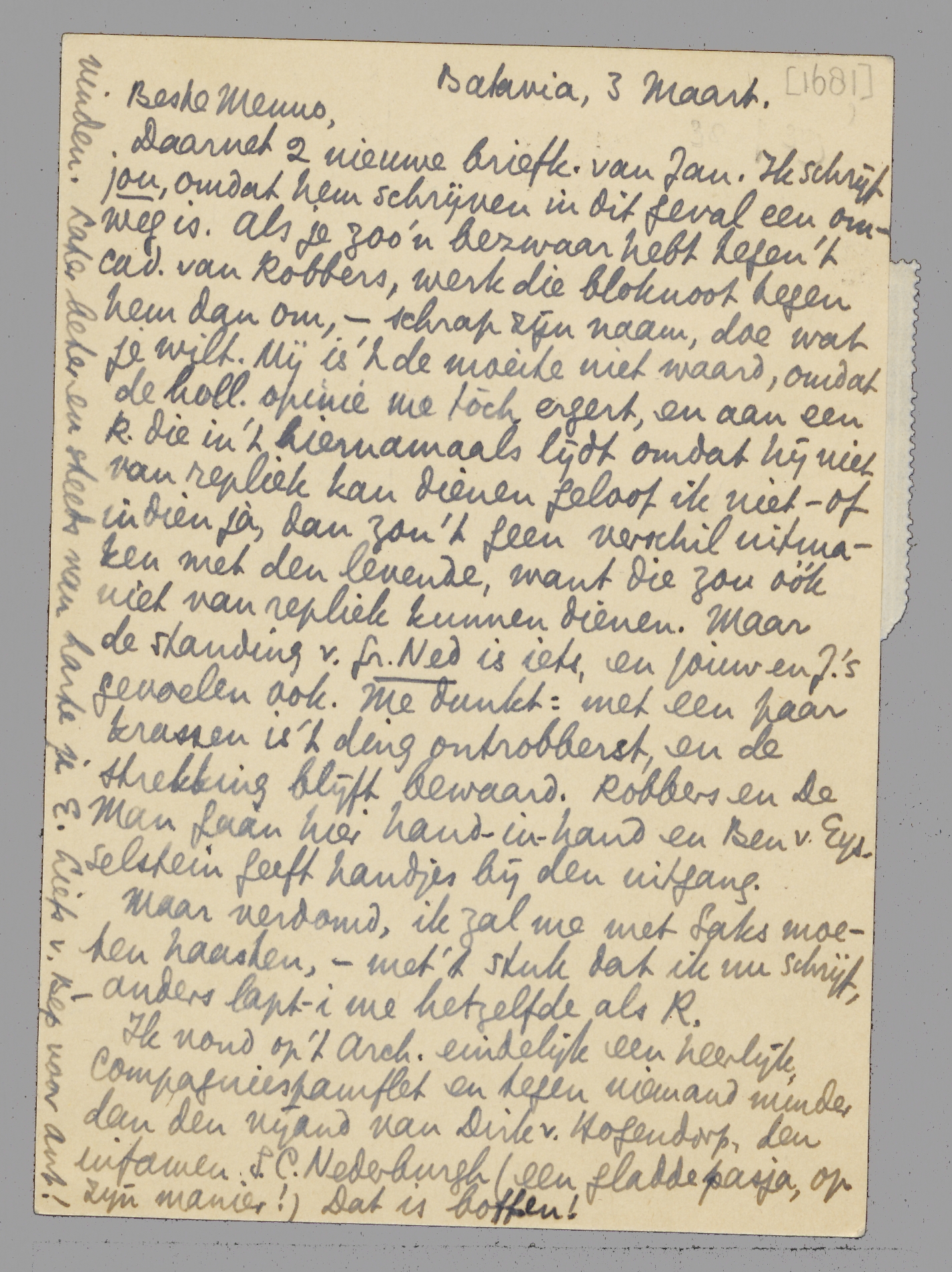 Daarnet 2 nieuwe briefk. van Jan. Ik schrijf jou, omdat hem schrijven in dit geval een omweg is. Als je zoo'n bezwaar hebt tegen 't cad. van Robbers, werk die bloknoot tegen hem dan om, - schrap zijn naam, doe wat je wilt. Mij is 't de moeite niet waard, omdat de holl. opinie me tòch ergert, en aan een R. die in 't hiernamaals lijdt omdat hij niet van repliek kan dienen geloof ik niet - of indien jà, dan zou 't geen verschil uitmaken met den levende, want die zou óók niet van repliek kunnen dienen. Maar de standing v. Gr. Ned. is iets, en jouw en J's gevoelen ook. Me dunkt: met een paar krassen is 't ding ontrobberst, en de strekking blijft bewaard. Robbers en De Man gaan hier hand-in-hand en Ben v. Eysselstein geeft handjes bij den uitgang.