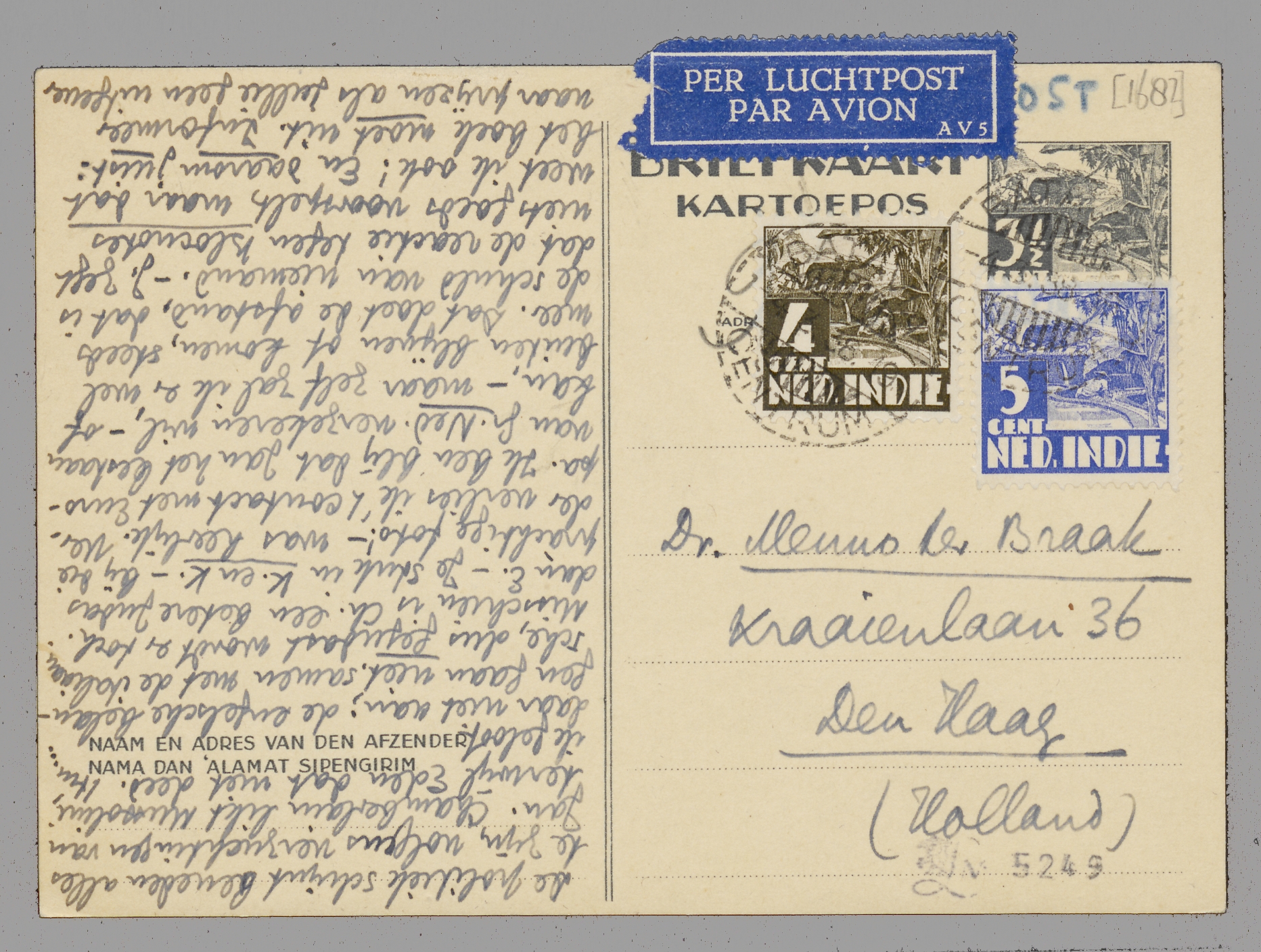 De politiek schijnt beneden alles te zijn, volgens verzuchtingen van Jan. Chamberlain likt Mussolini, terwijl Eden dat niet deed. Hm... ik geloof daar niet aan; de engelsche belangen gaan niet samen met de italiaansche, dus gejudast wordt er toch. Misschien is Ch. een betere Judas dan E. - Je stuk in K. en K. - bij die pràchtige foto! - was heerlijk. Verder verlies ik 't contact met Europa. Ik ben blij dat Jan het bestaan van Gr. Ned. verzekeren wil, - of kan, - maar zelf zal ik er wel buiten blijven of komen, steeds meer. Dat doet de afstand, dat is de schuld van niemand. - J. zegt dat reactie tegen Blocnotes niets goeds voorspelt, maar dat weet ik ook! En daarom juist: het boek moet uit. Informeer naar prijzen als jullie geen uitgever vinden.