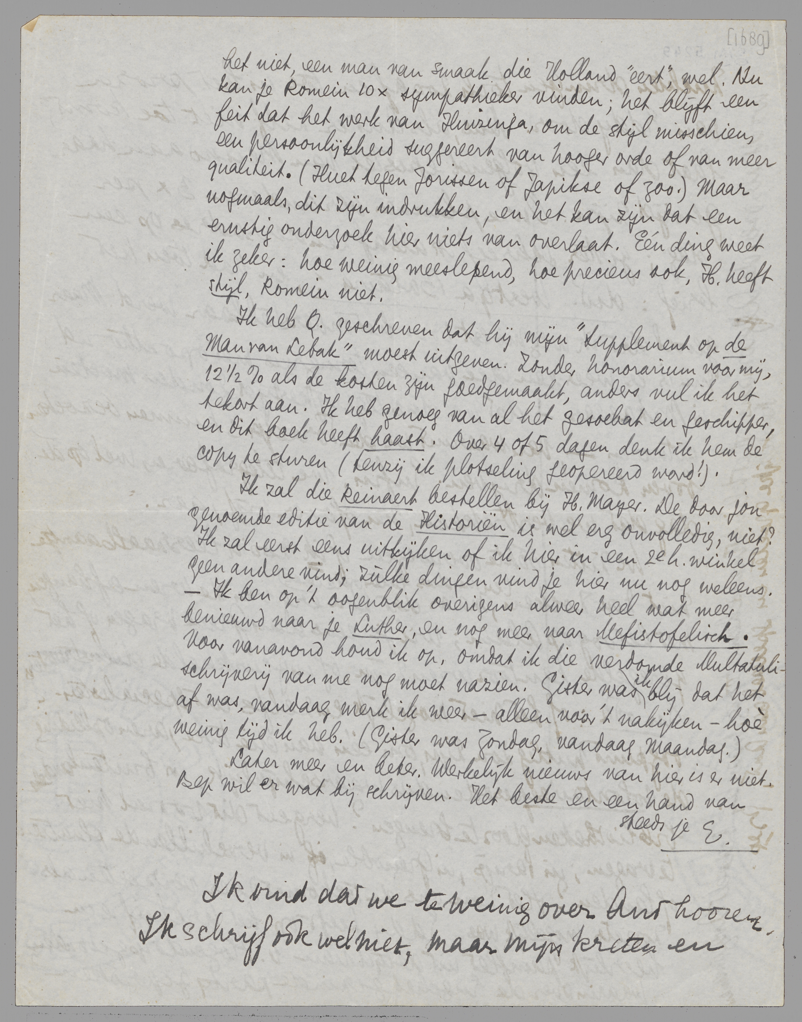 Over Huizinga kan je heel best gelijk hebben en ik ongelijk. Ik oordeel tenslotte als ‘buitenstaand’ lezer, jij als betrokken vakman. Het Herfsttij vind ik véél minder dan de Cult. Hist. Verkenningen, omdat die ‘vizie’ van H. dan toch maar van bijeengeplakte citaten leeft, - zoo ongeveer als mijn Man van Lebak. Verdienstelijk lees- en kies-werk, met een juist of subtiel of sterk oordeel. In de C.H.V. proef ik den man zelf, schrijvend over zijn vak. Een groote geest is het niet, een man van smaak die Holland ‘eert’, wel. Nu kan je Romein 10 × sympathieker vinden; het blijft een feit dat het werk van Huizinga, om de stijl misschien, een persoonlijkheid suggereert van hooger orde of van meer qualiteit. (Huet tegen Jorissen of Japikse of zoo.) Maar nogmaals, dit zijn indrukken, en het kan zijn dat een ernstig onderzoek hier niets van overlaat. Eén ding weet ik zeker: hoe weinig meeslepend, hoe precieus ook, H. heeft stijl, Romein niet.