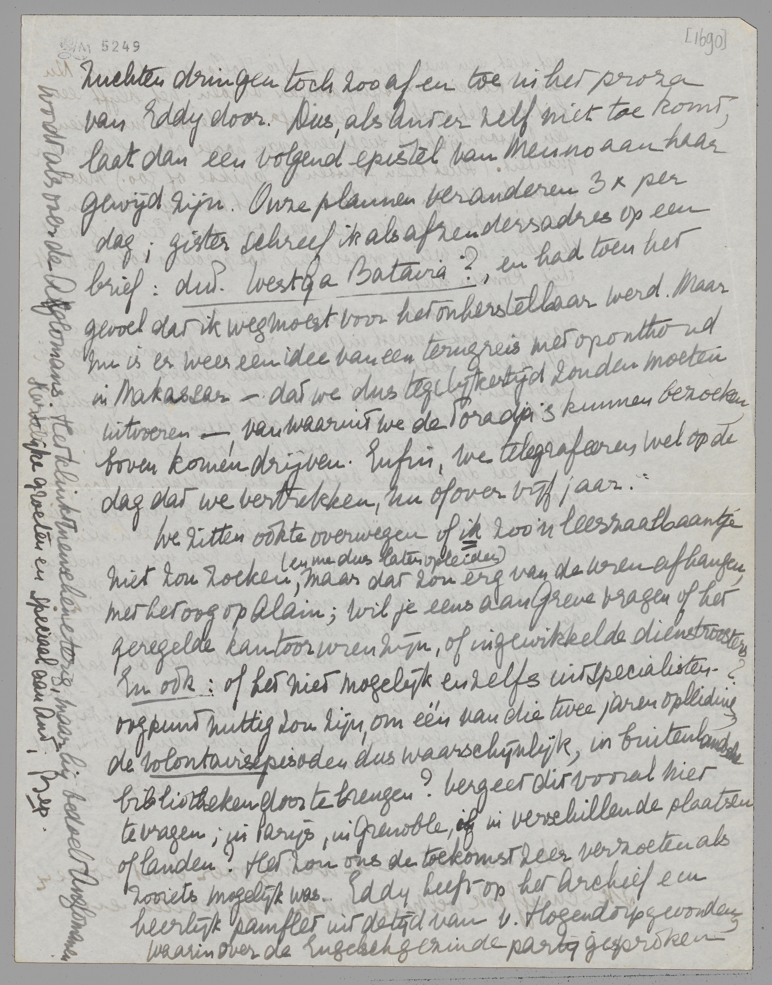 We zitten ook te overwegen of ik zoo'n leeszaalbaantje niet zou zoeken (en me dus laten opleiden), maar dat zou erg van de uren afhangen, met het oog op Alain; wil je eens aan Greve vragen of het geregelde kantooruren zijn of ingewikkelde dienstroosters? En ook: of het niet mogelijk en zelfs uit specialistenoogpunt nuttig zou zijn om één van die twee jaren opleiding, de volontairsepisoden dus waarschijnlijk, in buitenlandsche bibliotheken door te brengen? Vergeet dit vooral niet te vragen; in Parijs, in Grenoble, of in verschillende plaatsen of landen? Het zou ons de toekomst zeer verzoeten als zooiets mogelijk was. Eddy heeft op het Archief een heerlijk pamflet uit de tijd van v. Hogendorp gevonden, waarin over de Engelschgezinde partij gesproken wordt als over de Aglomans. Het klinkt menscheneterig maar hij bedoelt Anglomanen.