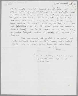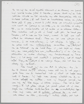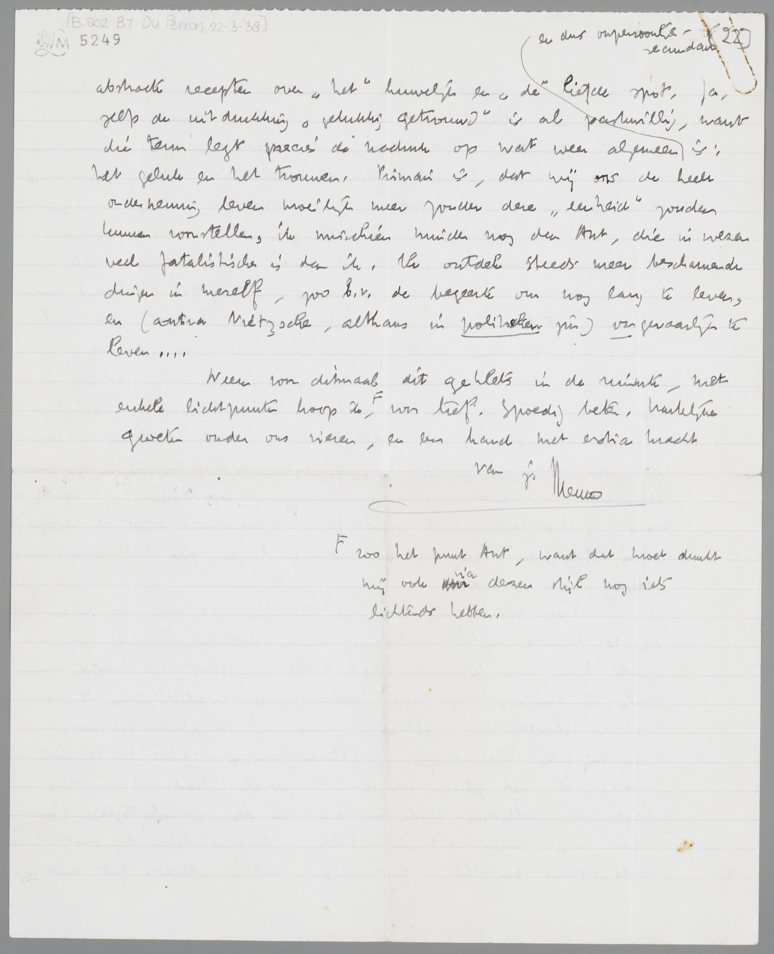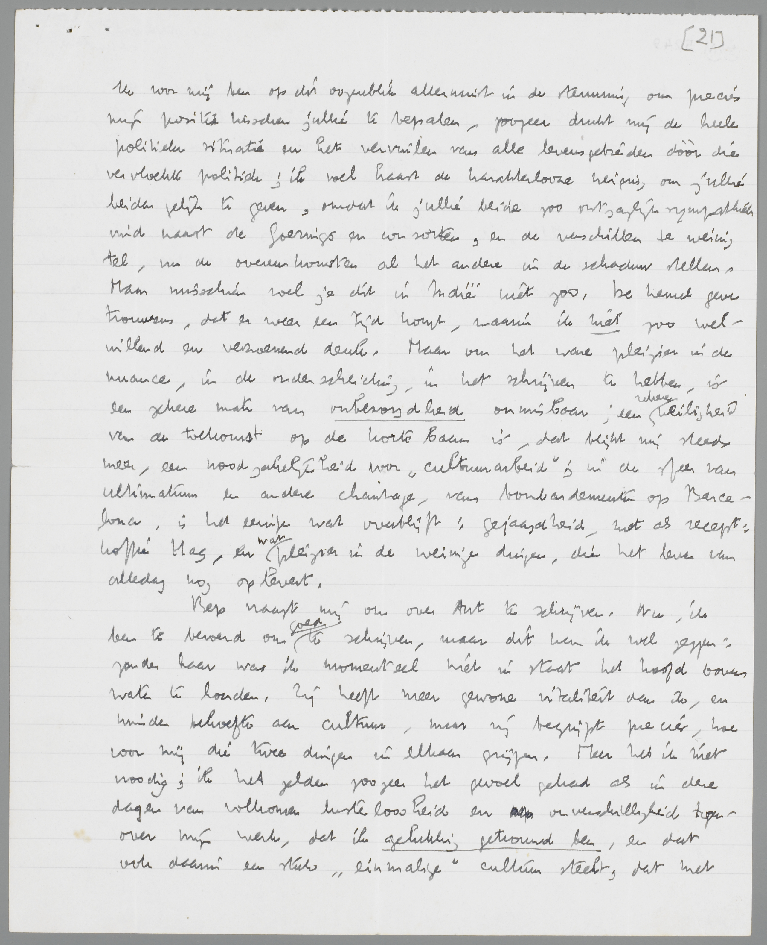 Bep vraagt mij om over Ant te schrijven. Nu, ik ben te beroerd om goed te schrijven, maar dit kan ik wel zeggen: zonder haar was ik momenteel niet in staat het hoofd boven water te houden. Zij heeft meer gewone vitaliteit dan ik, en minder behoefte aan cultuur, maar zij begrijpt precies, hoe voor mij die twee dingen in elkaar grijpen. Meer heb ik niet noodig; ik heb zelden zoozeer het gevoel gehad als in deze dagen van volkomen lusteloosheid en onverschilligheid tegenover mijn werk, dat ik gelukkig getrouwd ben, en dat ook daarin een stuk ‘einmalige’ cultuur steekt, dat met abstracte recepten over ‘het’ huwelijk en ‘de’ liefde spot. Ja, zelfs de uitdrukking ‘gelukkig getrouwd’ is al paskwillig, want die term legt precies de nadruk op wat weer algemeen en dus onpersoonlijk-secundair is: het geluk en het trouwen. Primair is, dat wij ons de heele onderneming leven moeilijk meer zonder deze ‘eenheid’ zouden kunnen voorstellen, ik misschien minder nog dan Ant, die in wezen veel fatalistischer is dan ik. Ik ontdek steeds meer beschamende dingen in mezelf, zoo b.v. de begeerte om nog lang te leven, en (contra Nietzsche, althans in politieken zin) ongevaarlijk te leven. Neem voor ditmaal dit geklets in de ruimte, met enkele lichtpunten hoop ik, zoo het punt Ant, want dat moet dunkt mij ook via dezen stijl nog iets lichtends hebben, voor lief. Spoedig beter. Hartelijke groeten onder ons vieren, en een hand met extra kracht