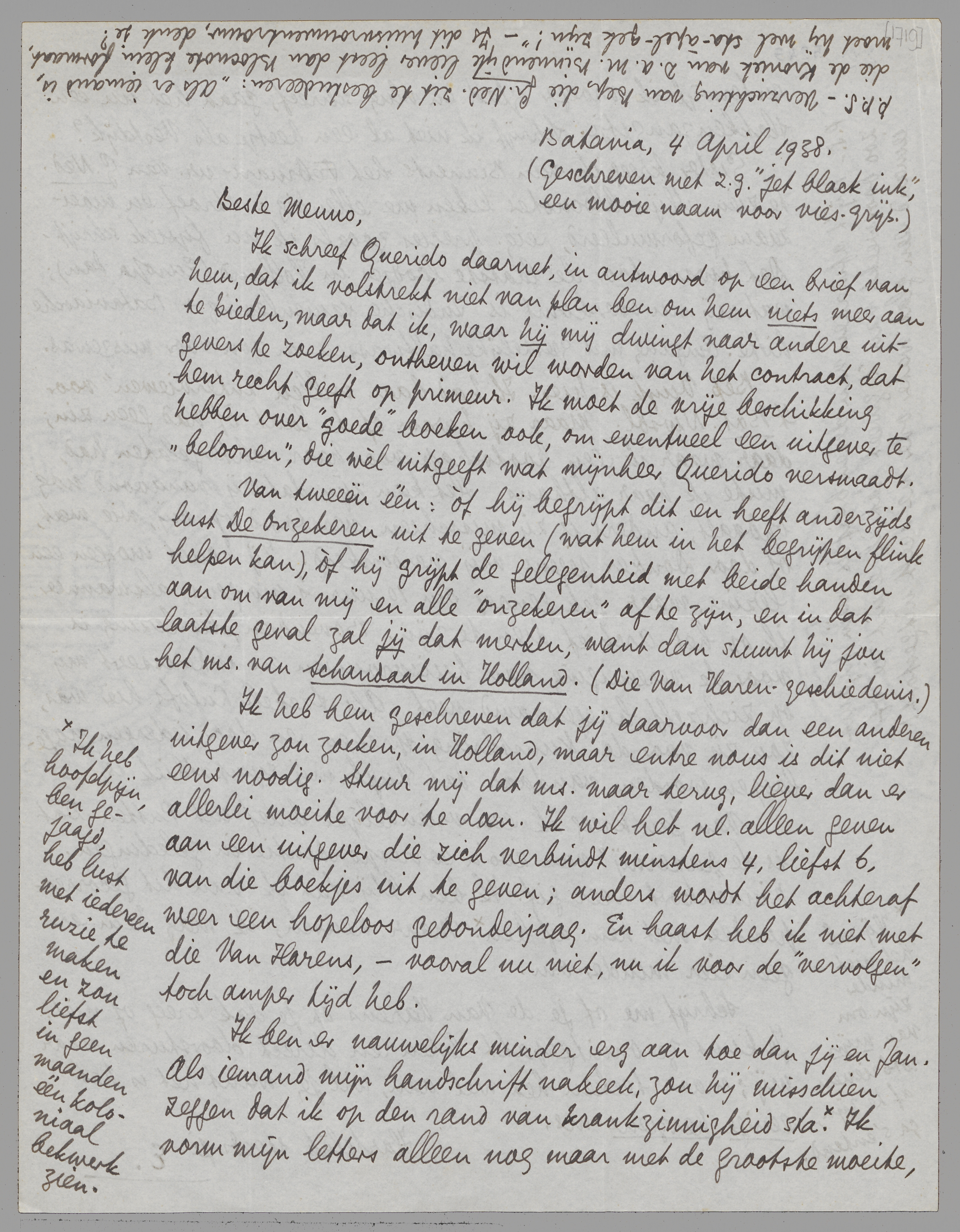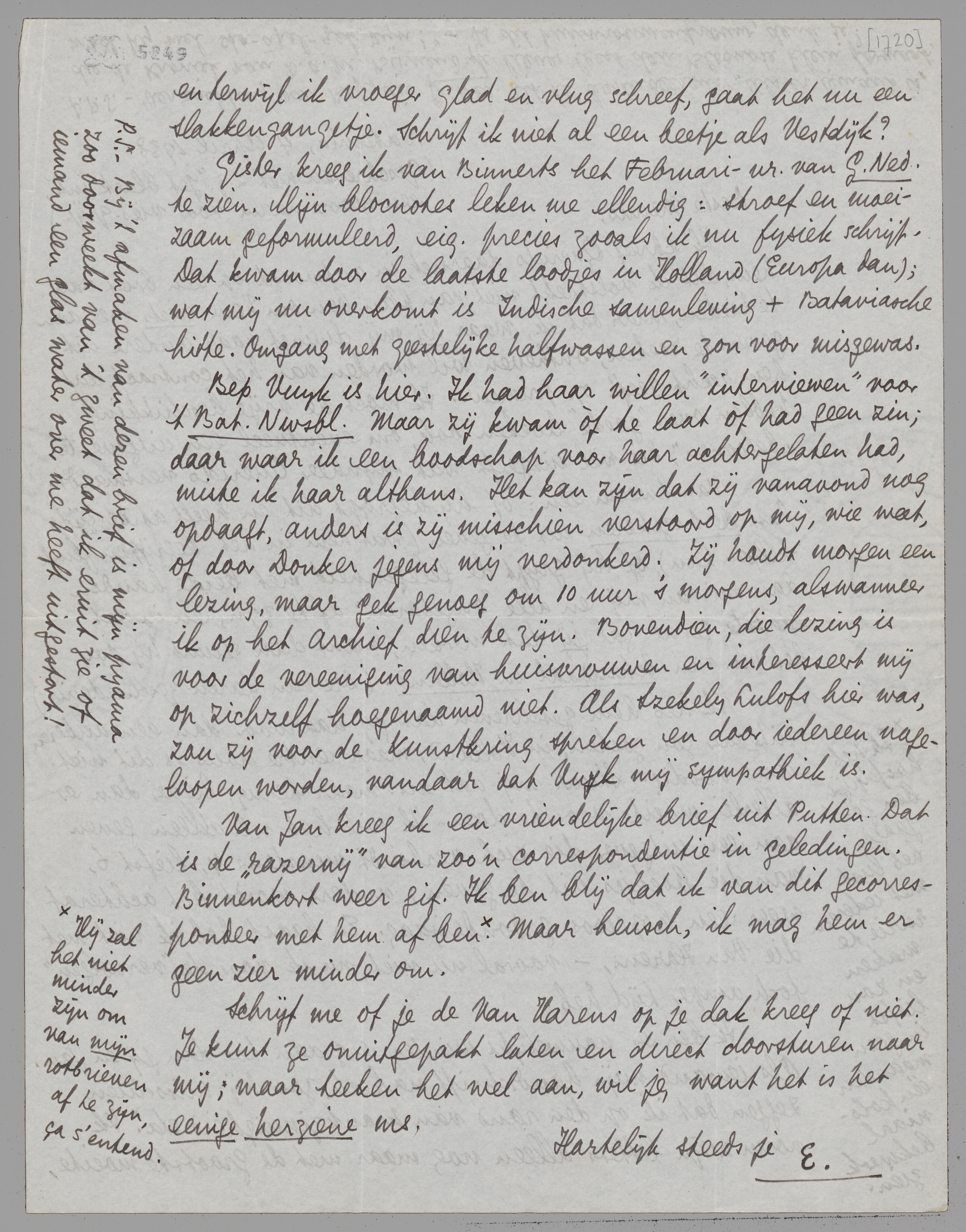 Gister kreeg ik van Binnerts het Februari-nr. van G. Ned. te zien. Mijn blocnotes leken me ellendig: stroef en moeizaam geformuleerd, eig. precies zooals ik nu fysiek schrijf. Dat kwam door de laatste loodjes in Holland (Europa dan); wat mij nu overkomt is Indische samenleving + Bataviasche hitte. Omgang met geestelijke halfwassen en zon voor misgewas.