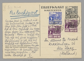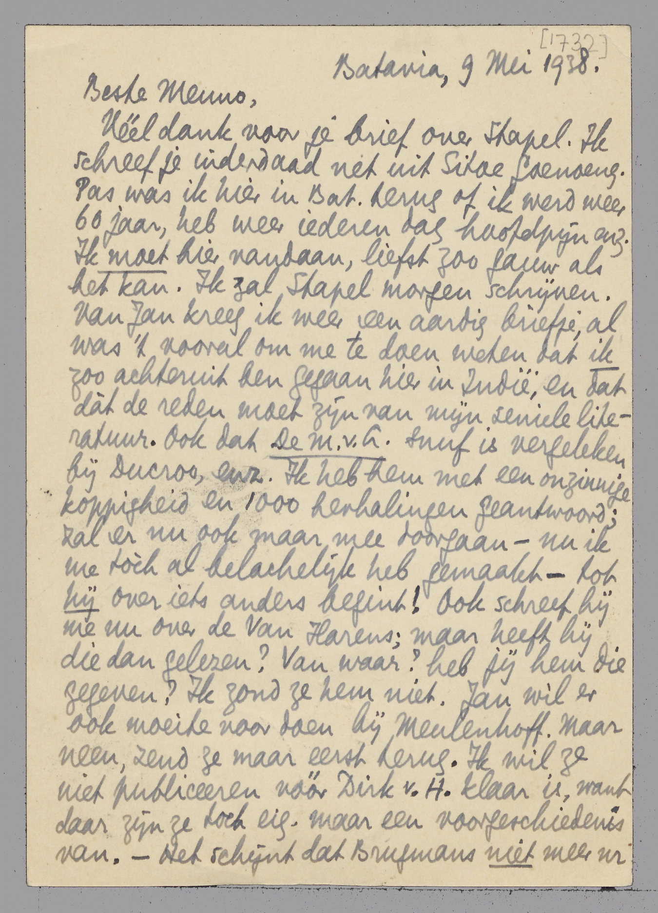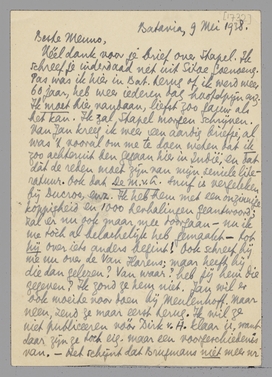 Véél dank voor je brief over Stapel. Ik schreef je inderdaad net uit Sitoe Goenoeng. Pas was ik hier in Bat. terug of ik werd weer 60 jaar, heb weer iederen dag hoofdpijn enz. Ik moet hier vandaan, liefst zoo gauw als het kan. Ik zal Stapel morgen schrijven. Van Jan kreeg ik weer een aardig briefje, al was 't vooral om me te doen weten dat ik zoo achteruit ben gegaan hier in Indië, en dat dàt de reden moet zijn van mijn seniele literatuur. Ook dat De M.v.L. snuf is vergeleken bij Ducroo, enz. Ik heb hem met een onzinnige koppigheid en 1000 herhalingen geantwoord; zal er nu ook maar mee doorgaan - nu ik me tòch al belachelijk heb gemaakt - tot hij over iets anders begint! Ook schreef hij me nu over de Van Harens; maar heeft hij die dan gelezen? Van waar? heb jij hem die gegeven? Ik zond ze hem niet. Jan wil er ook moeite voor doen bij Meulenhoff. Maar neen, zend ze maar eerst terug. Ik wil ze niet publiceeren vóór Dirk v.H. klaar is, want daar zijn ze toch eig. maar een voorgeschiedenis van. - Het schijnt dat Brugmans niet meer nr Europa gaat in verband met die universiteit, omdat er opeens weer geen geld is! Toch heb ik hem opgebeld en voor een dezer dagen een afspraak gemaakt. Maar... wil jij hier zijn als wij juist weggaan? Het klimaat is zóó, dat wij werkelijk uit lijfsbehoud over een jaar maximum weg moeten - de granaten tegemoet dan, misschien. - Tot nader. Hartelijk je