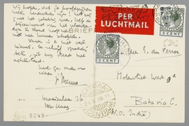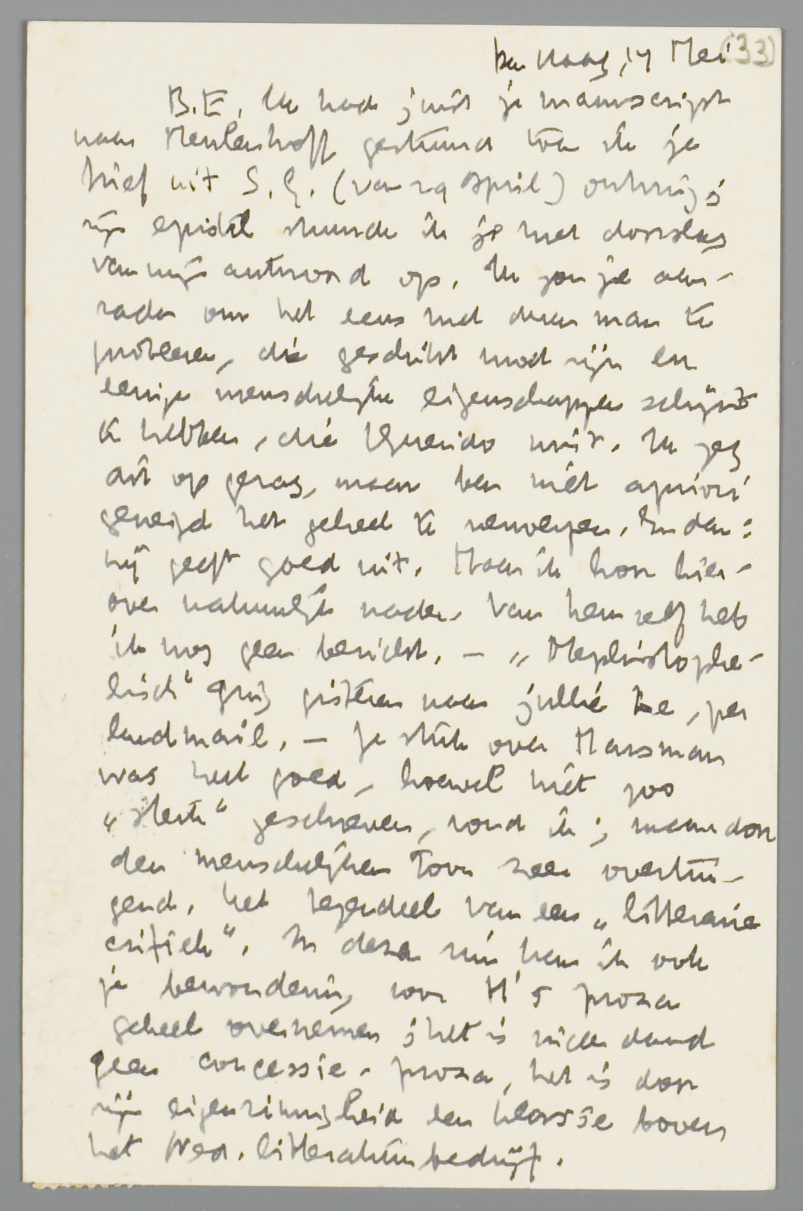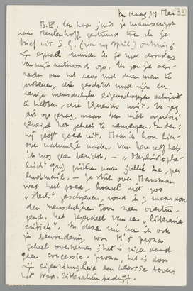 Ik had juist je manuscript naar Meulenhoff gestuurd toen ik je brief uit S.G. (van 29 April) ontving; zijn epistel stuurde ik je met doorslag van mijn antwoord op. Ik zou je aanraden om het eens met dezen man te probeeren, die geschikt moet zijn en eenige menschelijke eigenschappen schijnt te hebben, die Querido mist. Ik zeg dit op gezag, maar ben niet apriori geneigd het geheel te verwerpen. En dan: hij geeft goed uit. Maar ik hoor hierover natuurlijk nader. Van hem zelf heb ik nog geen bericht. - Mephistophelisch ging gisteren naar jullie toe, per landmail. Je stuk over Marsman was heel goed, hoewel niet zoo ‘sterk’ geschreven, vond ik; maar door den menschelijken toon zeer overtuigend. Het tegendeel van een ‘litteraire critiek’. In dezen zin kan ik ook je bewondering voor M.'s proza geheel overnemen; het is inderdaad geen concessie-proza, het is door zijn eigenzinnigheid een klasse boven het Ned. litteratuurbedrijf.