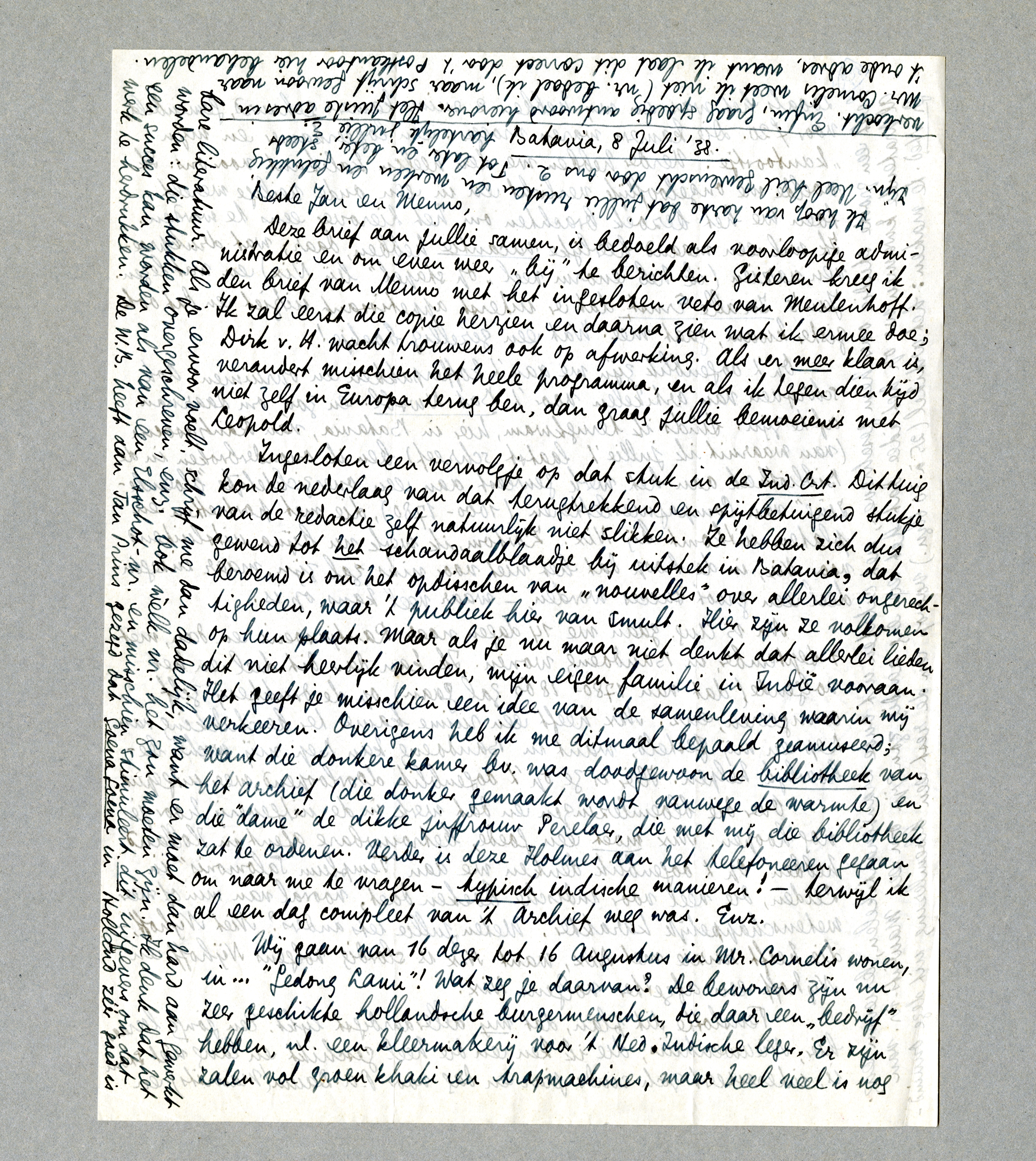 Op 't oogenblik zijn we aan 't kofferpakken en opruimen. Ook schrijven van artikelen voor 't Bat. Nwsbl. en zoo, om daarvan af te zijn. Sinds ik terugkwam, hier in Batavia, van Rantjasoeni (van waaruit ik jullie 't laatst schreef) ben ik ononderbroken in de Bibliotheek aan het werk geweest aan een overzichtelijke ‘bloemlezing’ van Compagniesletteren (1600-1780), die met portretten en platen uitkomt bij Nix. Kortom, ik werk nu bijna uitsluitend voor Nix, in de hoop dat het niet voor niks zal zijn, maar integendeel een groot succes worden, - waar veel kans op is.