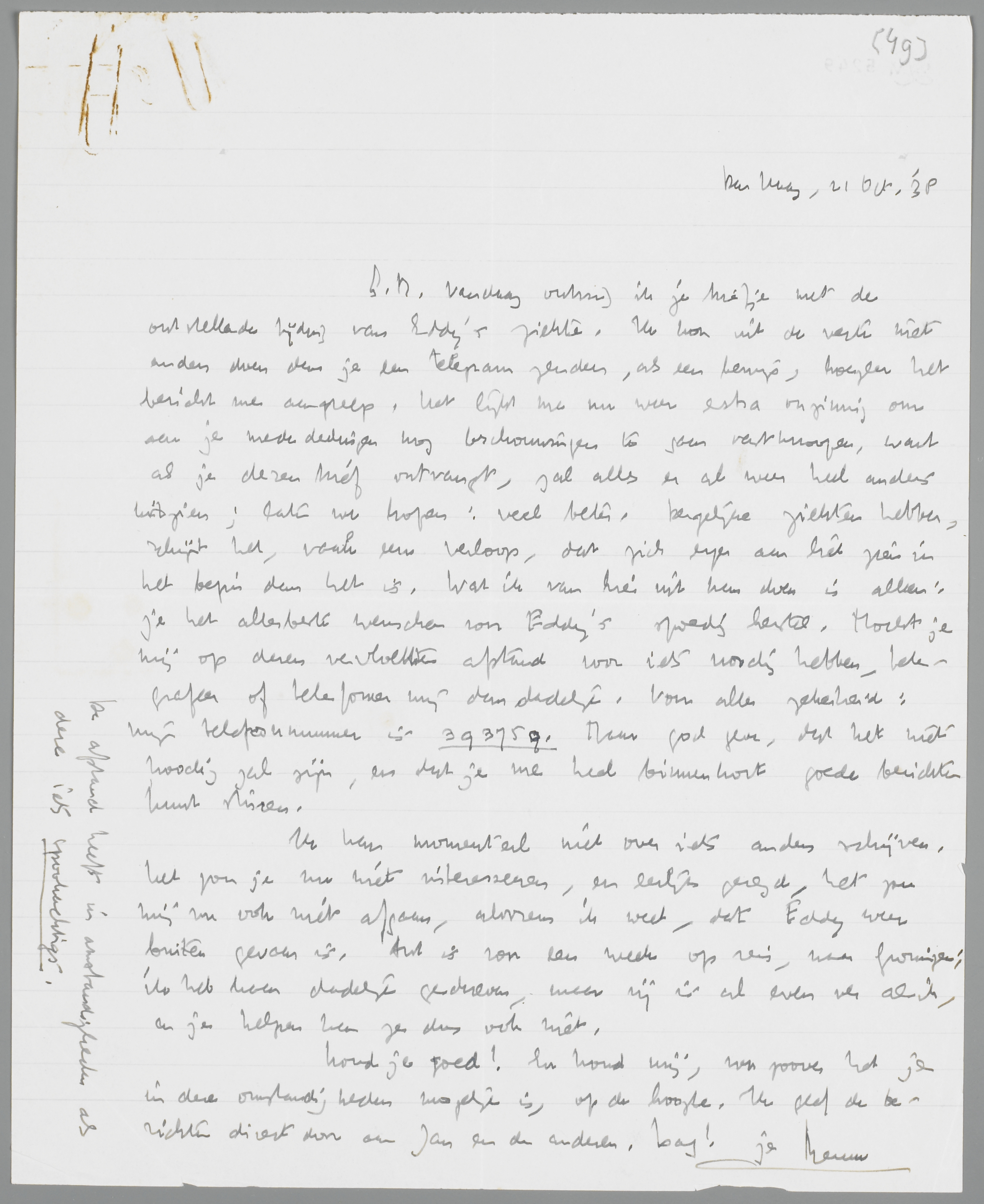 Ik kan momenteel niet over iets anders schrijven. Het zou je nu niet interesseeren, en eerlijk gezegd, het zou mij nu ook niet afgaan, alvorens ik weet, dat Eddy weer buiten gevaar is. Ant is voor een week op reis, naar Groningen; ik heb haar dadelijk geschreven, maar zij is al even ver als ik, en je helpen kan ze dus ook niet.