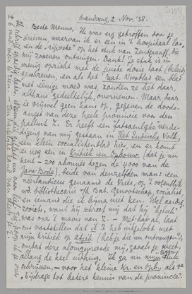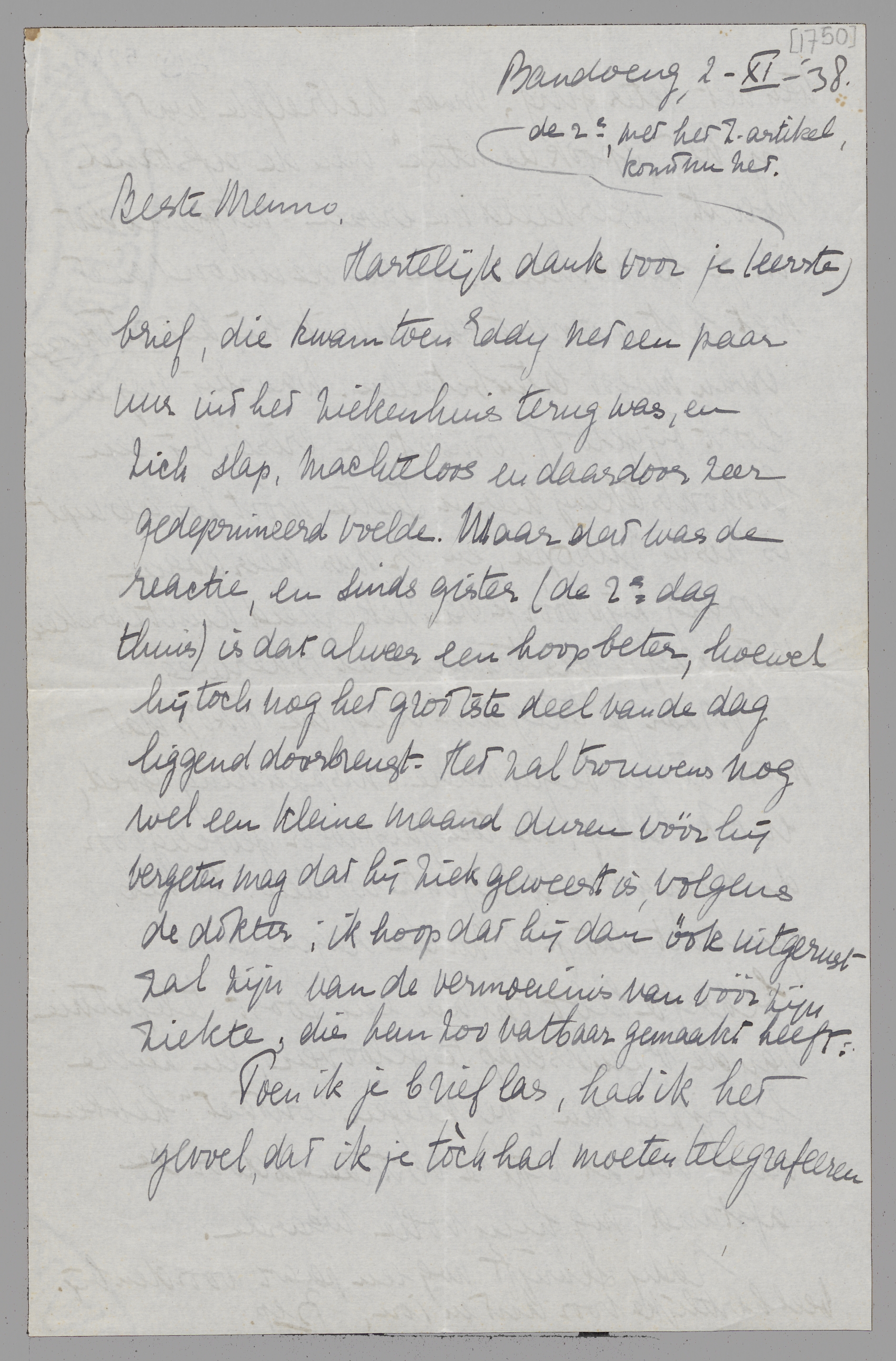 Hartelijk dank voor je (eerste, de 2e met het Z. artikel komt nu net.) brief, die kwam toen Eddy net een paar uur uit het ziekenhuis terug was, en zich slap, machteloos en daardoor zeer gedeprimeerd voelde. Maar dat was de reactie, en sinds gister (de 2e dag thuis) is dat alweer een hoop beter, hoewel hij toch nog het grootste deel van de dag liggend doorbrengt. Het zal trouwens nog wel een kleine maand duren vóór hij vergeten mag dat hij ziek geweest is, volgens de dokter; ik hoop dat hij dan óók uitgerust zal zijn van de vermoeienis van vóór zijn ziekte, die hem zoo vatbaar gemaakt heeft.