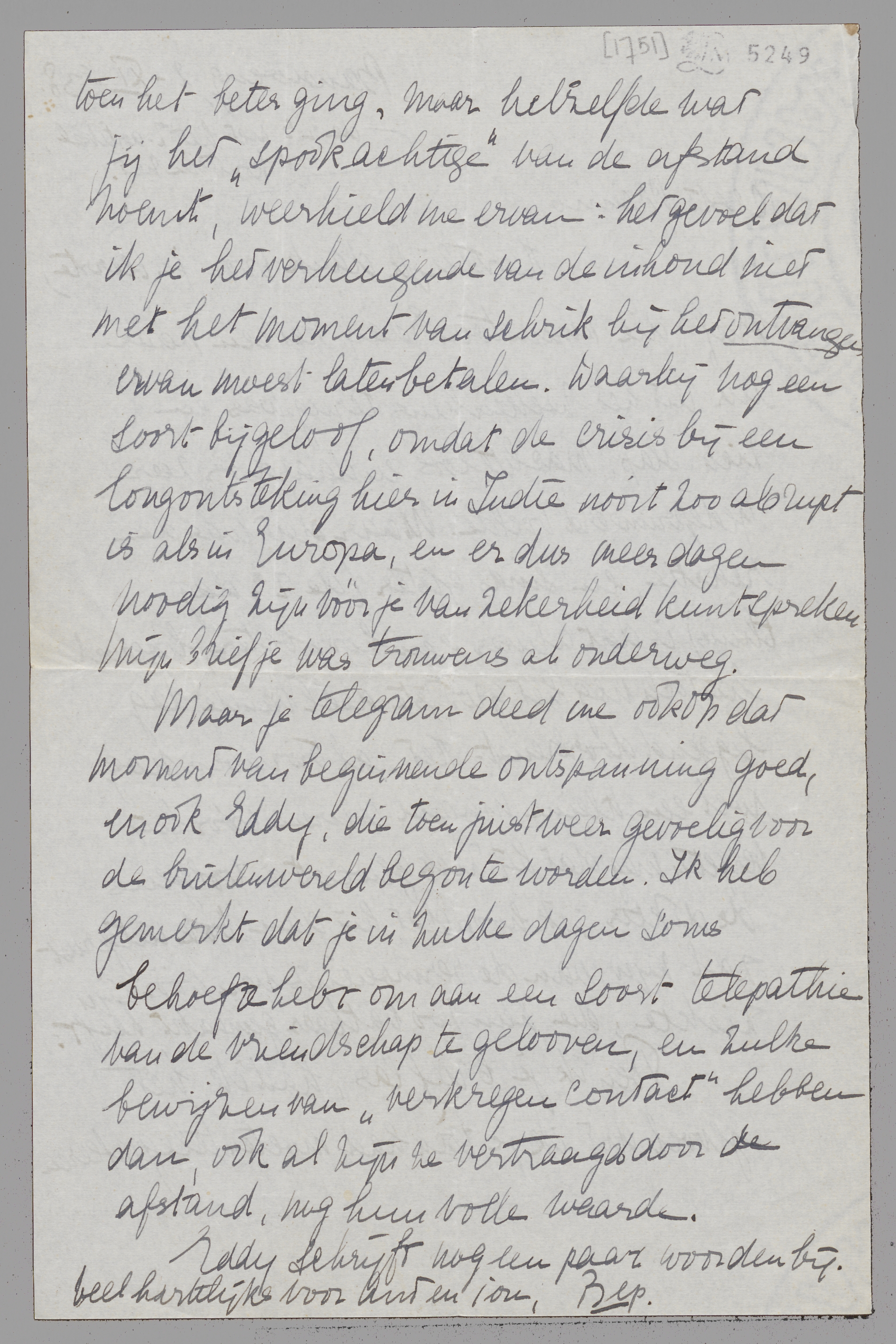 Maar je telegram deed me ook op dat moment van beginnende ontspanning goed, en ook Eddy, die toen juist weer gevoelig voor de buitenwereld begon te worden. Ik heb gemerkt dat je in zulke dagen soms behoefte hebt om aan een soort telepathie van de vriendschap te gelooven, en zulke bewijzen van ‘verkregen contact’ hebben dan, ook al zijn ze vertraagd door de afstand, nog hun volle waarde.