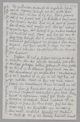 Ik stuur je binnenkort een bundel oud-jav. wijsheid (vertaald natuurlijk), een soort ‘levenskunst’ in aforismen, nogal gek. Verder een herziene, verbeterde Levet (inplaats v/h ex. dat je in Juan-les-Pins kreeg, geef dat dan maar weg); en tenslotte een verrassing. Dan wschl., eindelijk, Sprookje v/d Misdaad en Mult. II. Als je dit laatste bespreekt, vermeld er dan bij dat de exx. voor Holland te krijgen zijn bij ‘Templum Salomonis’, Leiden. Ik schrijf spoedig beter. Neem dit geklets nu voor lief. Eig. hoop ik je over ± 6 mnd. weer te zien. - Een hartelijke hand van steeds je