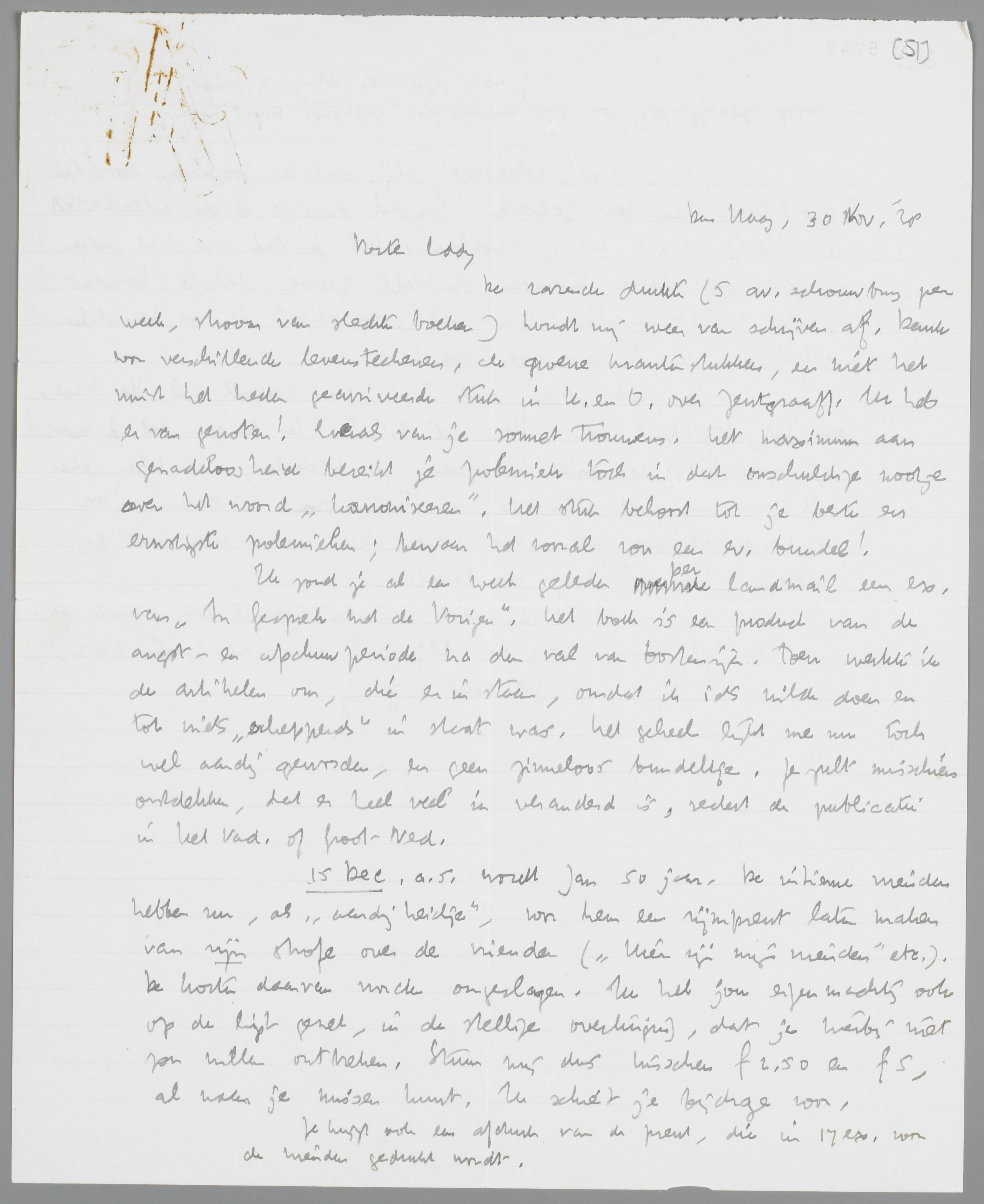 De razende drukte (5 av. schouwburg per week, stroom van slechte boeken) houdt mij weer van schrijven af. Dank voor verschillende levensteekenen, de groene krantenstukken, en niet het minst het heden gearriveerde stuk in K. en O. over Zentgraaff. Ik heb er van genoten! Evenals van je sonnet trouwens. Het maximum aan genadeloosheid bereikt je polemiek toch in dat onschuldige nootje over het woord ‘kanoniseeren’. Het stuk behoort tot je beste en ernstigste polemieken; bewaar het vooral voor een ev. bundel!