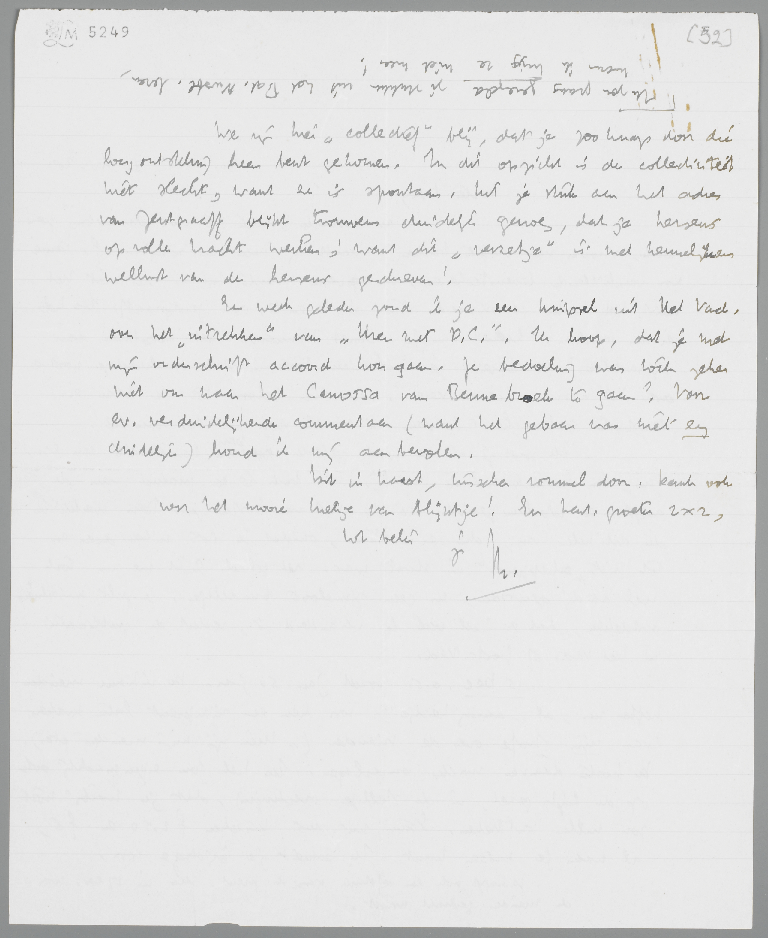We zijn hier ‘collectief’ blij, dat je zoo knap door die longontsteking heen bent gekomen. In dit opzicht is de collectiviteit niet slecht, want ze is spontaan. Uit je stuk aan het adres van Zentgraaff blijkt trouwens duidelijk genoeg, dat je hersens op volle kracht werken; want dit ‘verzetje’ is met kennelijken wellust van de hersens geschreven!
