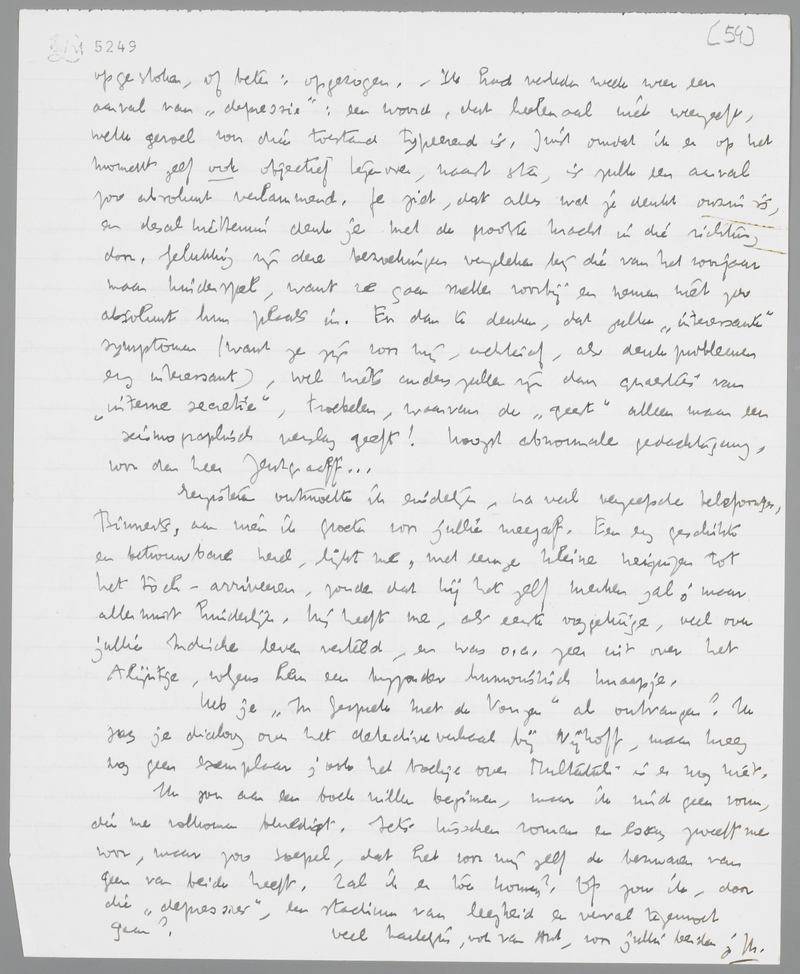 Schrijf vooral over het laatste boek van Henri Bruning, Verworpen Christendom. Het bevat o.m. een prachtig stuk tegen Van Duinkerken, dat jou stellig ook zal pleizieren. - Verder zou ik je willen aanraden (hoewel het aanraden van boeken altijd dwaas is, omdat iedereen zijn eigen leesrhythme heeft) de brieven van Jacob Burckhardt te bestellen (uitgave Kaphahn, verschenen bij de Dieterische Verlagbuchhandlung te Leipzig; editie ongeveer zooals die van de brieven van Nietzsche, kost ± 3 gulden). Ik heb daarvan de laatste dagen genoten. Deze mentaliteit van den werkelijk met cultuur behepten geleerde is mij in dezen tijd (dien hij voorspelt) een soortement troost. De toon is uitstekend, en bovendien onthullend t.o.v. Nietzsche, die veel van hem moet hebben opgestoken, of beter: opgezogen. - Ik had verleden week weer een aanval van ‘depressie’: een woord, dat heelemaal niet weergeeft, welk gevoel voor dien toestand typeerend is. Juist omdat ik er op het moment zelf ook objectief tegenover, naast sta, is zulk een aanval zoo absoluut verlammend. Je ziet, dat alles wat je denkt onzin is, en desalniettemin denk je met de grootste kracht in die richting door. Gelukkig zijn deze bezoekingen vergeleken bij die van het voorjaar maar kinderspel, want ze gaan sneller voorbij en nemen niet zoo absoluut hun plaats in. En dan te denken, dat zulke ‘interessante’ symptomen (want ze zijn voor mij, achteraf, als denkproblemen erg interessant), wel niets anders zullen zijn dan quaesties van ‘interne secretie’, troebelen, waarvan de ‘geest’ alleen maar een seismographisch verslag geeft! Hoogst abnormale gedachtengang, voor den heer Zentgraaff...