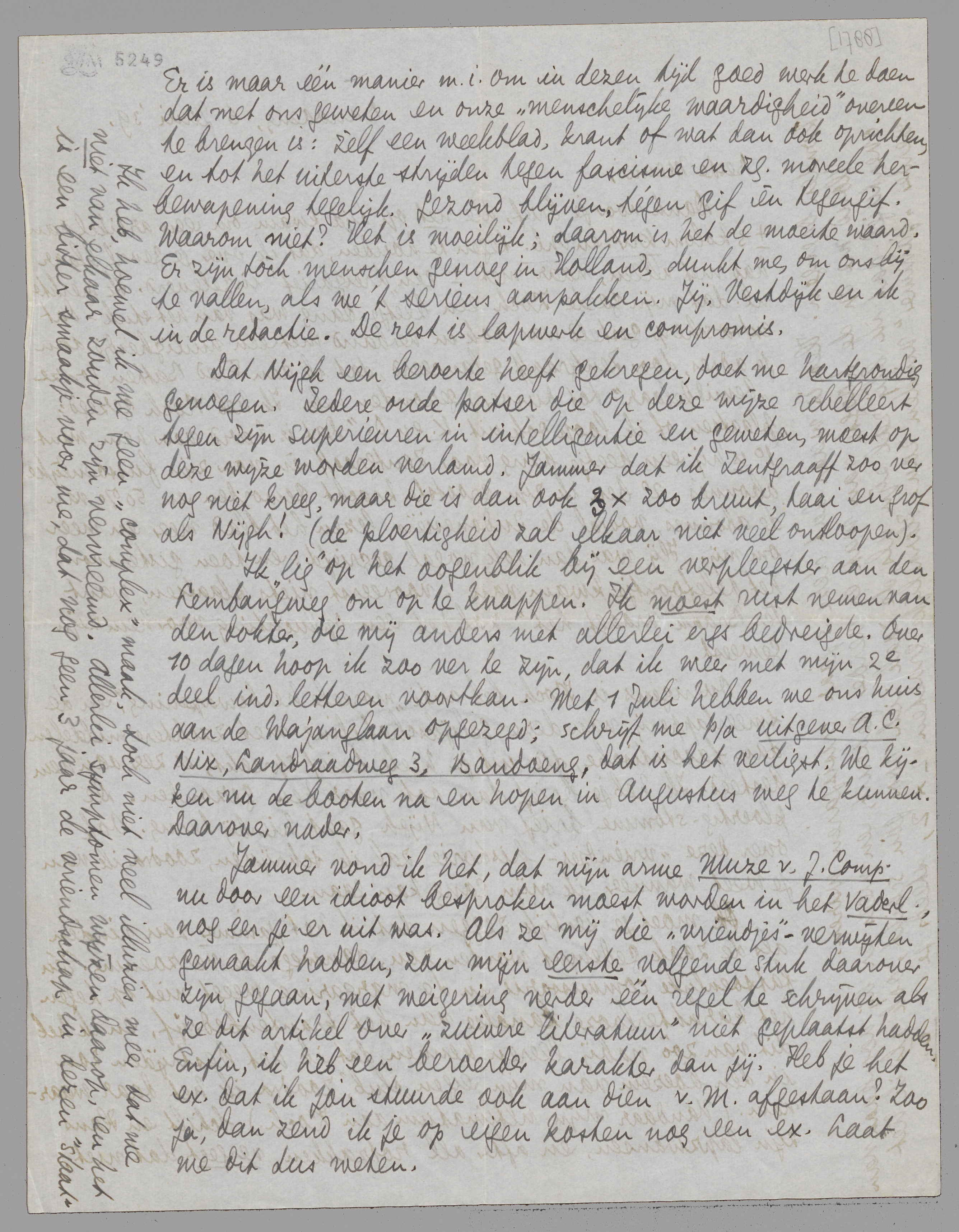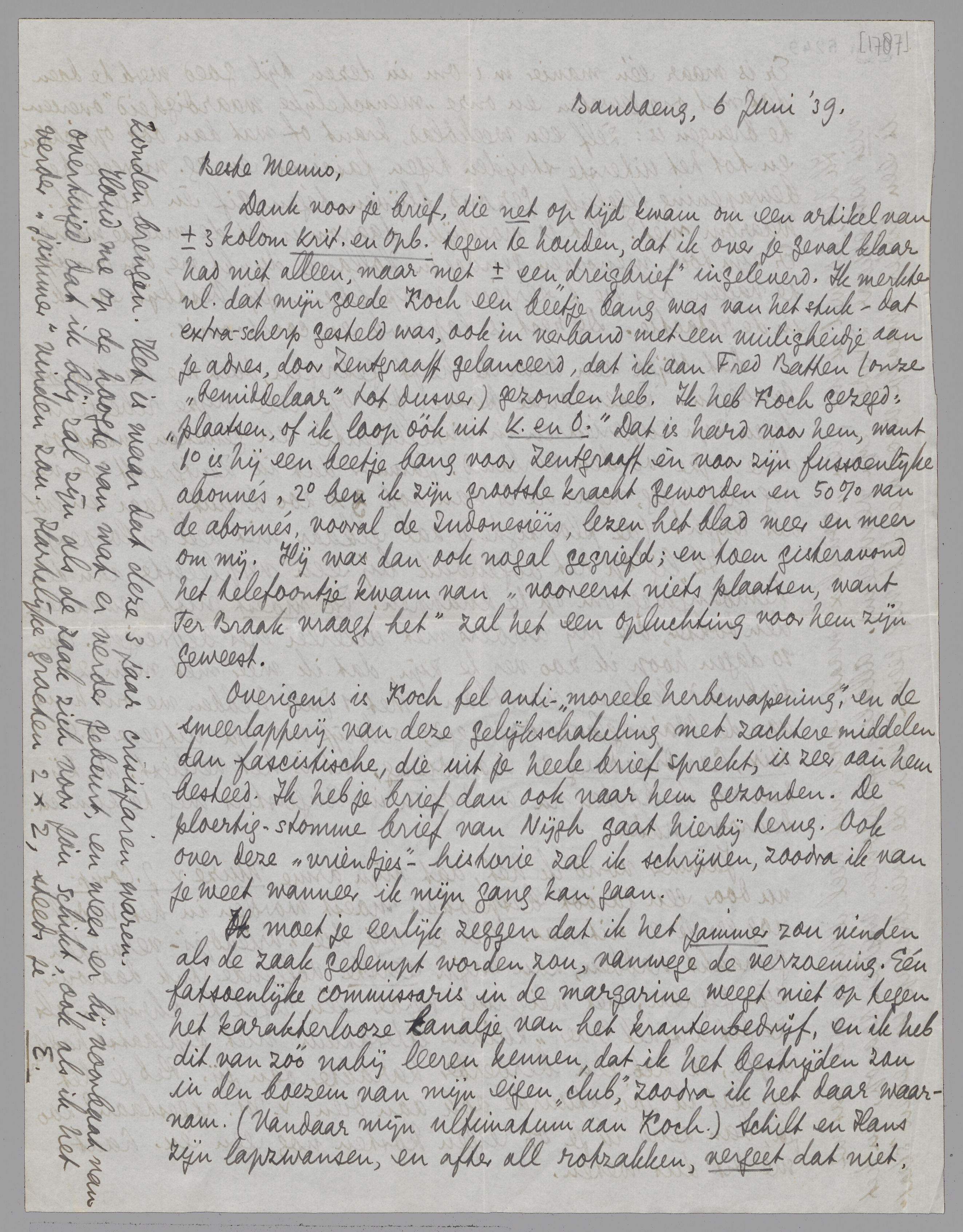 Overigens is Koch fel anti-‘moreele herbewapening’, en de smeerlapperij van deze gelijkschakeling met zachtere middelen dan fascistische, die uit je heele brief spreekt, is zeer aan hem besteed. Ik heb je brief dan ook naar hem gezonden. De ploertigstomme brief van Nijgh gaat hierbij terug. Ook over deze ‘vriendjes’-historie zal ik schrijven, zoodra ik van je weet wanneer ik mijn gang kan gaan.