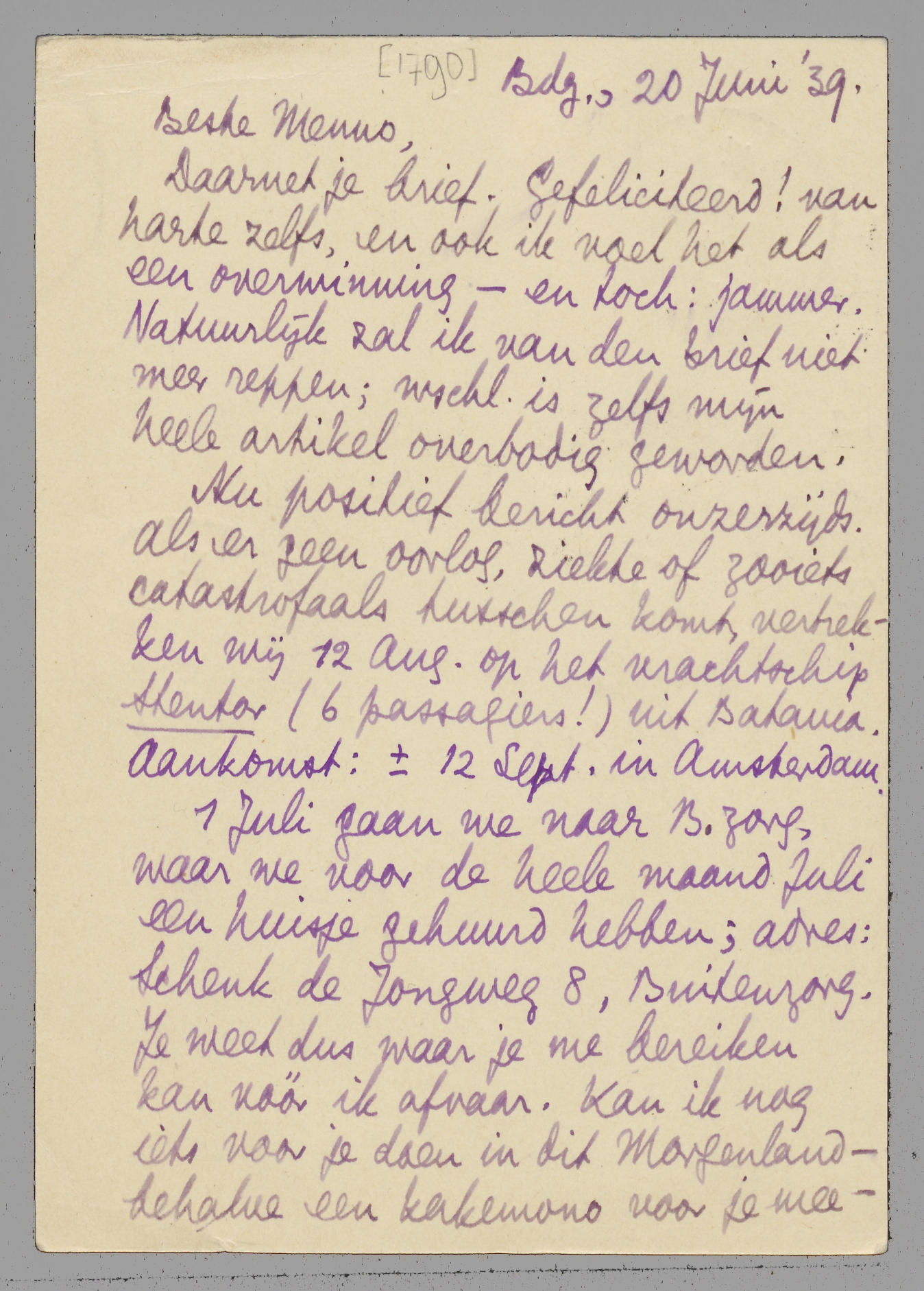 1 Juli gaan we naar B. zorg, waar we voor de heele maand Juli een huisje gehuurd hebben; adres: Schenk de Jongweg 8, Buitenzorg. Je weet dus waar je me bereiken kan vóór ik afvaar. Kan ik nog iets voor je doen in dit Morgenland - behalve een kakemono voor je meebrengen? - Maak je ook eens plannetjes van samenwerking of zoo, na mijn terugkeer?