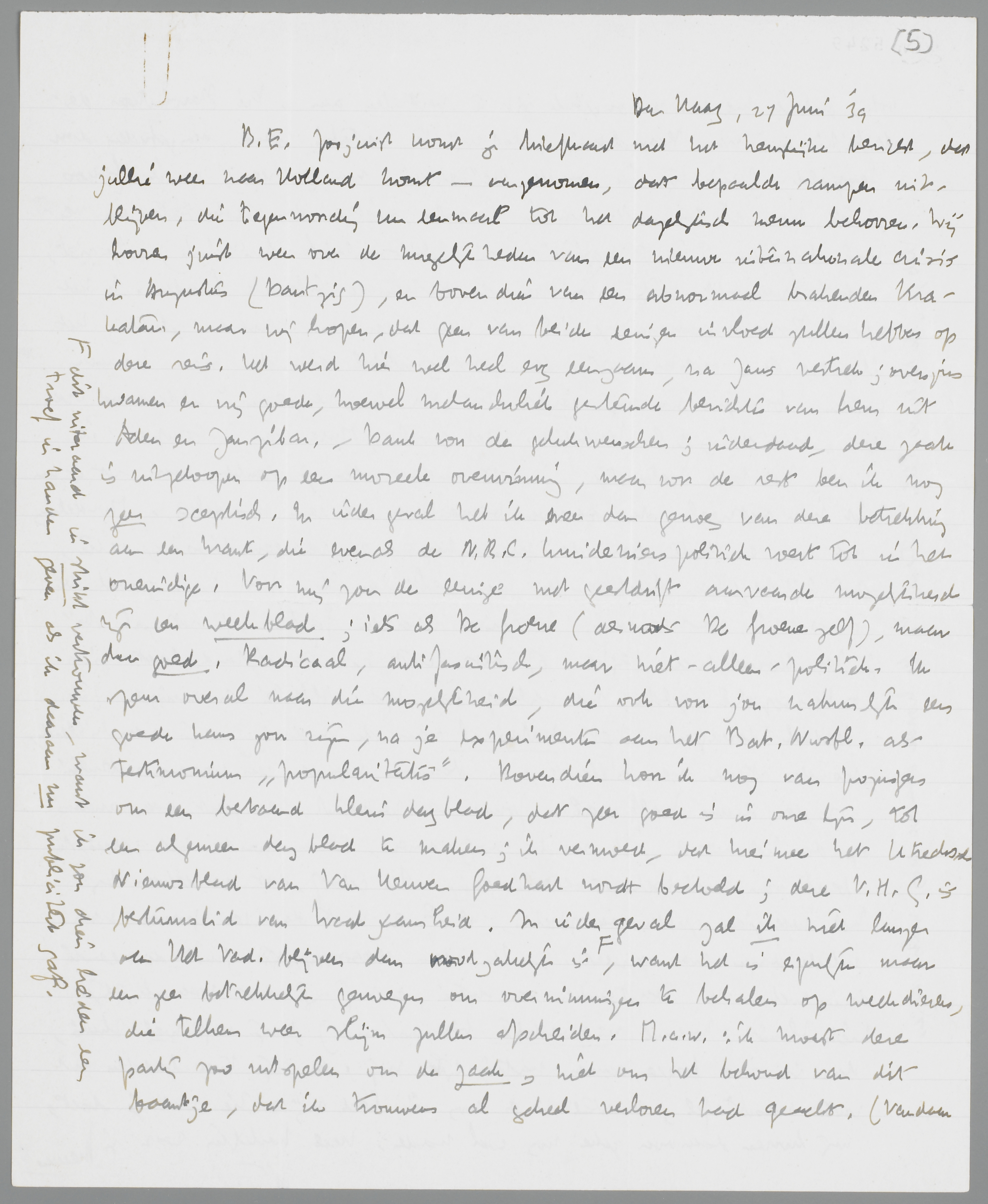 Zoojuist komt je briefkaart met het heuglijke bericht, dat jullie weer naar Holland komt - aangenomen, dat bepaalde rampen uitblijven, die tegenwoordig nu eenmaal tot het dagelijksch menu behooren. Wij hooren juist weer over de mogelijkheden van een nieuwe internationale crisis in Augustus (Dantzig), en bovendien van een abnormaal brakenden Krakatau, maar wij hopen, dat geen van beide eenigen invloed zullen hebben op deze reis. Het werd hier wel heel erg eenzaam, na Jans vertrek; overigens kwamen er vrij goede, hoewel melancholiek gestemde berichten van hem uit Aden en Zanzibar. - Dank voor de gelukwenschen; inderdaad, deze zaak is uitgeloopen op een moreele overwinning, maar voor de rest ben ik nog zeer sceptisch. In ieder geval heb ik meer dan genoeg van deze betrekking aan een krant, die evenals de N.R.C. kruidenierspolitiek voert tot in het oneindige. Voor mij zou de eenige met geestdrift aanvaarde mogelijkheid zijn een weekblad; iets als De Groene (desnoods De Groene zelf), maar dan goed. Radicaal, antifascistich, maar niet-alleen-politiek. Ik speur overal naar die mogelijkheid, die ook voor jou natuurlijk een goede kans zou zijn, na je experimenten aan het Bat. Nwsbl. als testimonium ‘popularitatis’. Bovendien hoor ik nog van pogingen om een bestaand klein dagblad, dat zeer goed is in onze lijn, tot een algemeen dagblad te maken; ik vermoed, dat hiermee het Utrechtsch Nieuwsblad van Van Heuven Goedhart wordt bedoeld; deze V.H.G. is bestuurslid van Waakzaamheid. In ieder geval zal ik niet langer aan Het Vad. blijven dan noodzakelijk is, [dit uiteraard in strikt vertrouwen, want ik zou dien lieden een troef in handen geven als ik daaraan nu publiciteit gaf,] want het is eigenlijk maar een zeer betrekkelijk genoegen om overwinningen te behalen op weekdieren, die telkens weer slijm zullen afscheiden. M.a.w.: ik moest deze partij zoo uitspelen om de zaak, niet om het behoud van dit baantje, dat ik trouwens al geheel verloren had geacht. (Vandaar ook, dat ik me nu een ongeluk zit te vertalen aan Die Revolution des Nihilismus van Rauschning, dat mij ter vertaling werd aangeboden door Leopold, juist toen ik zonder betrekking was (scheen) en ik ƒ400 niet kon afslaan. Nu kan ik Leopold niet in den steek laten en vertaal dagelijks 5 à 8 pagina's vrij philosophisch duitsch!). Je ziet, ook ik verwacht niets meer van de bestaande liberale bladen. In het geval Romein gedragen ze zich ook weer meer dan beroerd; gelukkig heb ik, na de ‘overwinning’, een Zondagsartikel aan den man kunnen wijden. Overigens was mijn eerste stuk na de ‘verzoening’ inderdaad over een ‘vriend’, n.l. Vestdijk. Het geval Muze van J. Comp. (ik kreeg het boek natuurlijk!) zit anders dan je denkt, maar het is nu niet meer actueel, dus daarover binnenkort wel eens mondeling. Mondeling ook meer en beter over de vriendschaps- en ‘vervreemdings’-quaestie, die jij blijkbaar heel anders aanvoelt dan ik. Voor mijn gevoel bestaat die vervreemding in zuiver uiterlijke factoren; het zal bij je terugkomst wel blijken, of dat juist is. De afstand laat zich onherroepelijk gelden, na verloop van tijd. Allerlei ervaringen (ik bedoel doodgewoon het materiaal van de omgeving) zijn verschillend, worden steeds verschillender, en daarom wordt een correspondentie op den duur half werk. Jouw temperament reageert daar anders op dan het mijne; ik word zwijgzamer, maar zonder het geringste besef van vriendschapsvermindering. Ik geloof, dat we elkaar bij het weerzien zullen aanspreken, alsof er niets dan een pauze van enkele dagen was geweest. - Ik neem juist de eerste drie weken van September vacantie, en wij zijn dus waarschijnlijk niet thuis (hoewel vermoedelijk binnenslands); zijn wij wel thuis, dan is onze logeerkamer natuurlijk vrij; er zijn twee bedden met vaste waschtafel, meestal is er nog één bed vrij. Zie wat je doet, wij hooren daarover zeker nog wel nader. Veel hartelijks 2 × 2