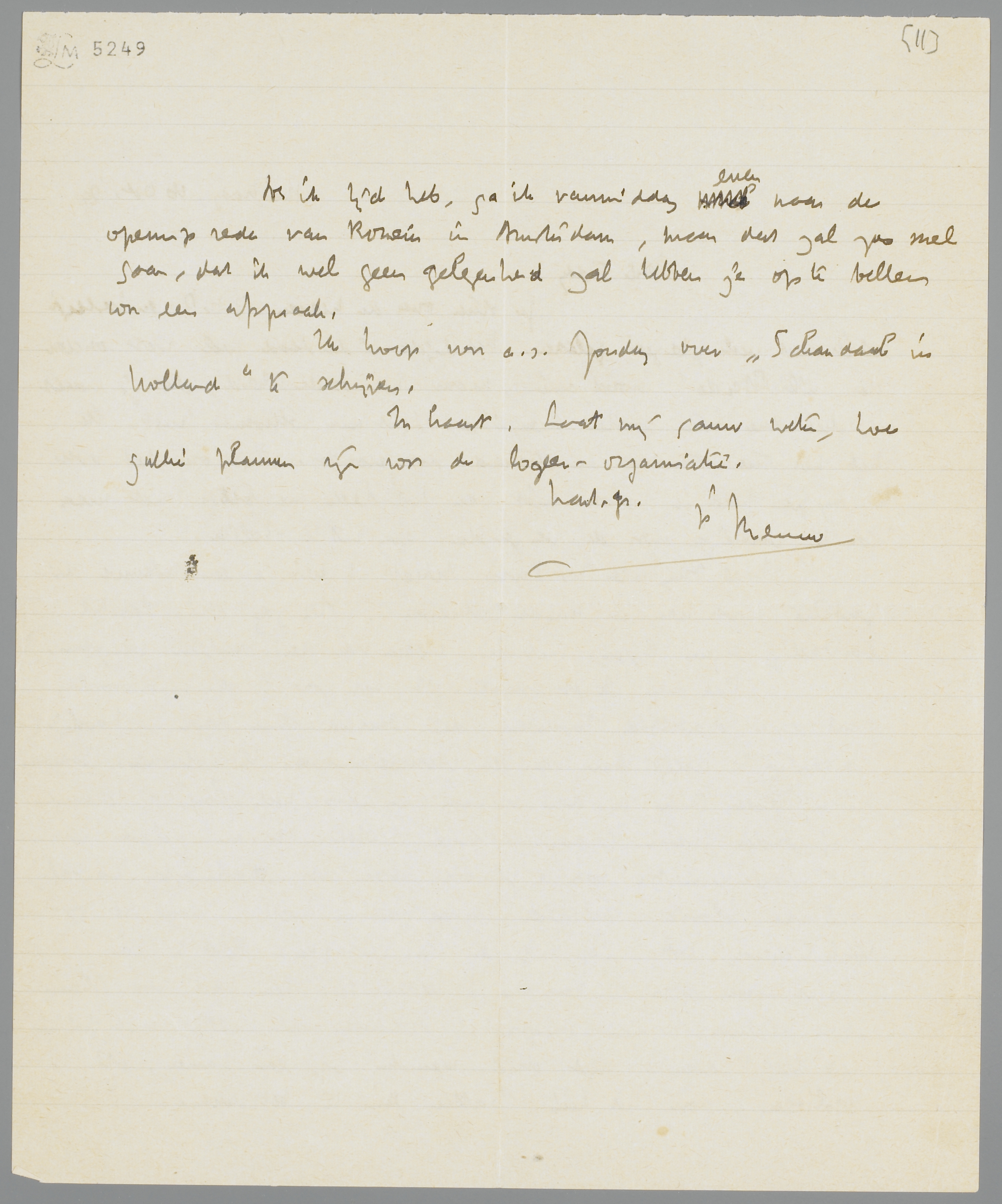 Als ik tijd heb, ga ik vanmiddag even naar de openingsrede van Romein in Amsterdam, maar dat zal zoo snel gaan, dat ik wel geen gelegenheid zal hebben je op te bellen voor een afspraak. Ik hoop voor a.s. Zondag over Schandaal in Holland te schrijven. In haast. Laat mij gauw weten, hoe jullie plannen zijn voor de logeer-organisatie.